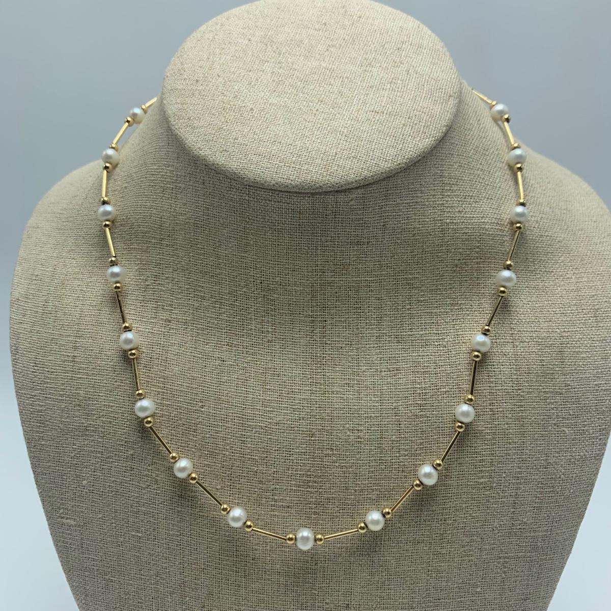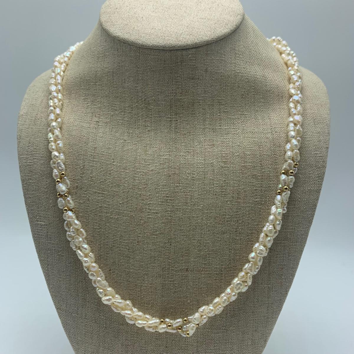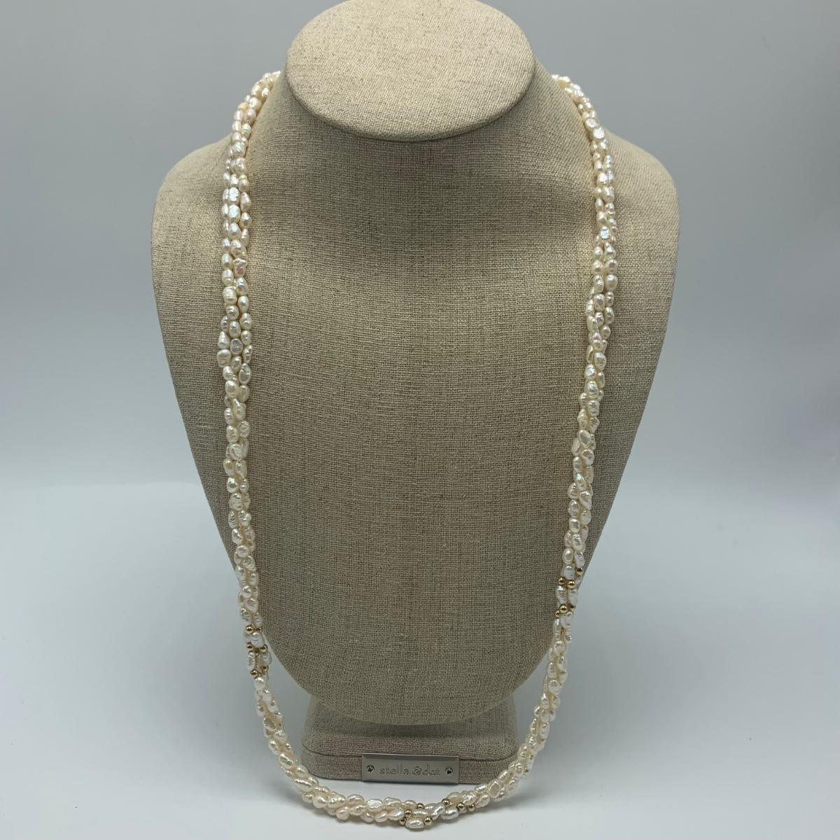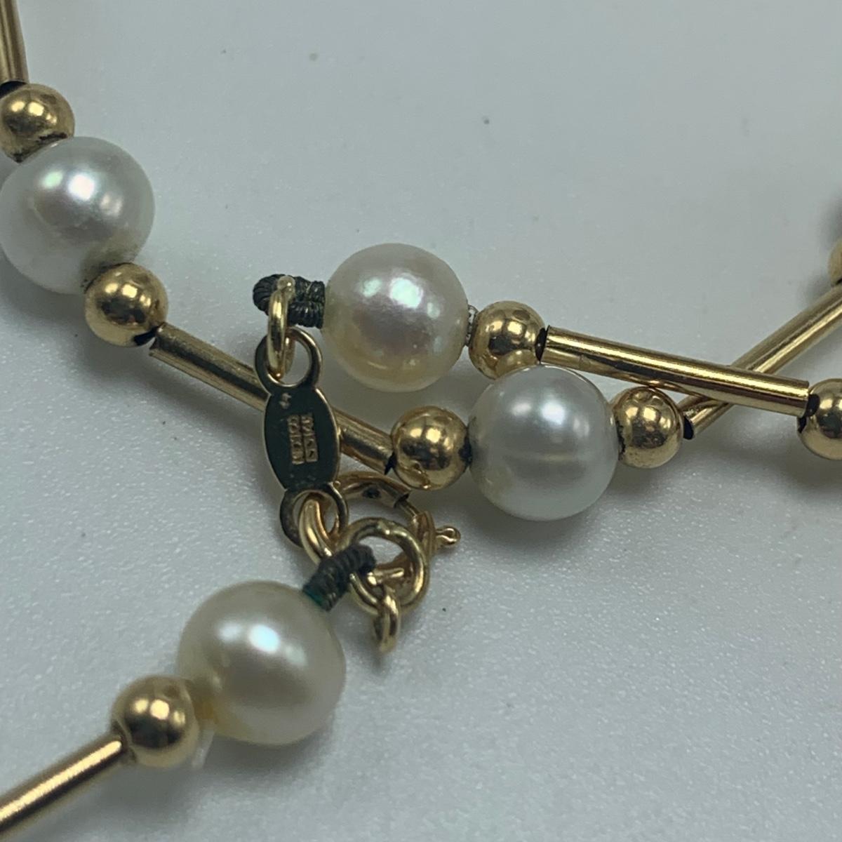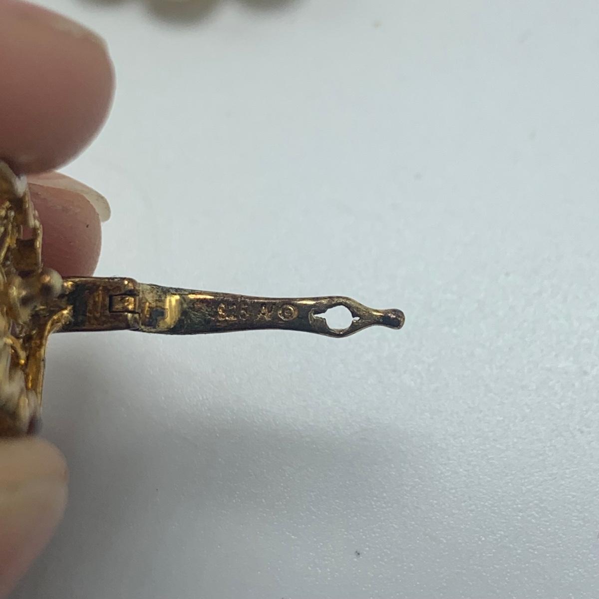 A collection of jewelry with pearl and pear-like gemstones. Included are five necklaces, 13 pairs of earrings for pierced ears, and two brooches. The longest necklace has three strands full of what appear to be freshwater pearls with a clasp stamped “˜14K’. It is 28”. The three single strand Pearl necklaces are all hand-knotted. One clasp is marked “˜14K’, one “˜10K’, and one “˜925’ along with its pendant. Some marks are found on earrings. Please see photos for any/all markings. Several have small clear gemstones. There is some tarnishing on some of the earrings and their backs.