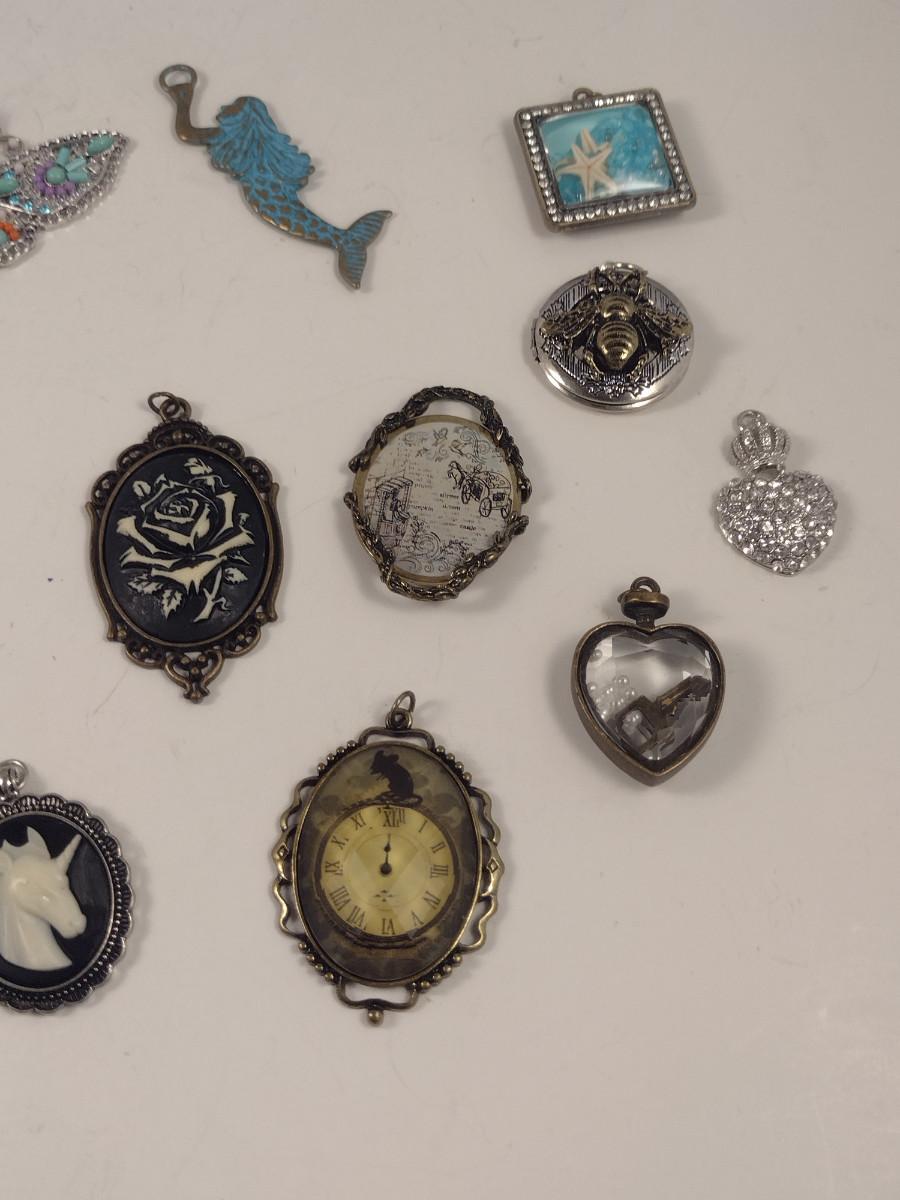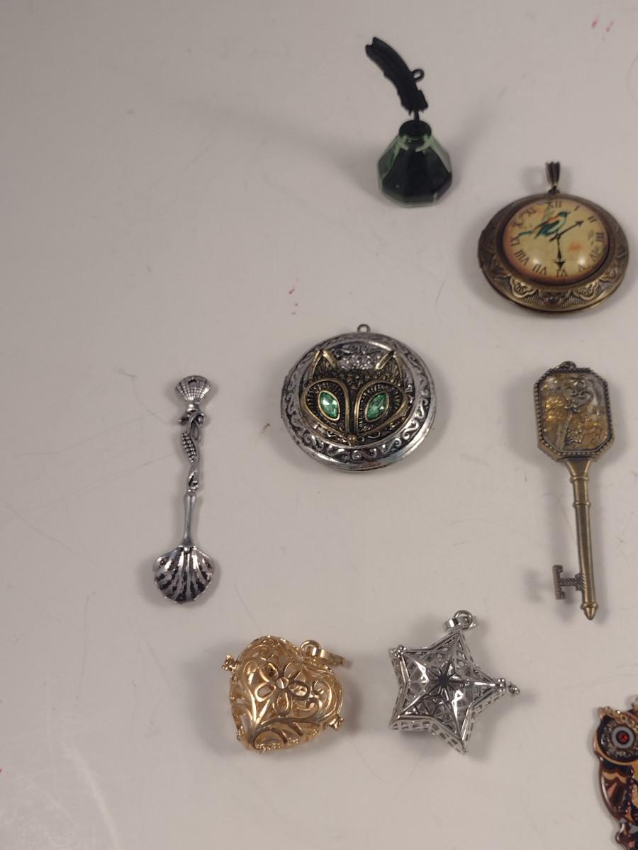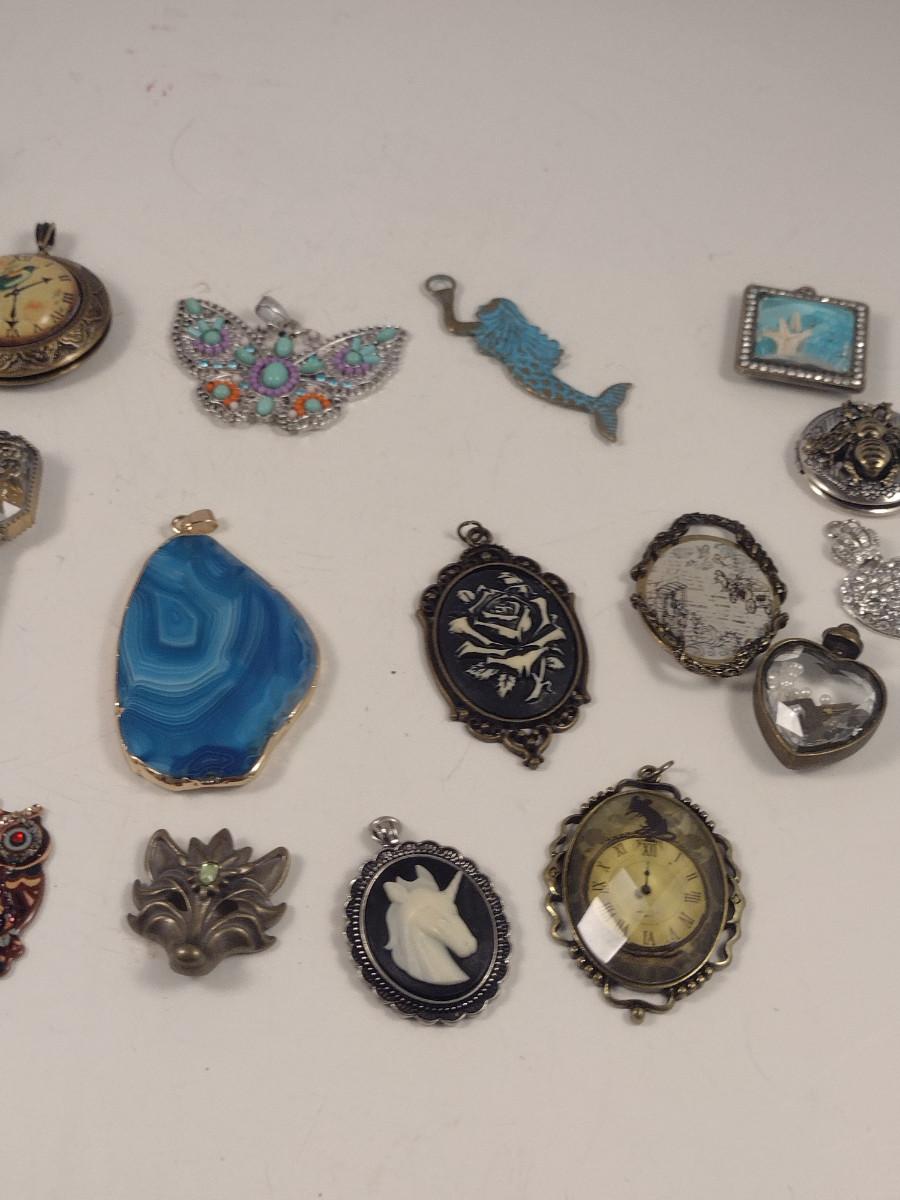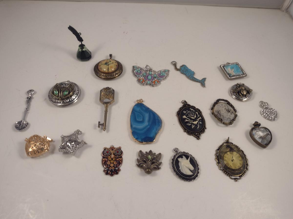 Collection of Pendants (#82). Some are lockets. Items that look like clocks are decorative only and have no working parts.