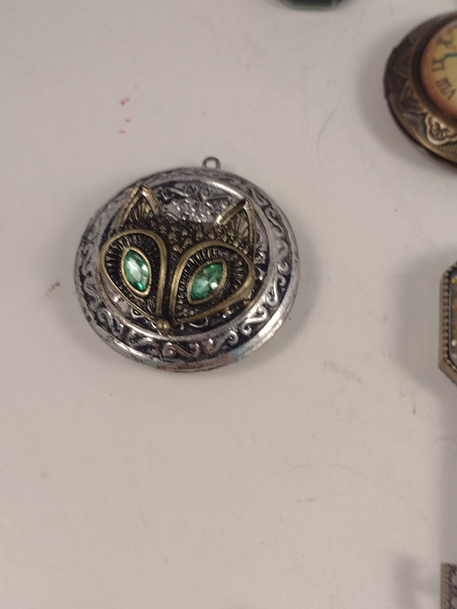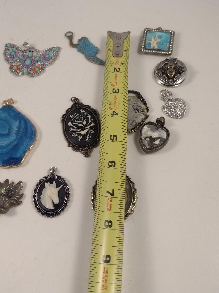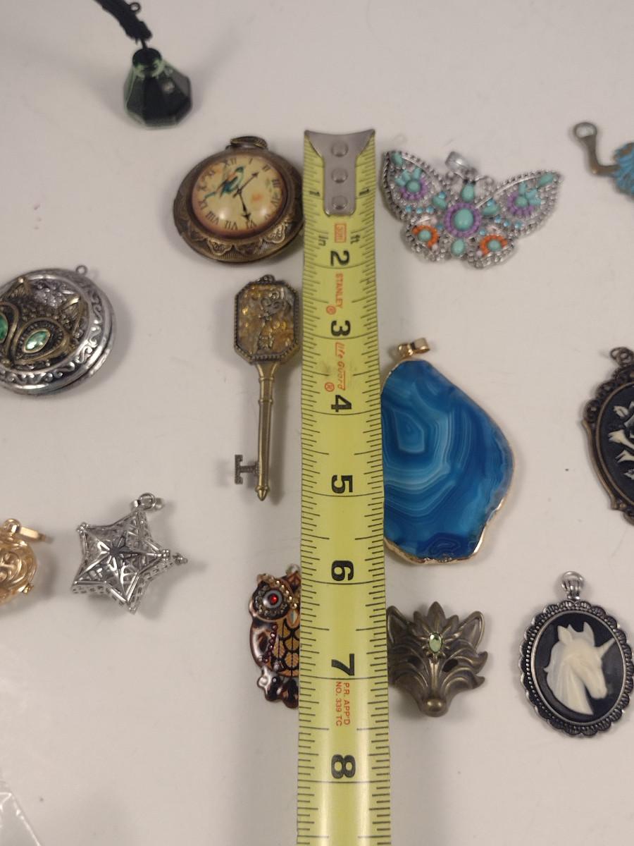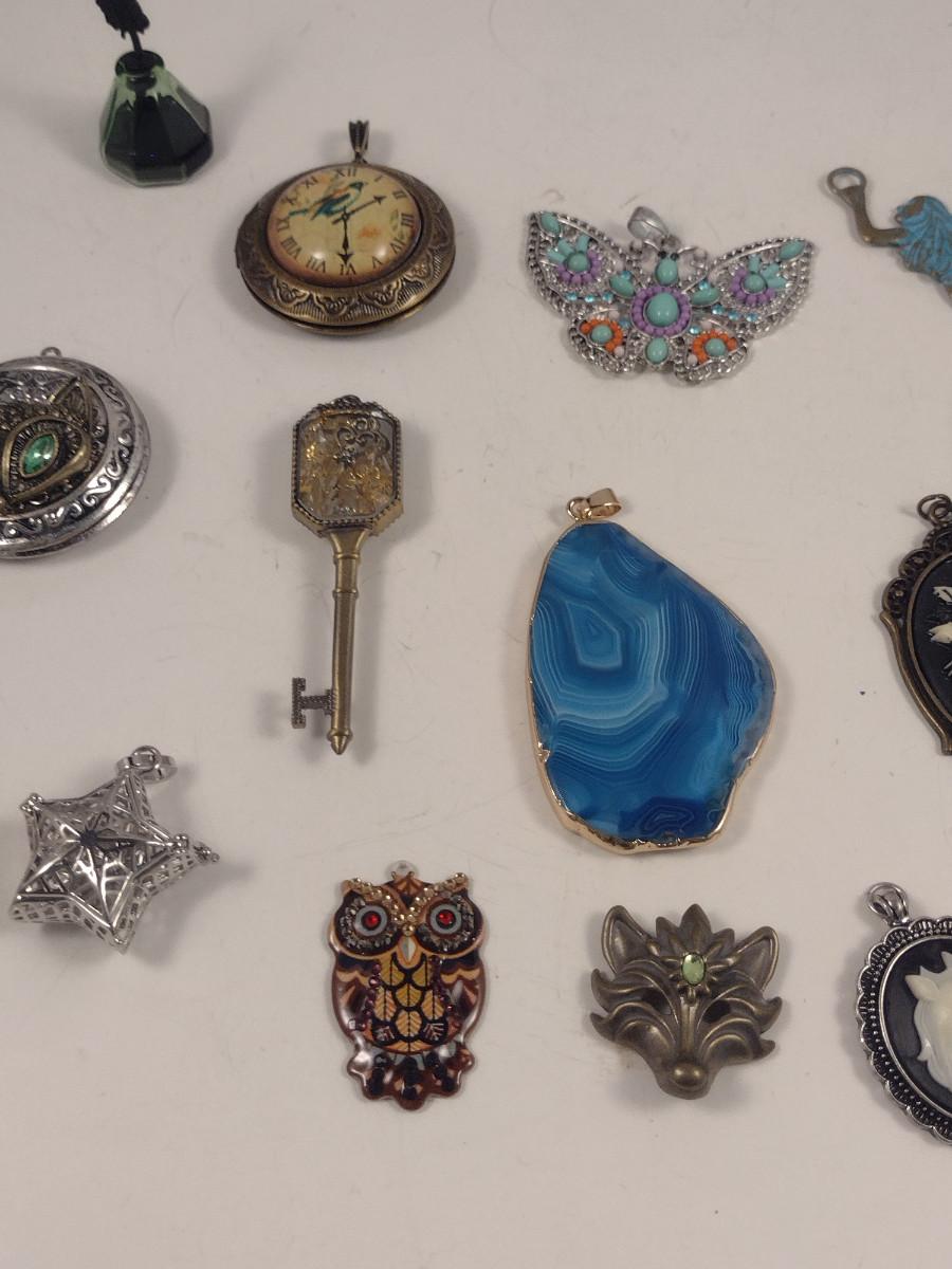 Collection of Pendants (#82). Some are lockets. Items that look like clocks are decorative only and have no working parts.