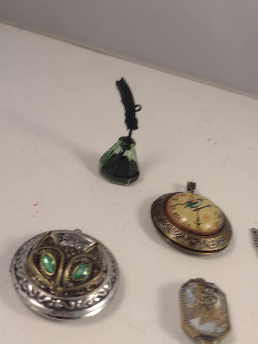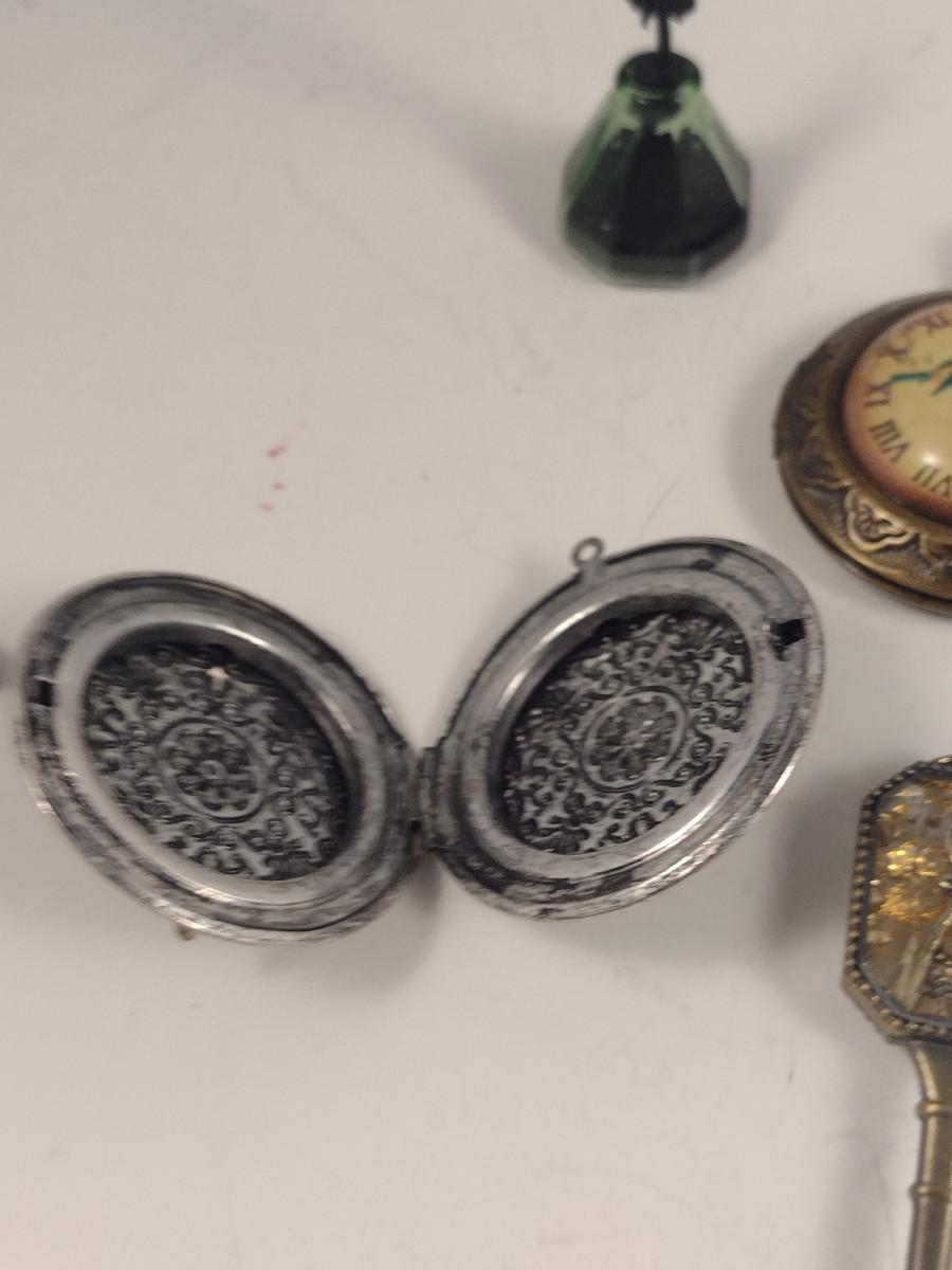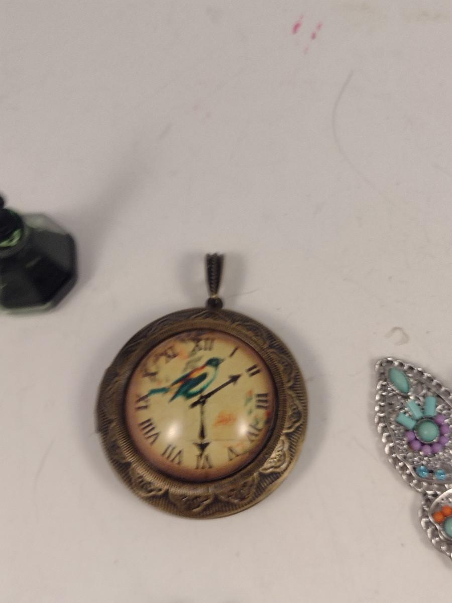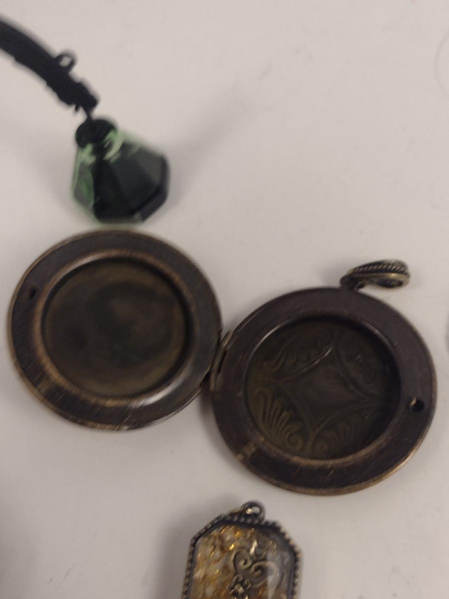 Collection of Pendants (#82). Some are lockets. Items that look like clocks are decorative only and have no working parts.