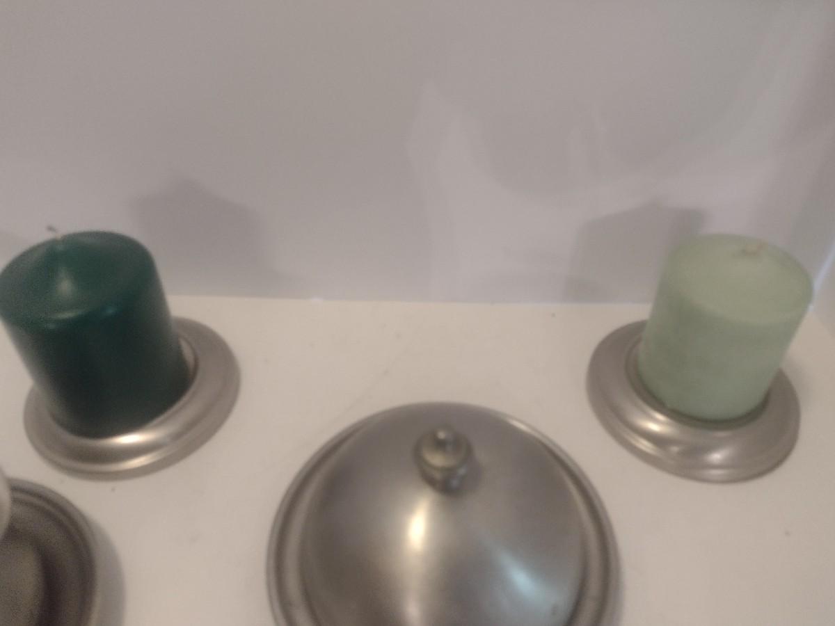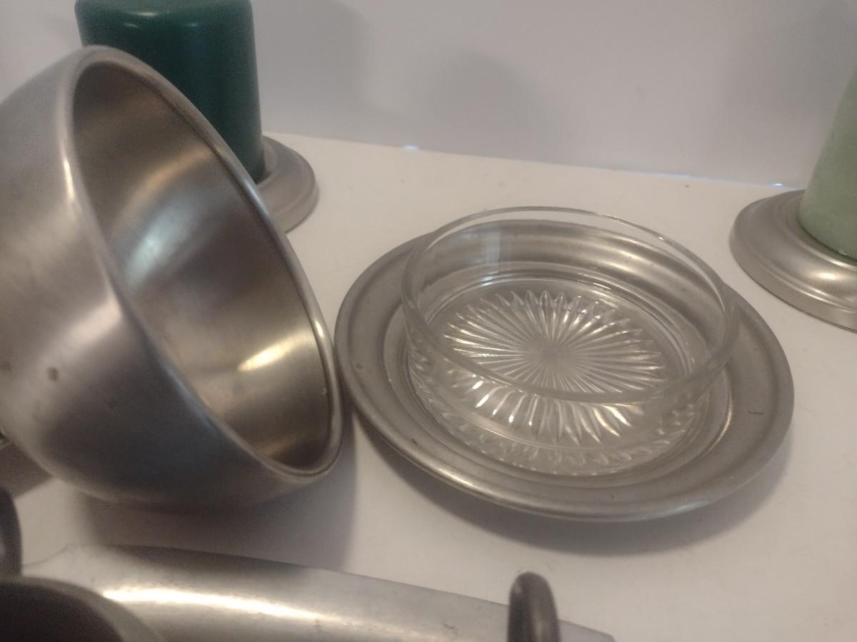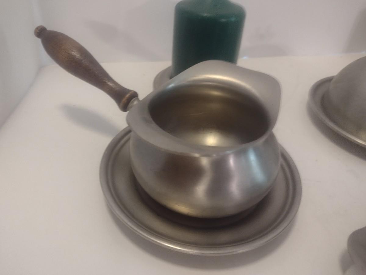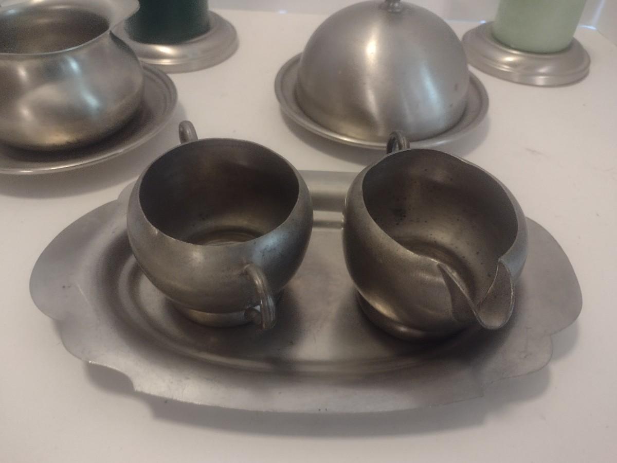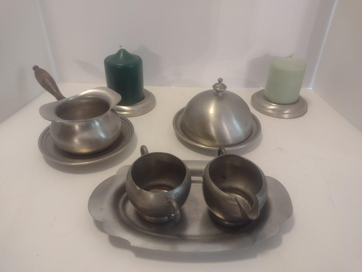 Collection of Pewter Table Ware Includes Creamer and Sugar Cups, Butter Dome and Other