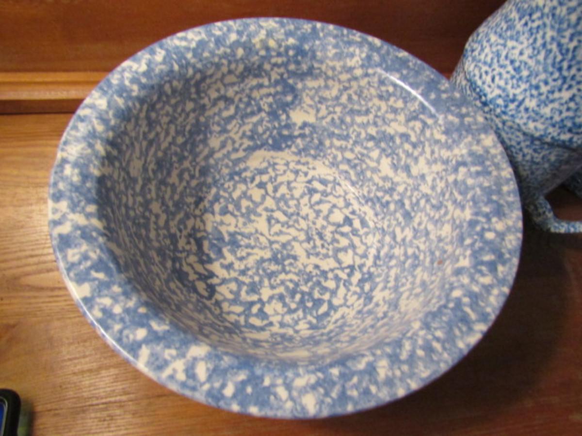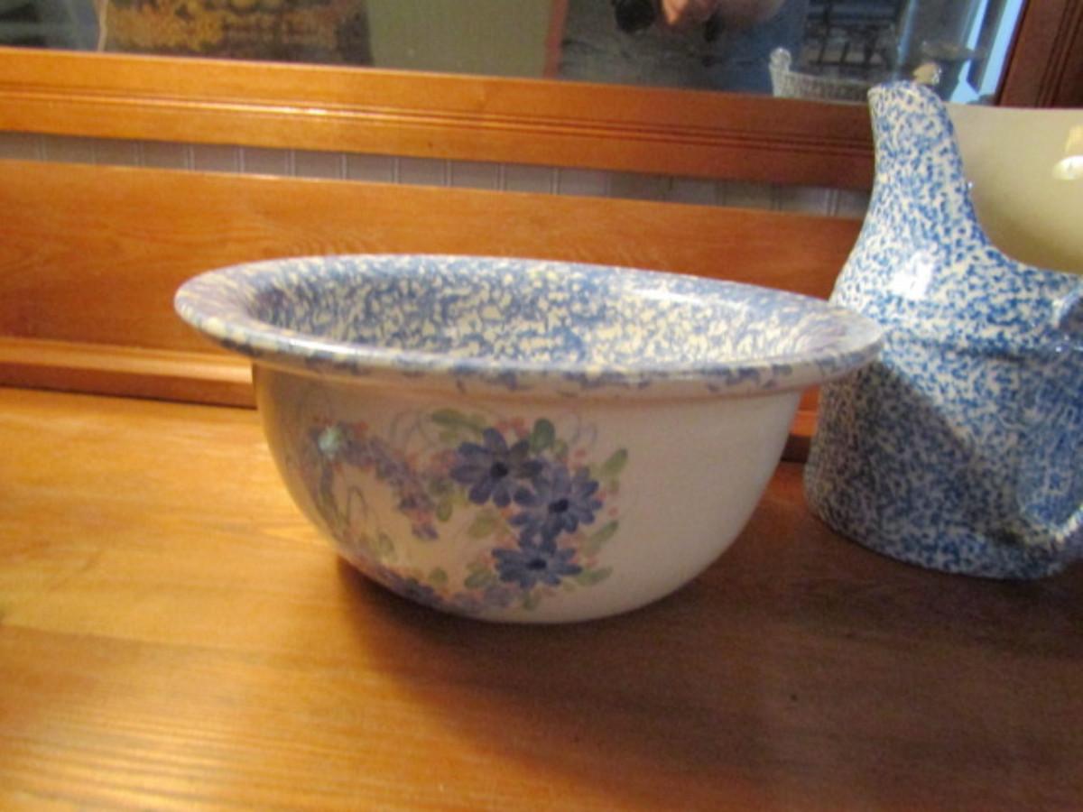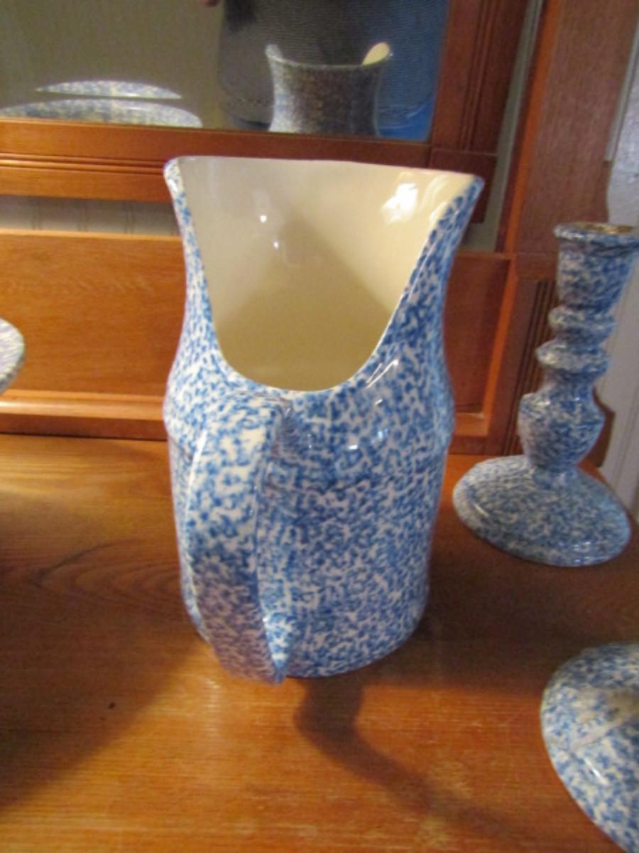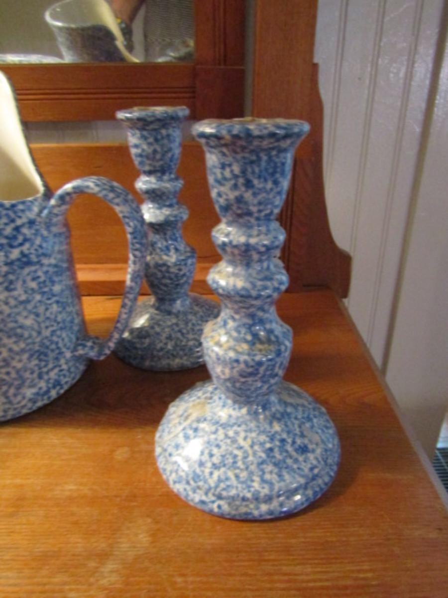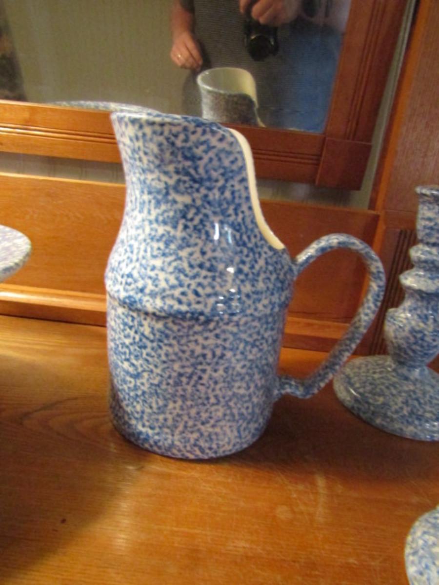 Collection of Pieces with Sponge Dappled Finish- Bowl, Pitcher, and Candle Holders. Please see all pictures- bowl has a chip on the edge.