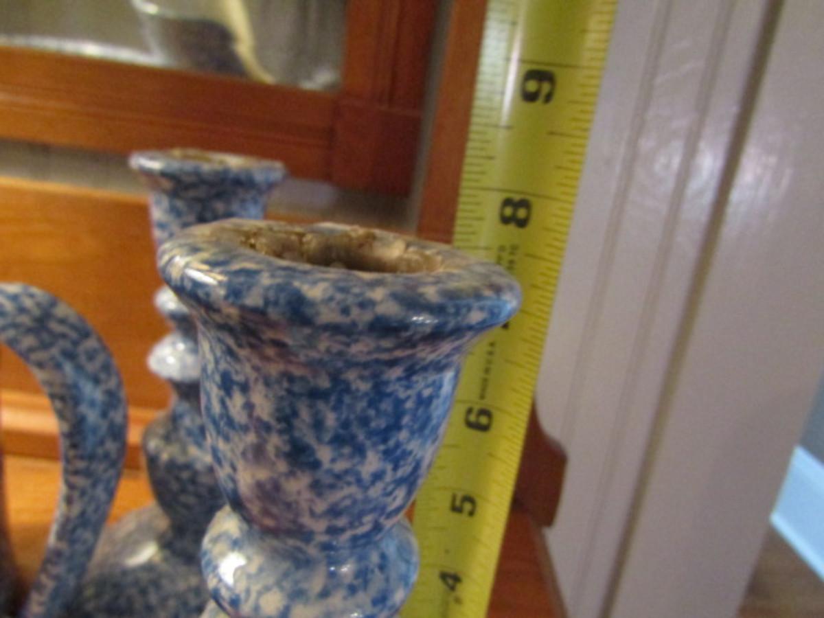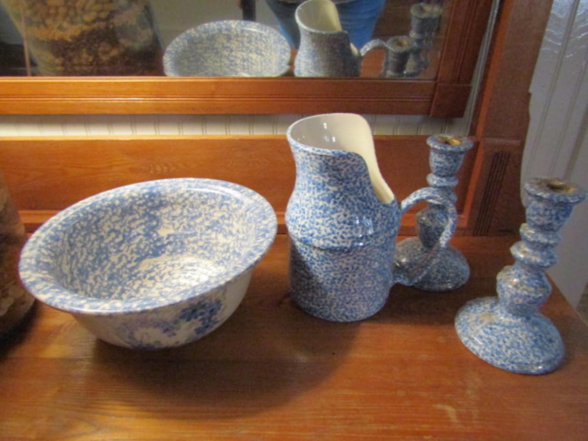 Collection of Pieces with Sponge Dappled Finish- Bowl, Pitcher, and Candle Holders