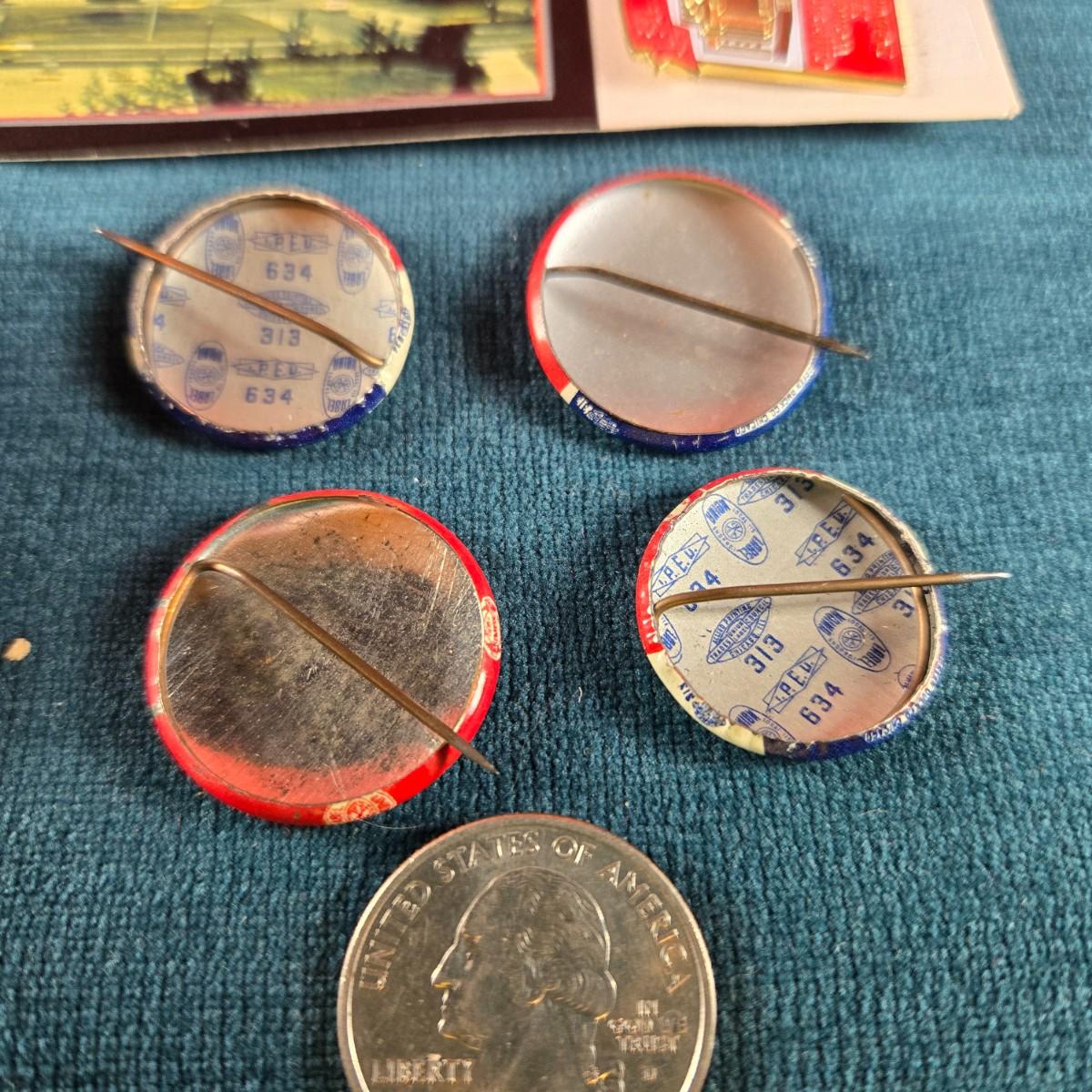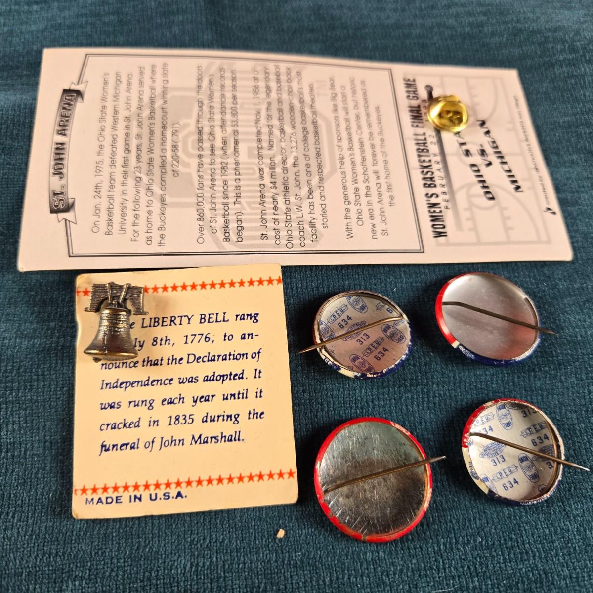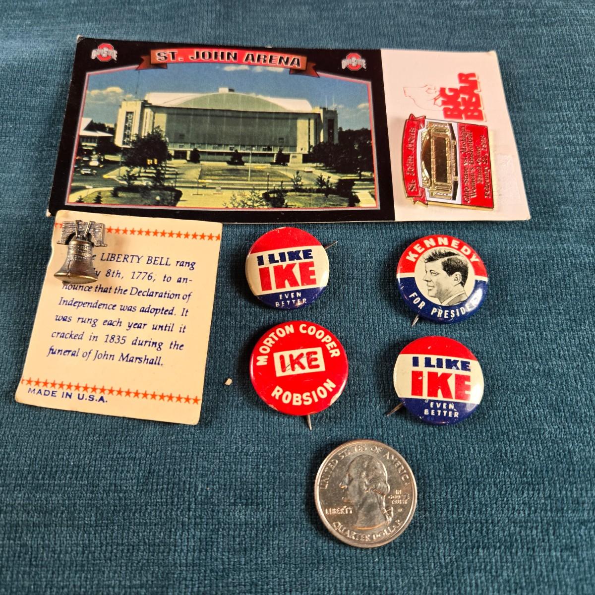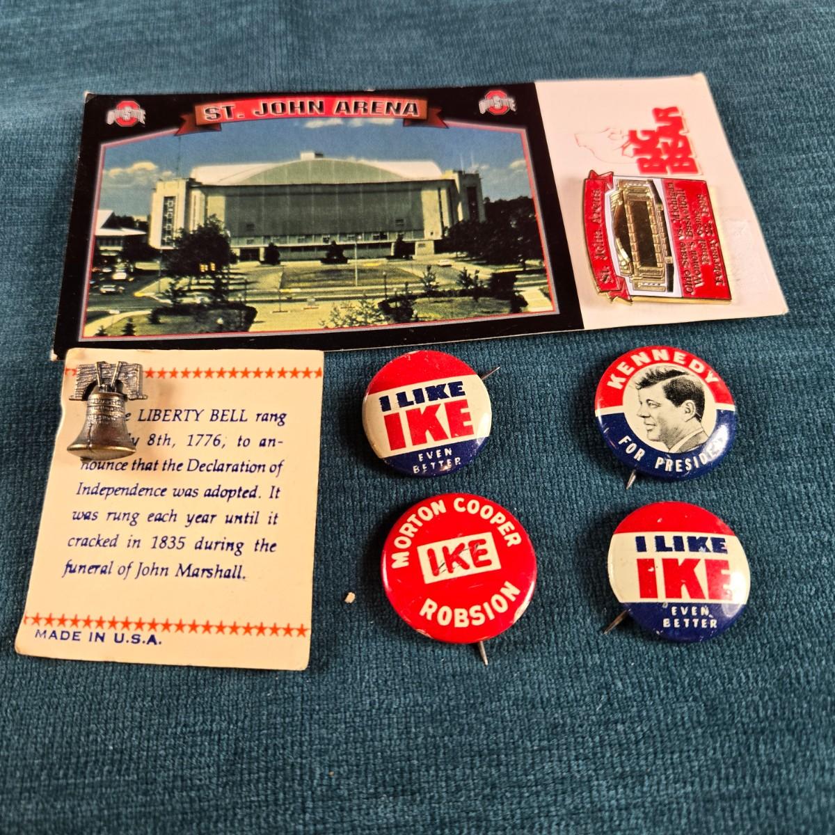 This auction lot is for a Collection of Pins. This is a grouping of 4 political pins and 2 lapel pins. The political pins all seem to be by Green Duck & Co., Chicago. The Kennedy pin is also marked 63. The Liberty Bell is of pewter and is very three dimensional. The last pin is a collector pin for the St. John's Arena, Ohio. It is attached to a ticket to attend the 1998 Women's Basketball Finals. They all are in good shape.