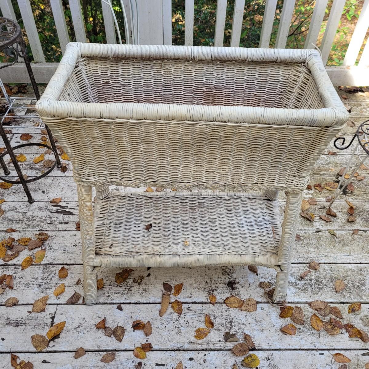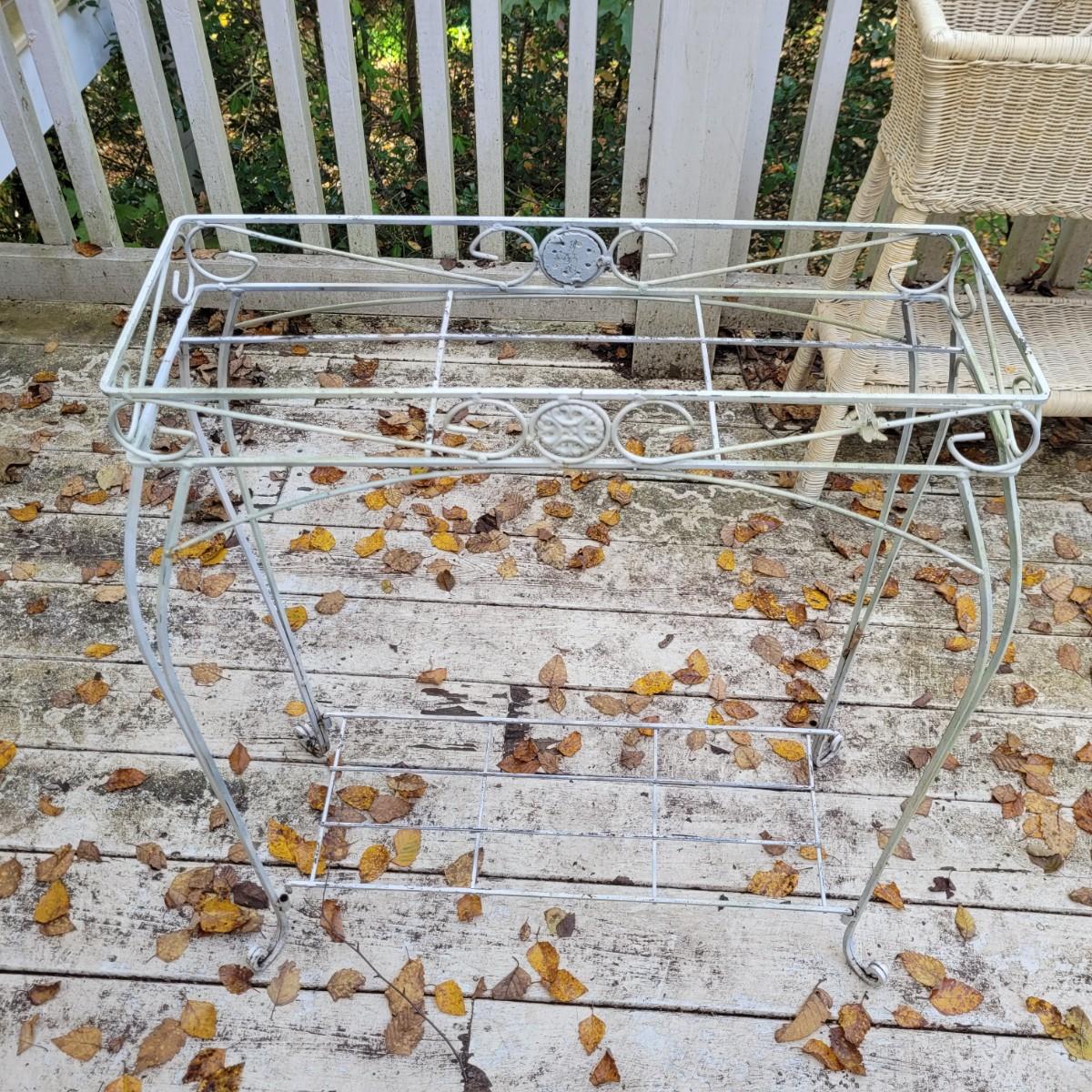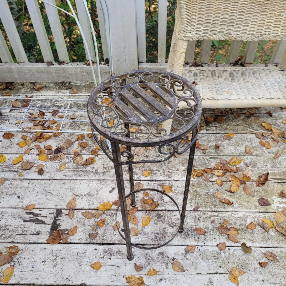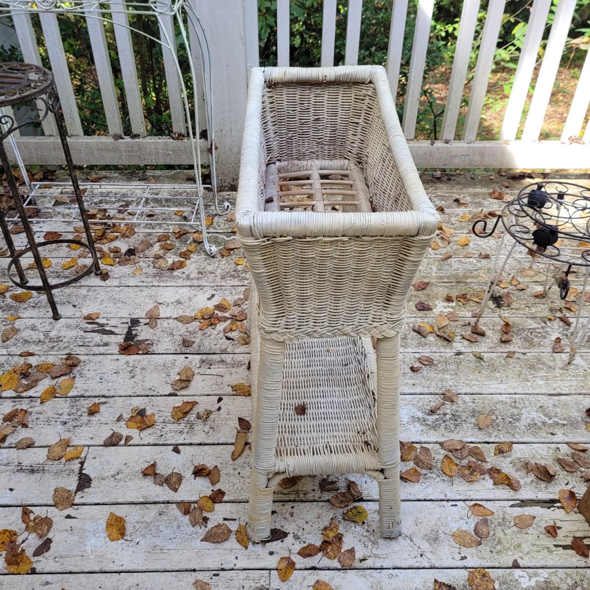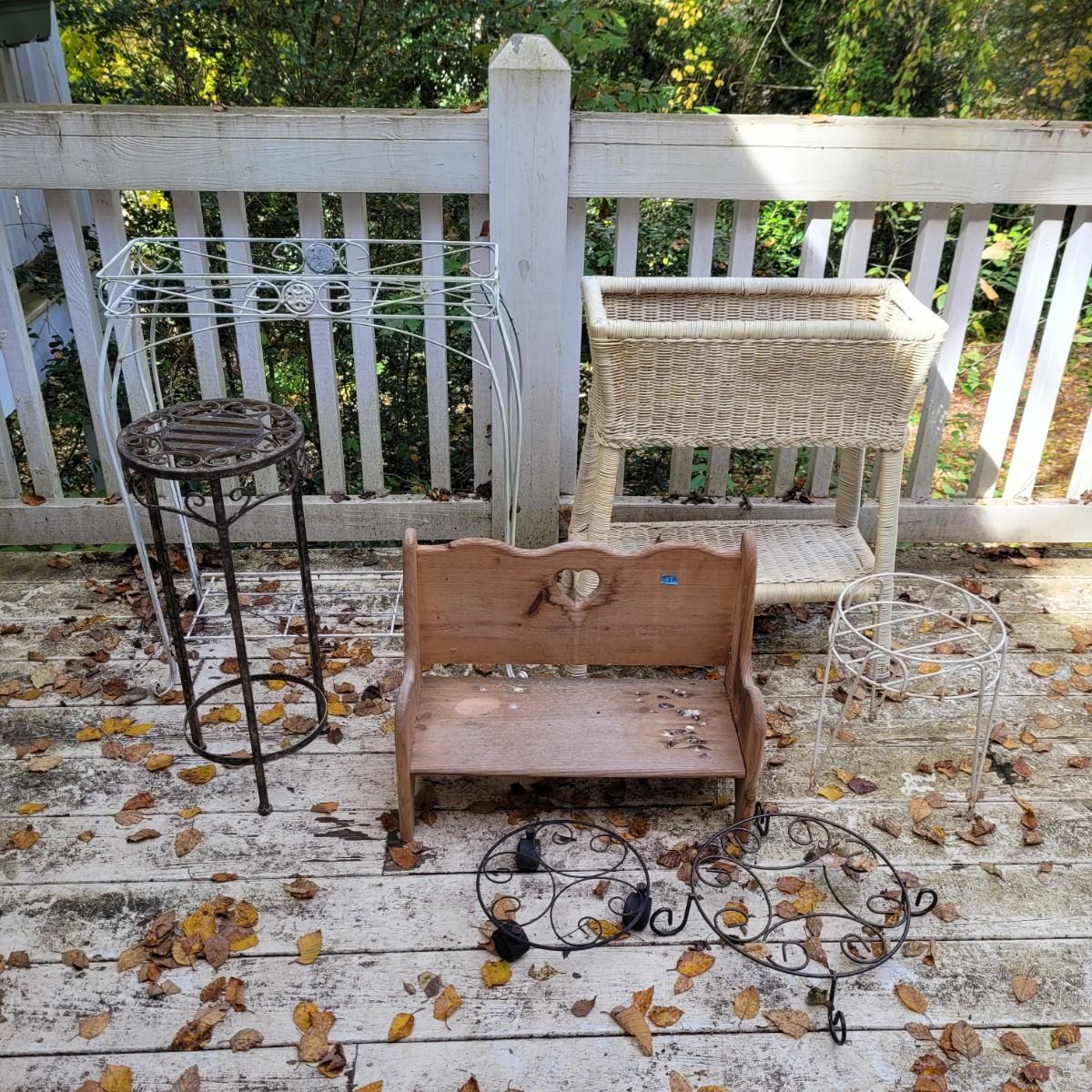 Collection of plant stands and wooden plant bench. Plant stands include a wicker style basin stand, floor stands and a tall metal stand. Tall metal stand measures approximately 24"L x9"W x30"H. Local pickup only.