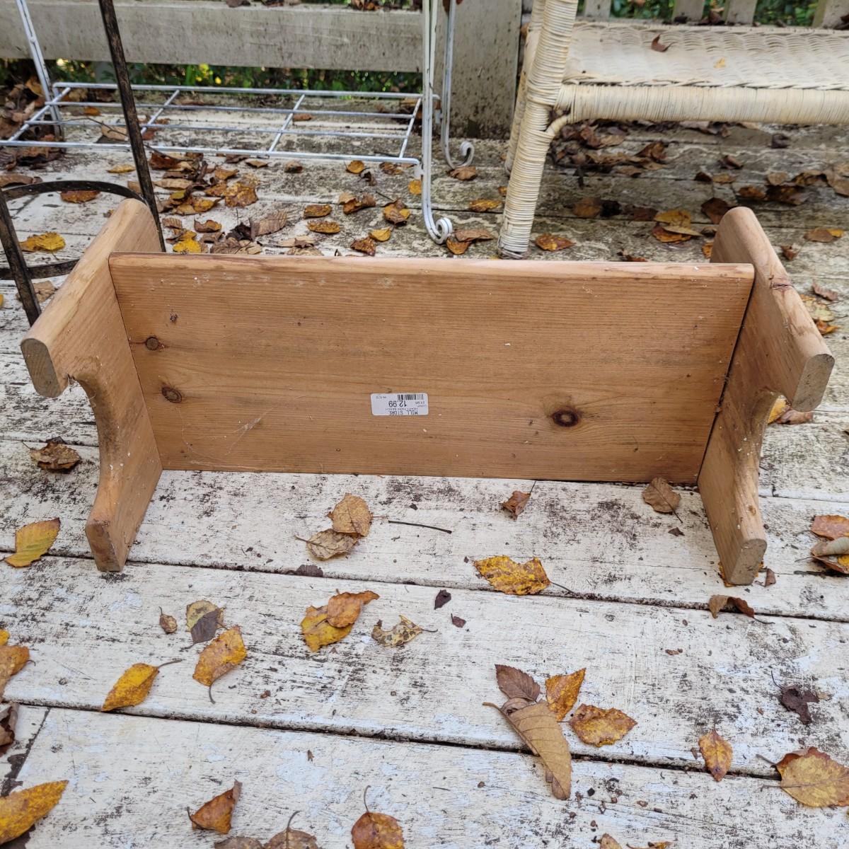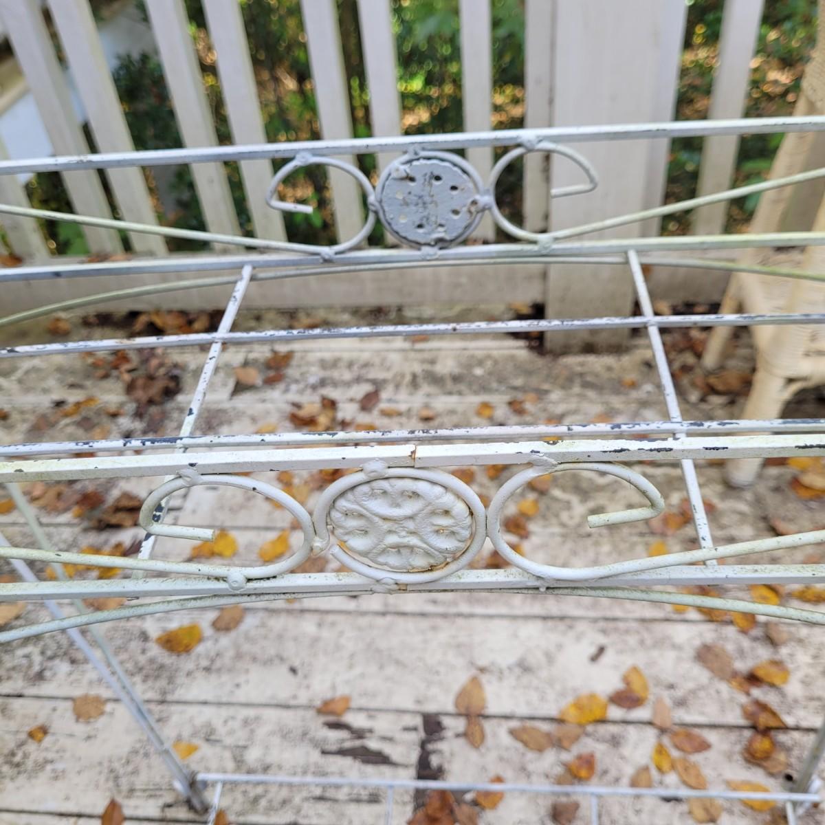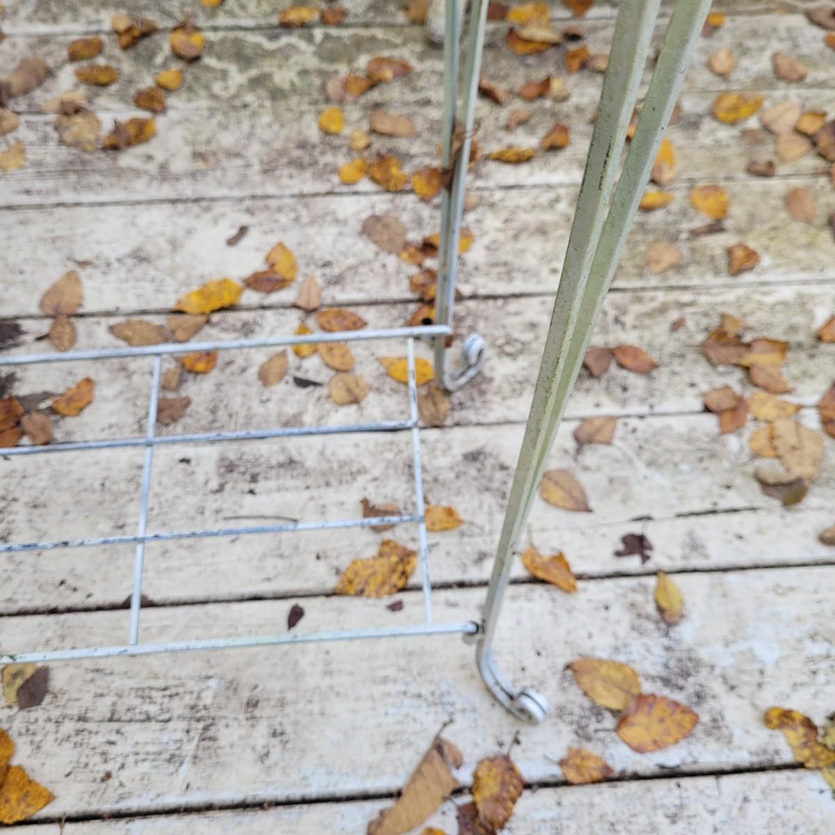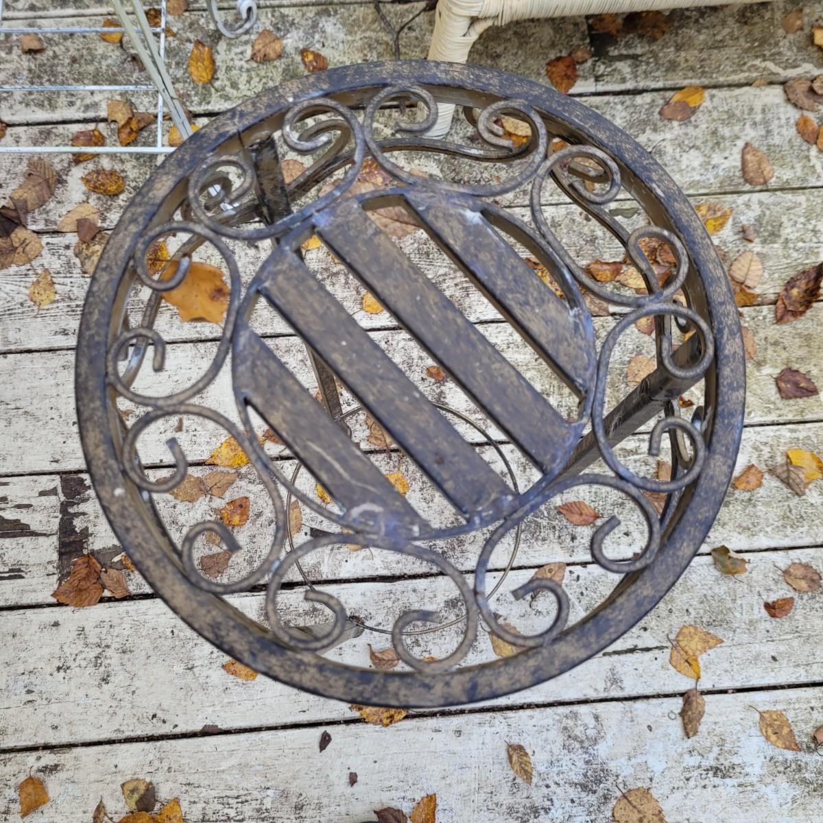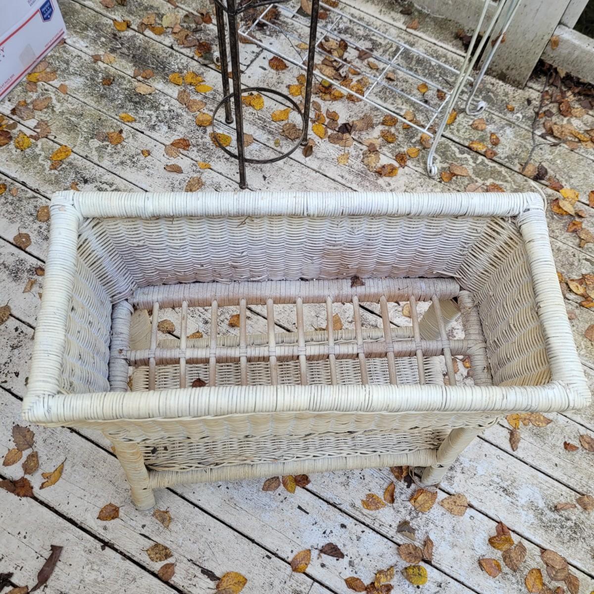 Collection of plant stands and wooden plant bench. Plant stands include a wicker style basin stand, floor stands and a tall metal stand. Tall metal stand measures approximately 24"L x9"W x30"H. Local pickup only.