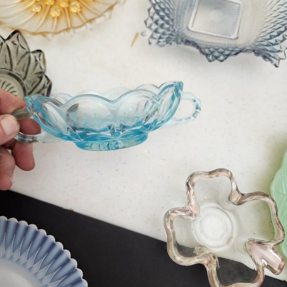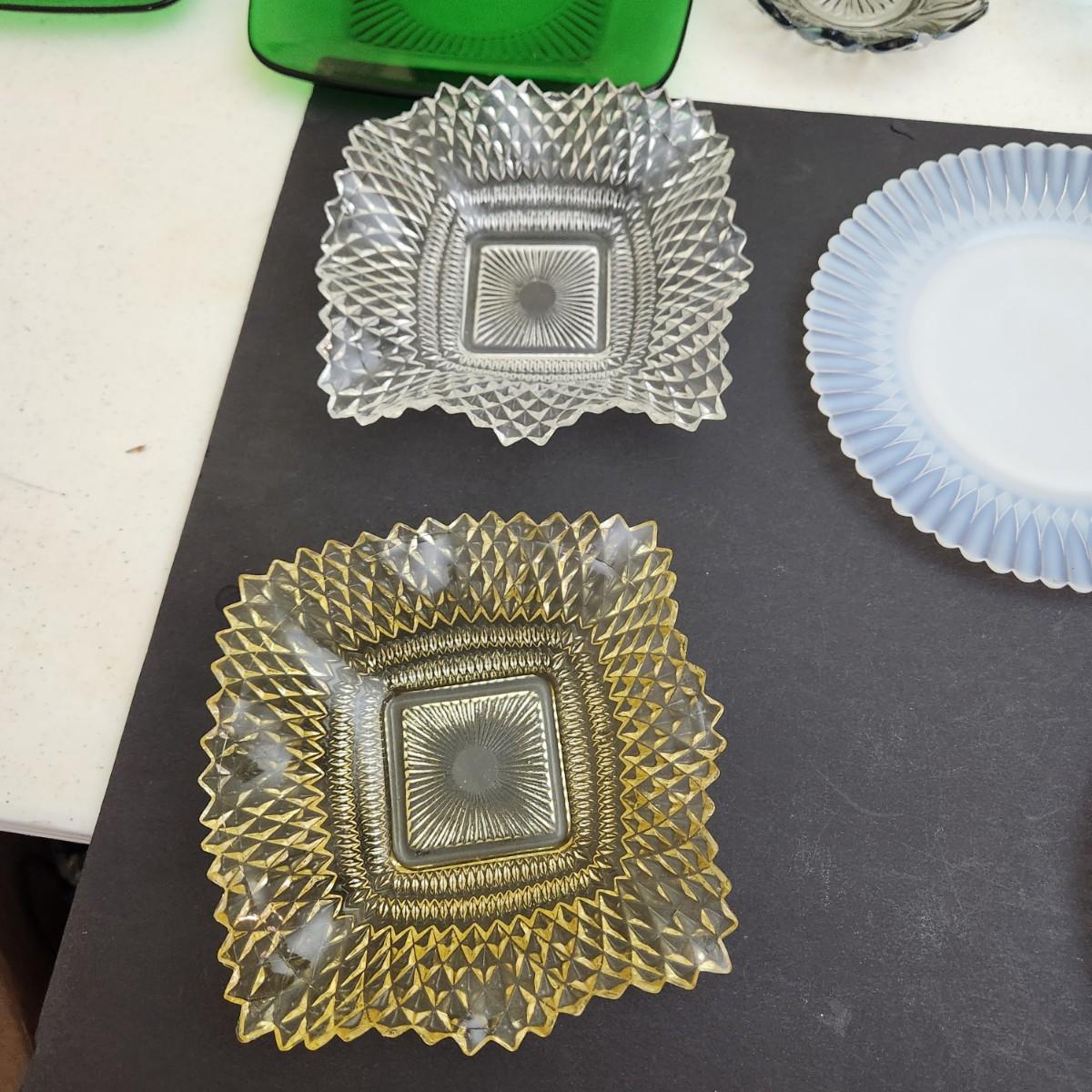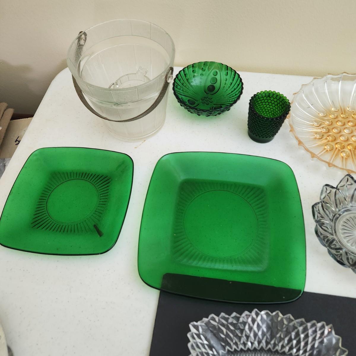 Collection of Plates & Bowls, Glass Ice Bucket, Green Glass, 3 MacBeth Evans Petalware Plates, Depression Amber Art Glass