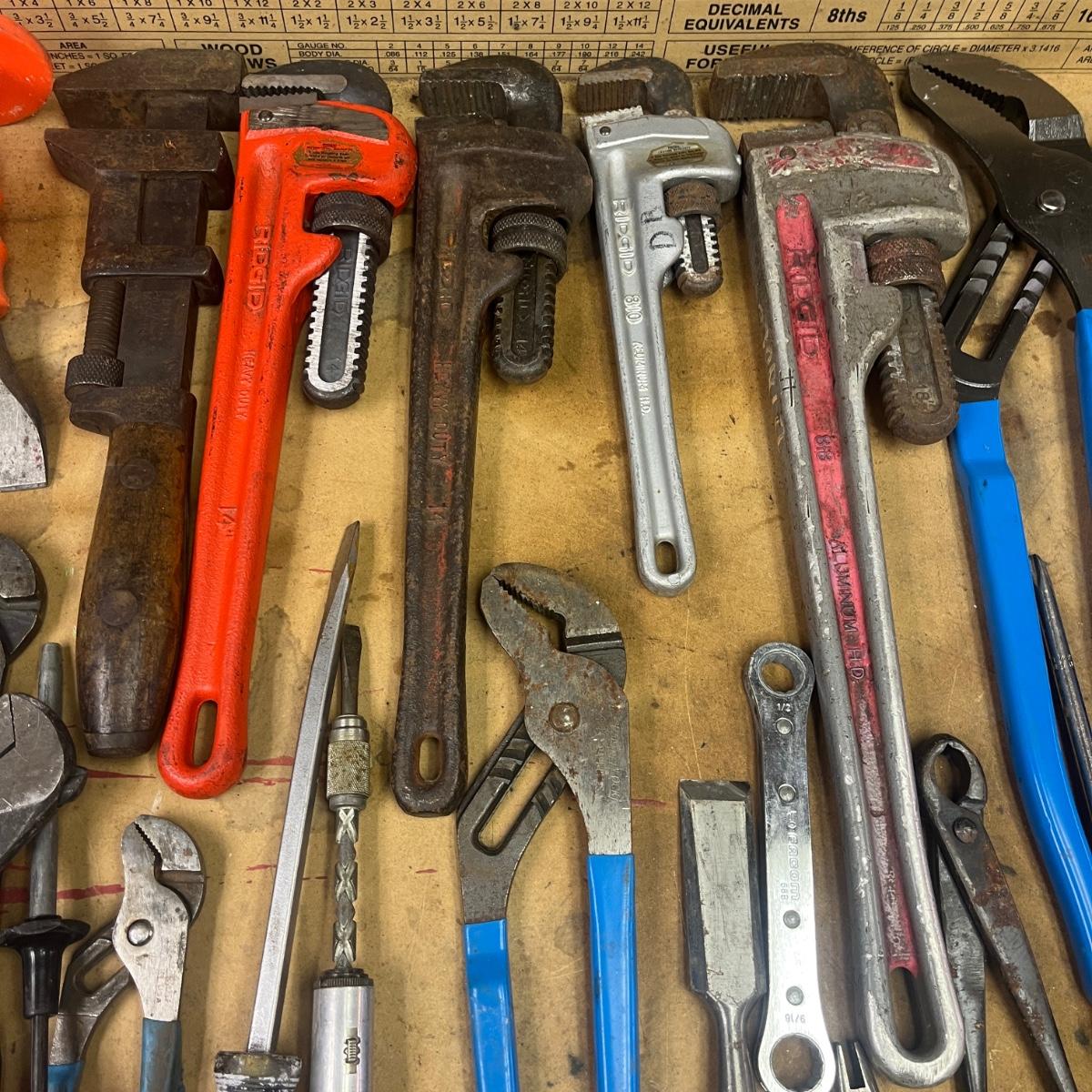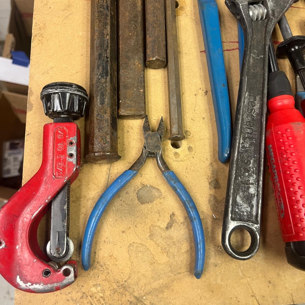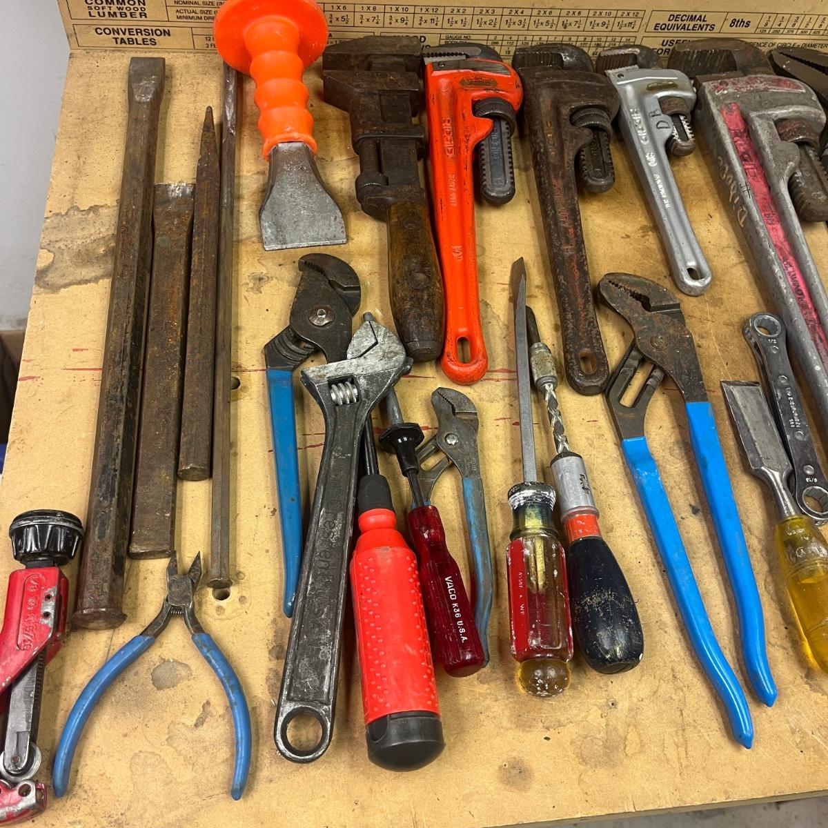Lot contains a collection of tools including Ridgid pipe wrenches, Channellock pliers, Vise Grips pliers and fence tool, chisels, hammers, screwdrivers, pipe cutter, wire cutters and a plastic tool caddy that measures 21” x 13” 7”H.