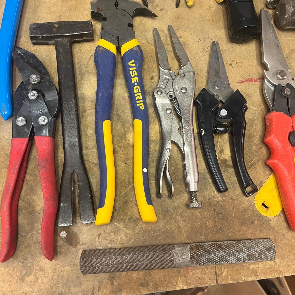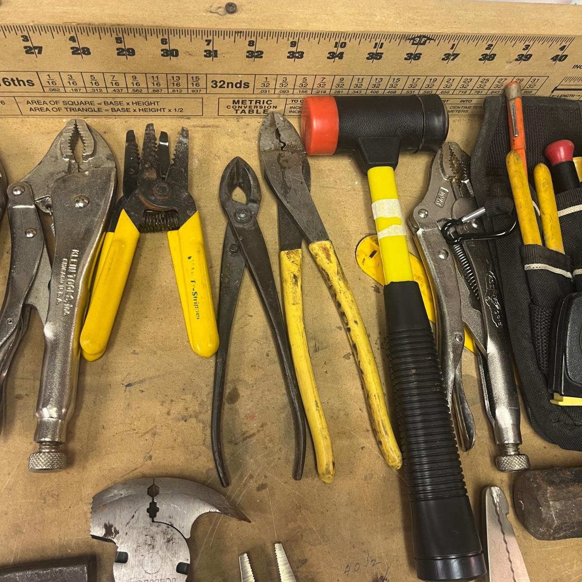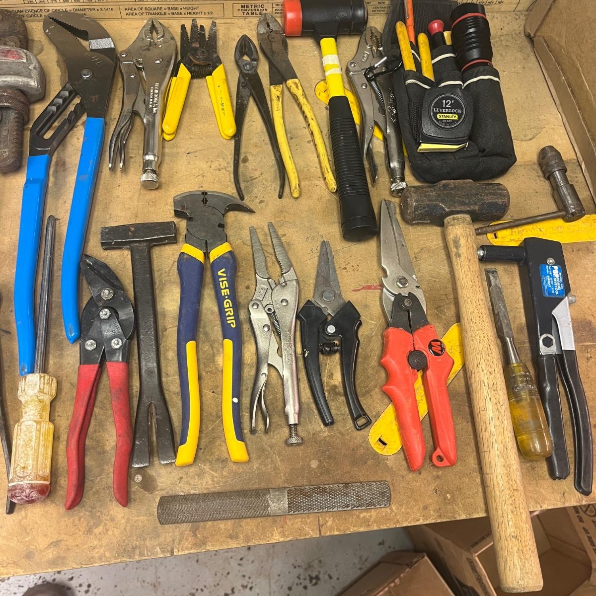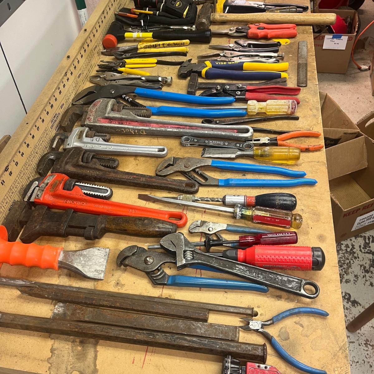 Lot contains a collection of tools including Ridgid pipe wrenches, Channellock pliers, Vise Grips pliers and fence tool, chisels, hammers, screwdrivers, pipe cutter, wire cutters and a plastic tool caddy that measures 21” x 13” 7”H.