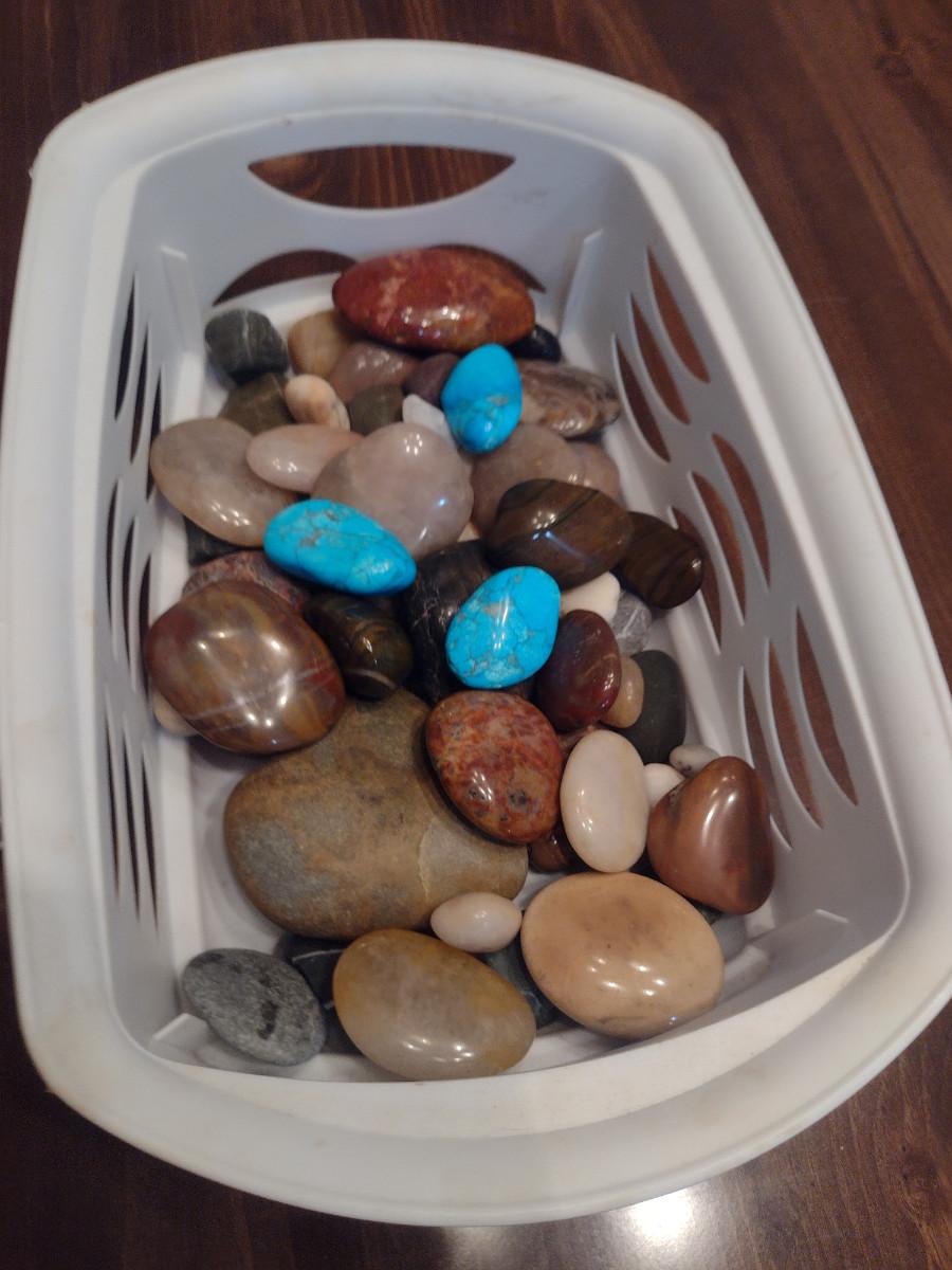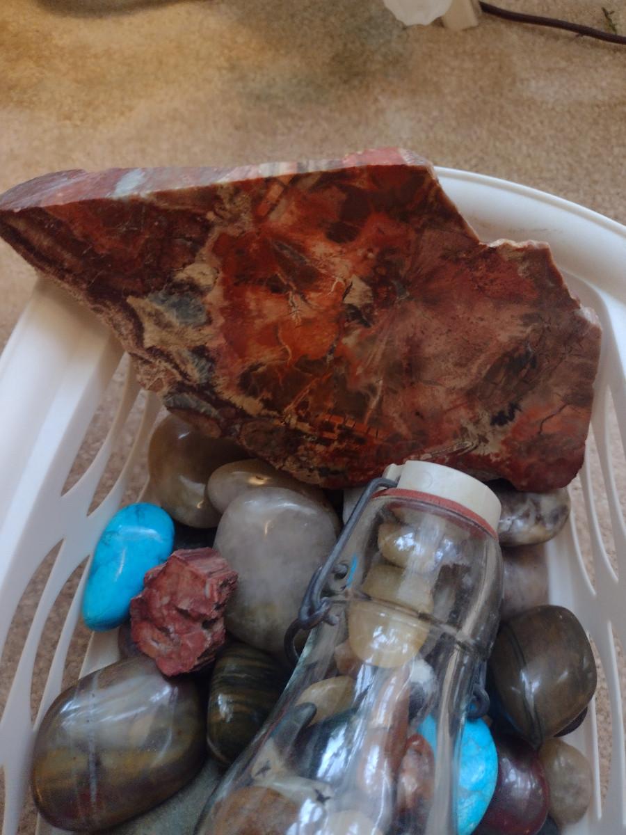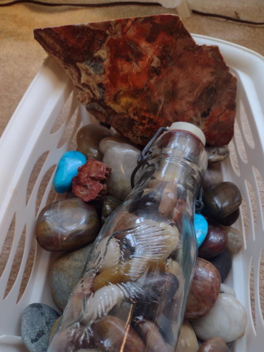 Collection of Polished/Tumbled Stones- Includes Bale Top Bottle and Possible Petrified Wood Slab