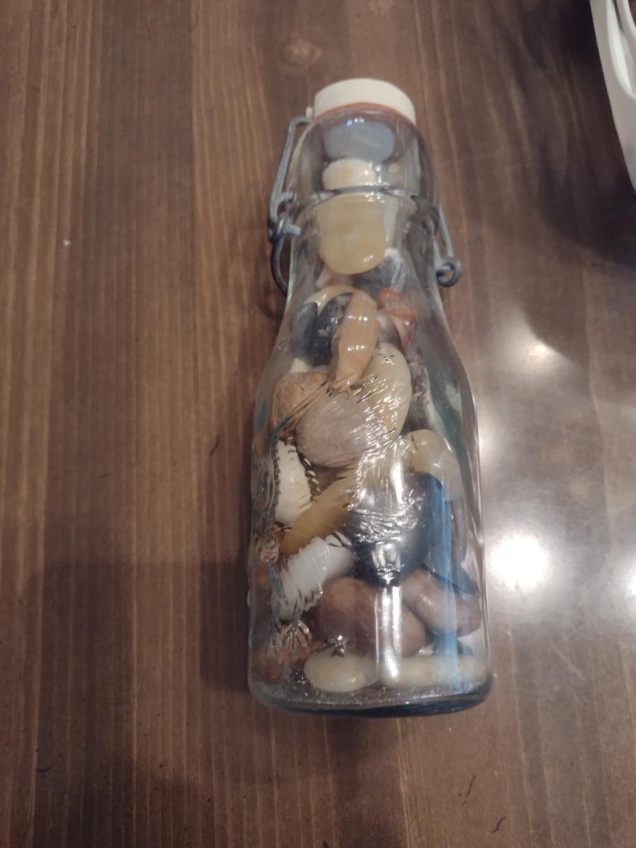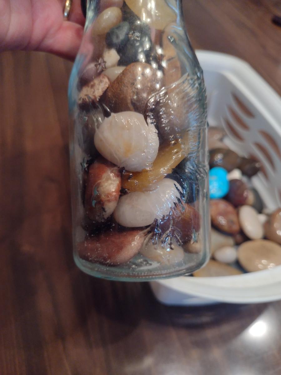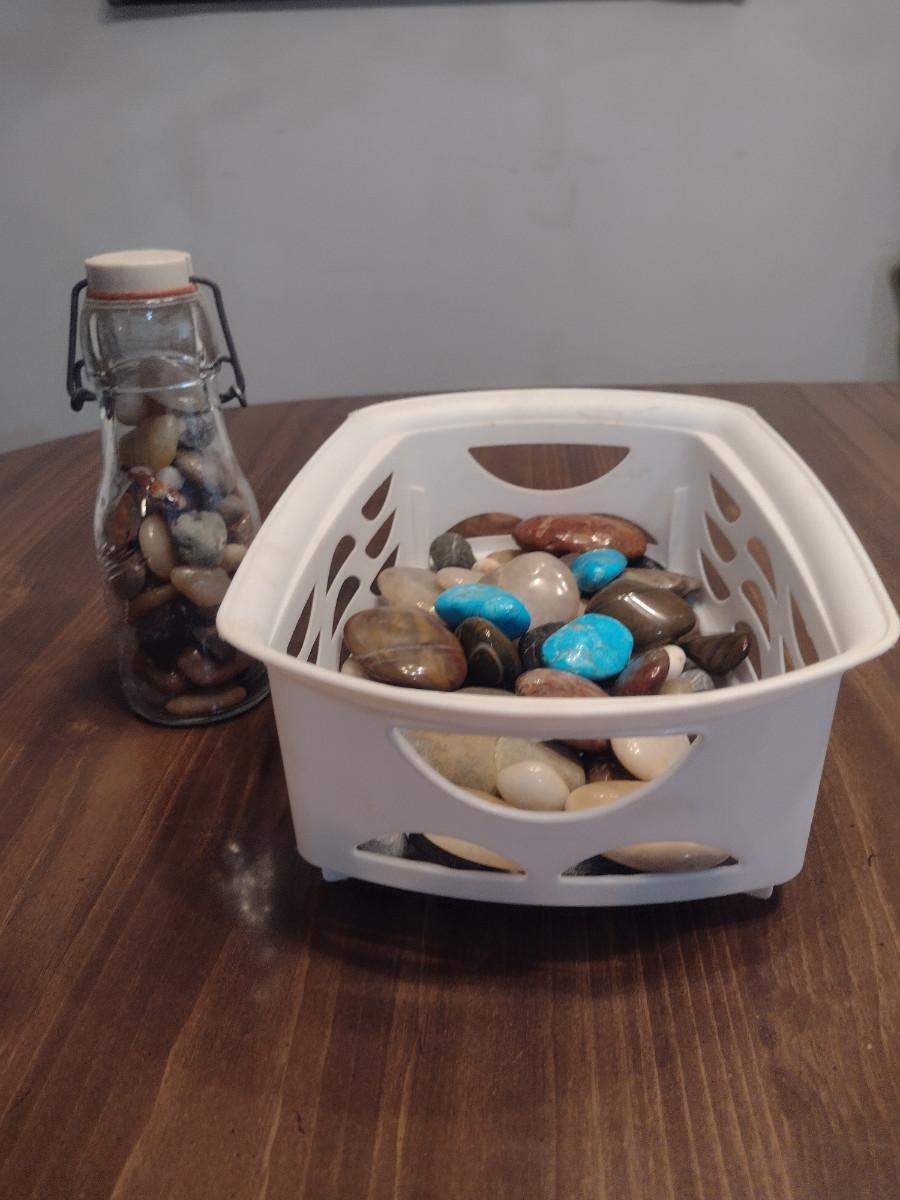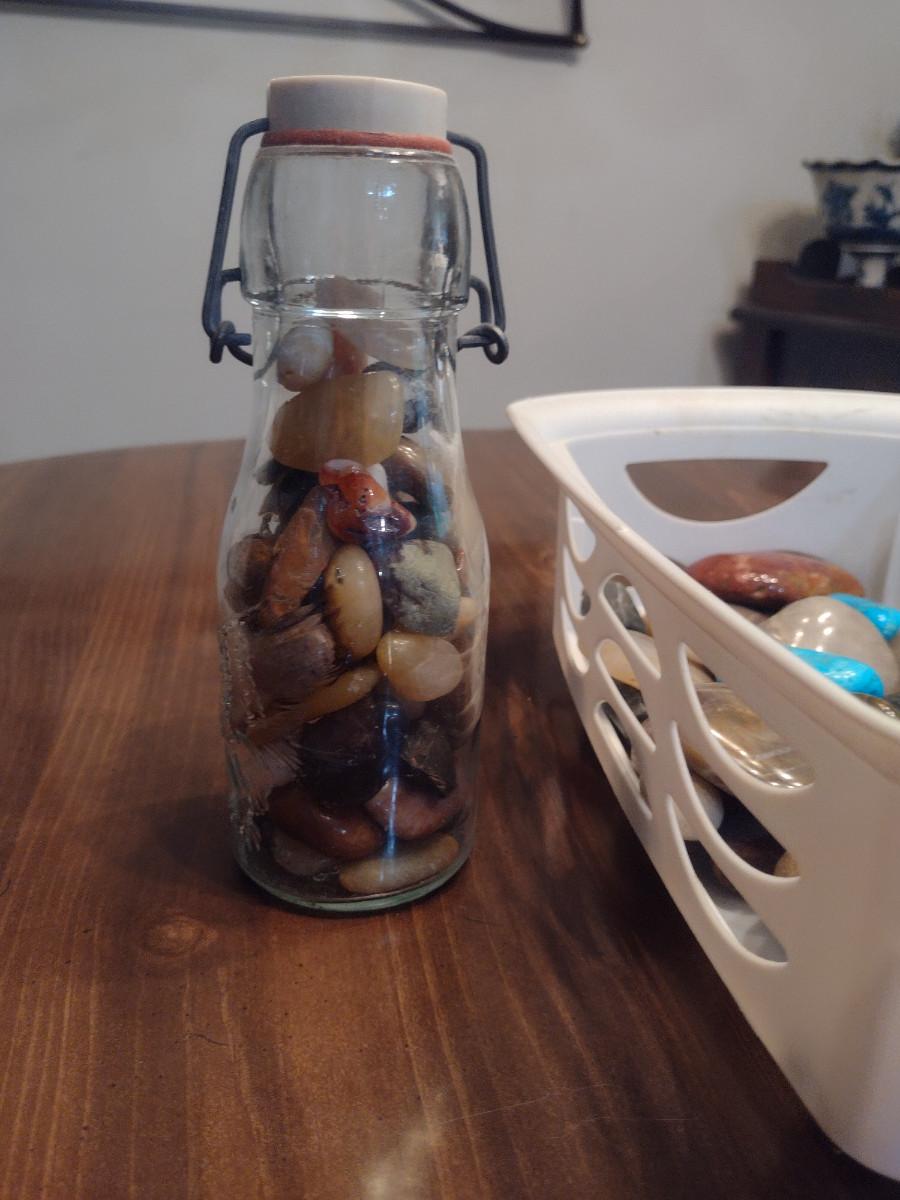 Collection of Polished/Tumbled Stones- Includes Bale Top Bottle and Possible Petrified Wood Slab