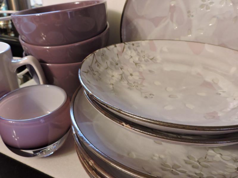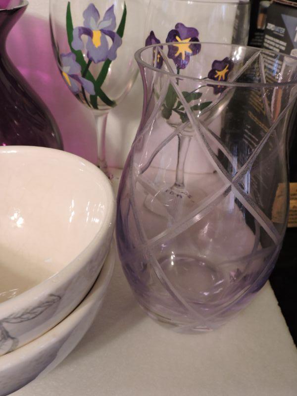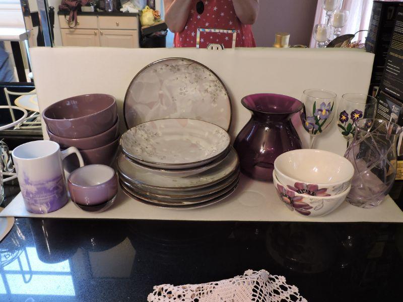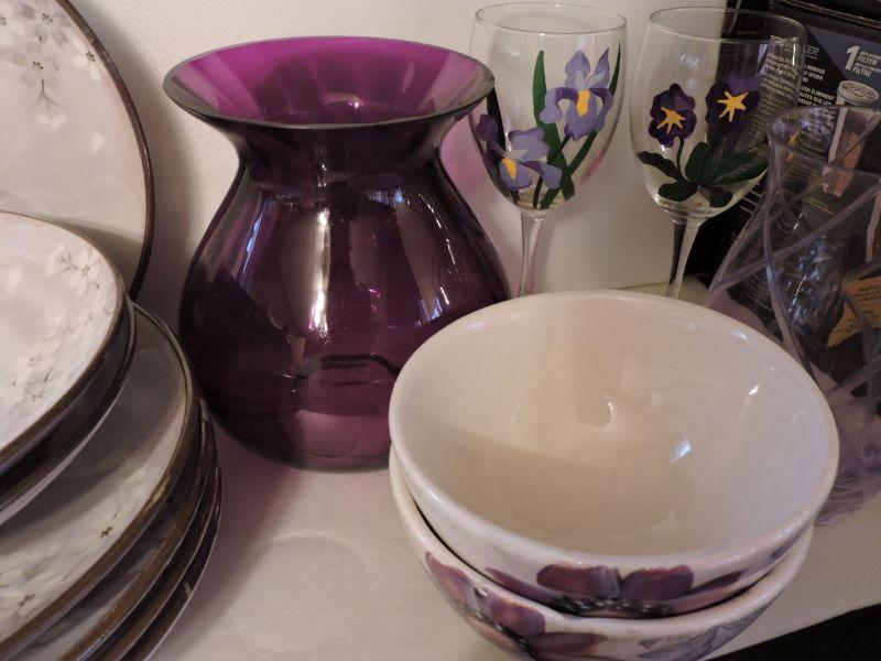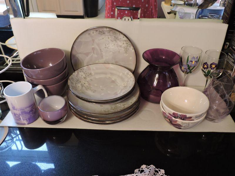 Plates, bowls, wine glasses, mugs, and a small cut glass vase. A fourth solid purple bowl was added after the photos. **Please read Terms and Conditions before placing a bid. Pick up is Wednesday, September 25 from 4pm to 7pm and Saturday, September 28 from 9am to 1pm in Williamstown, NJ. All sales are final. All sales are as is, where is. Please review all photos. Any props included in photos are not included in listing. All measurements are approximate.