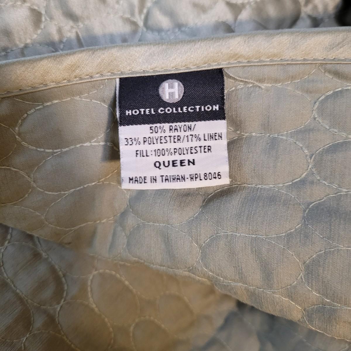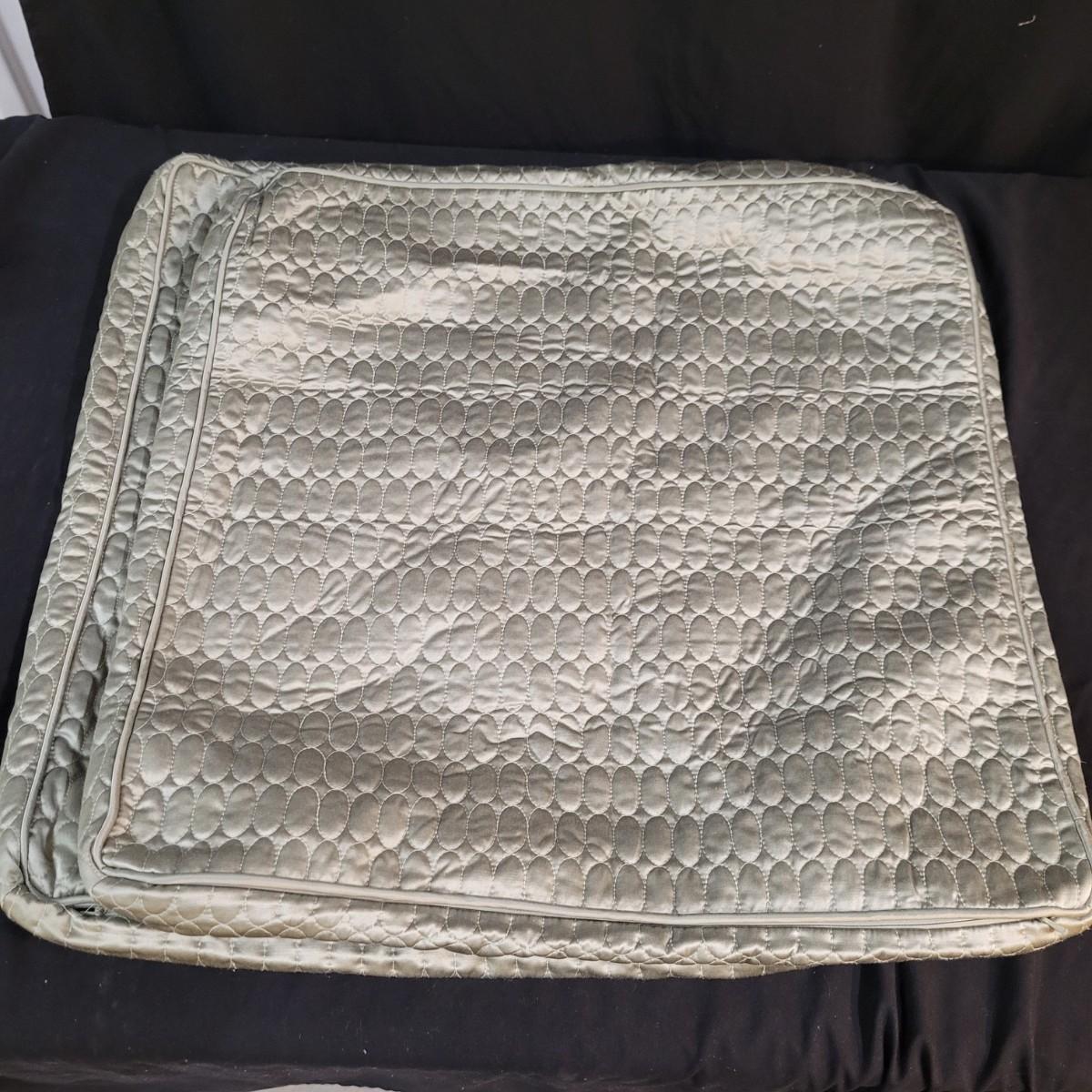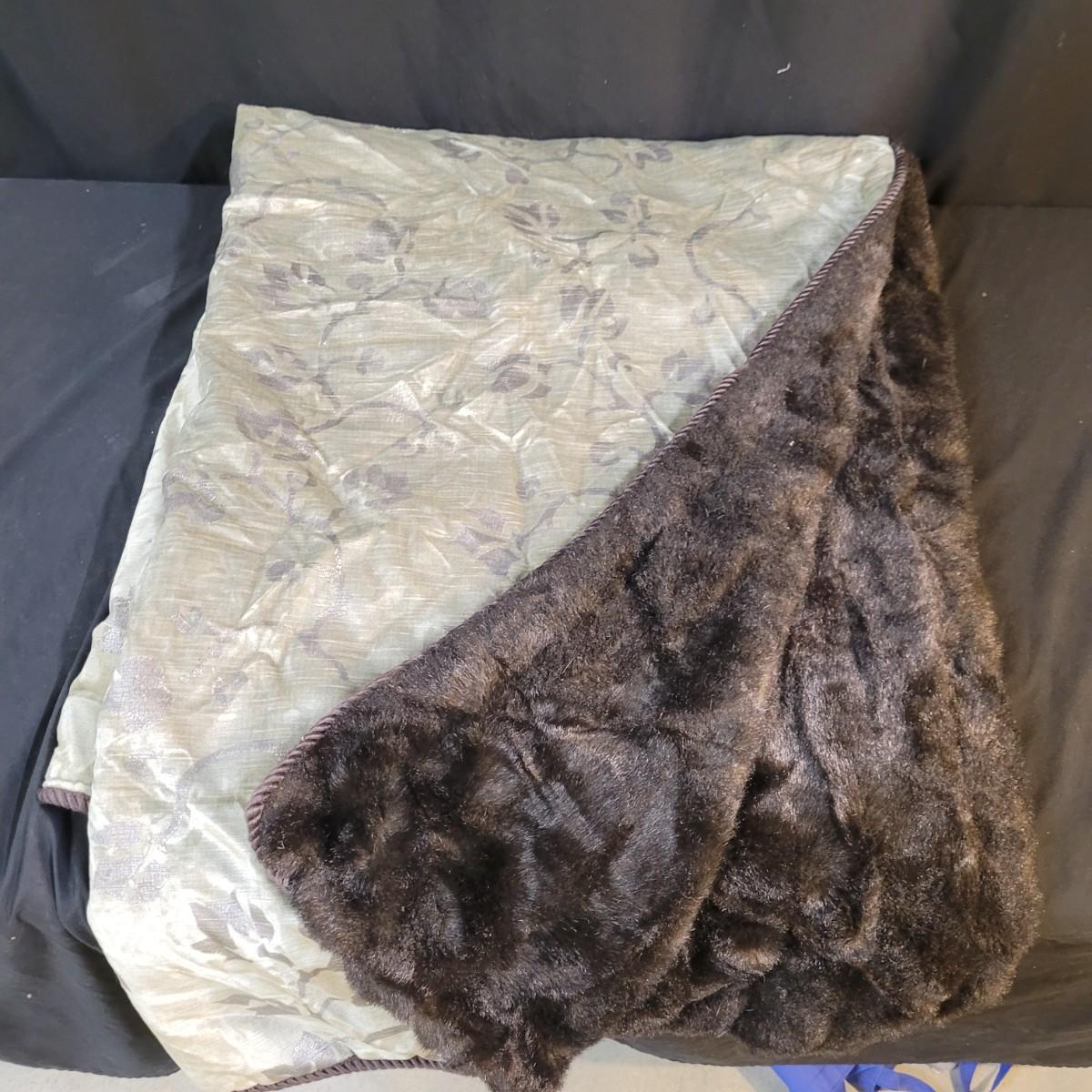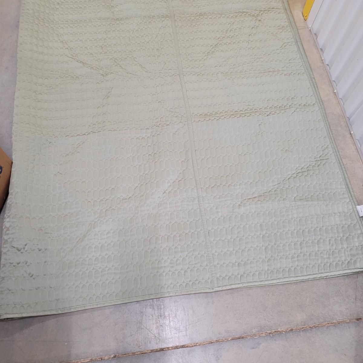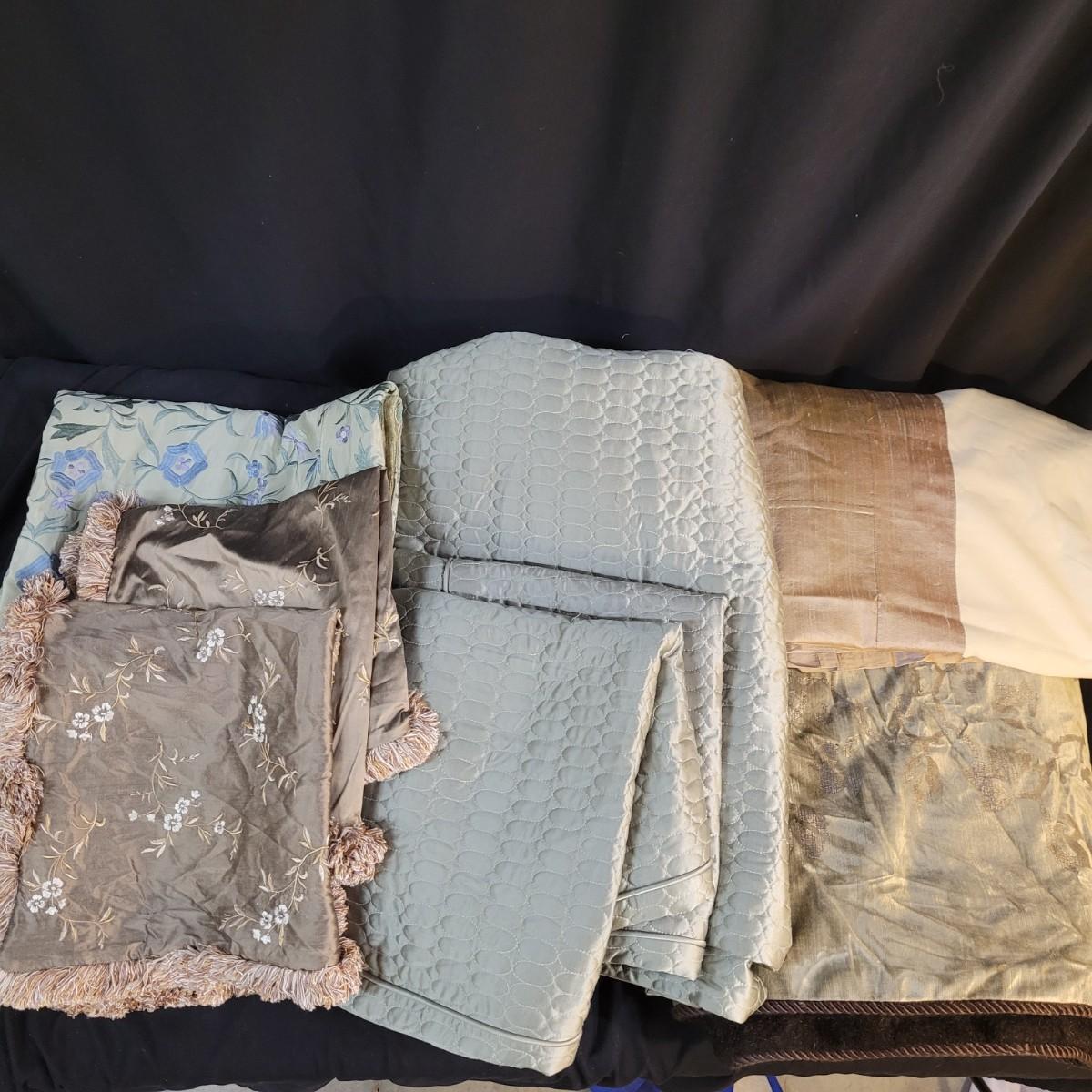 Queen bedding items include satin like sage green quilted blanket, two matching shams, and a taupe silk like bedskirt. Other items include two brown silk shams with embroidered flowers (measure approximately 28"square), heavy velvet sage green blanket with silver painted flowers and faux fur backing (measures approximately 68"L x52"W), sage green silk like blanket with embroidered flowers and olive green velvet backing (measures approximately 68"L x43"W). Zippers function. Shipping available.
