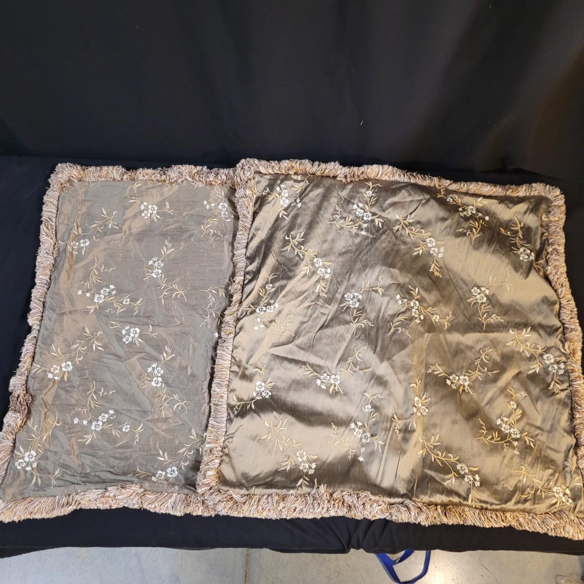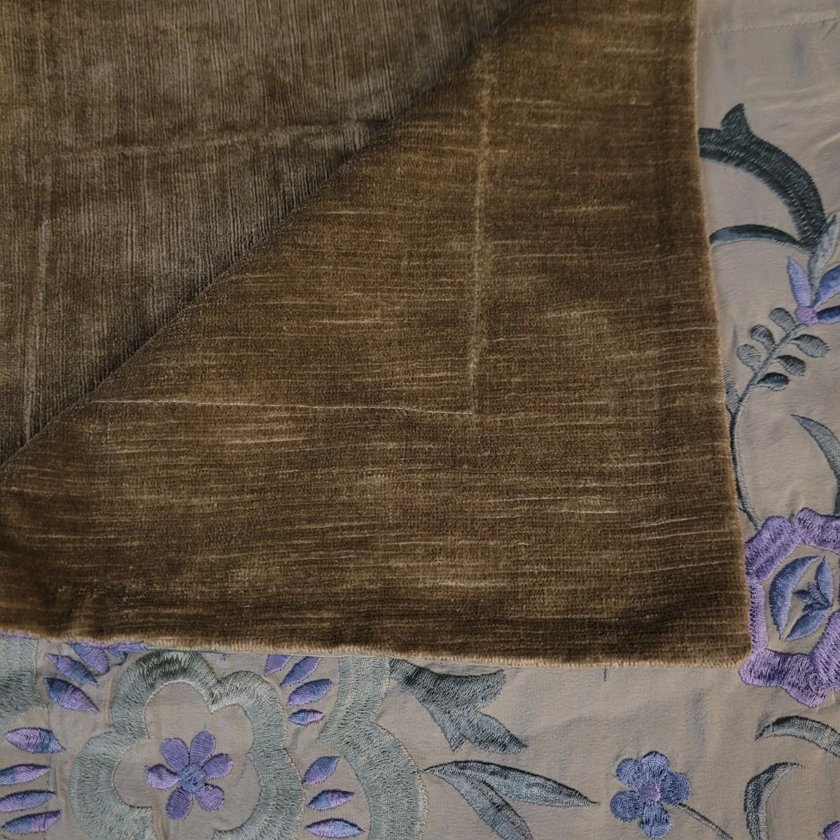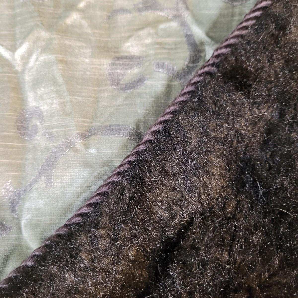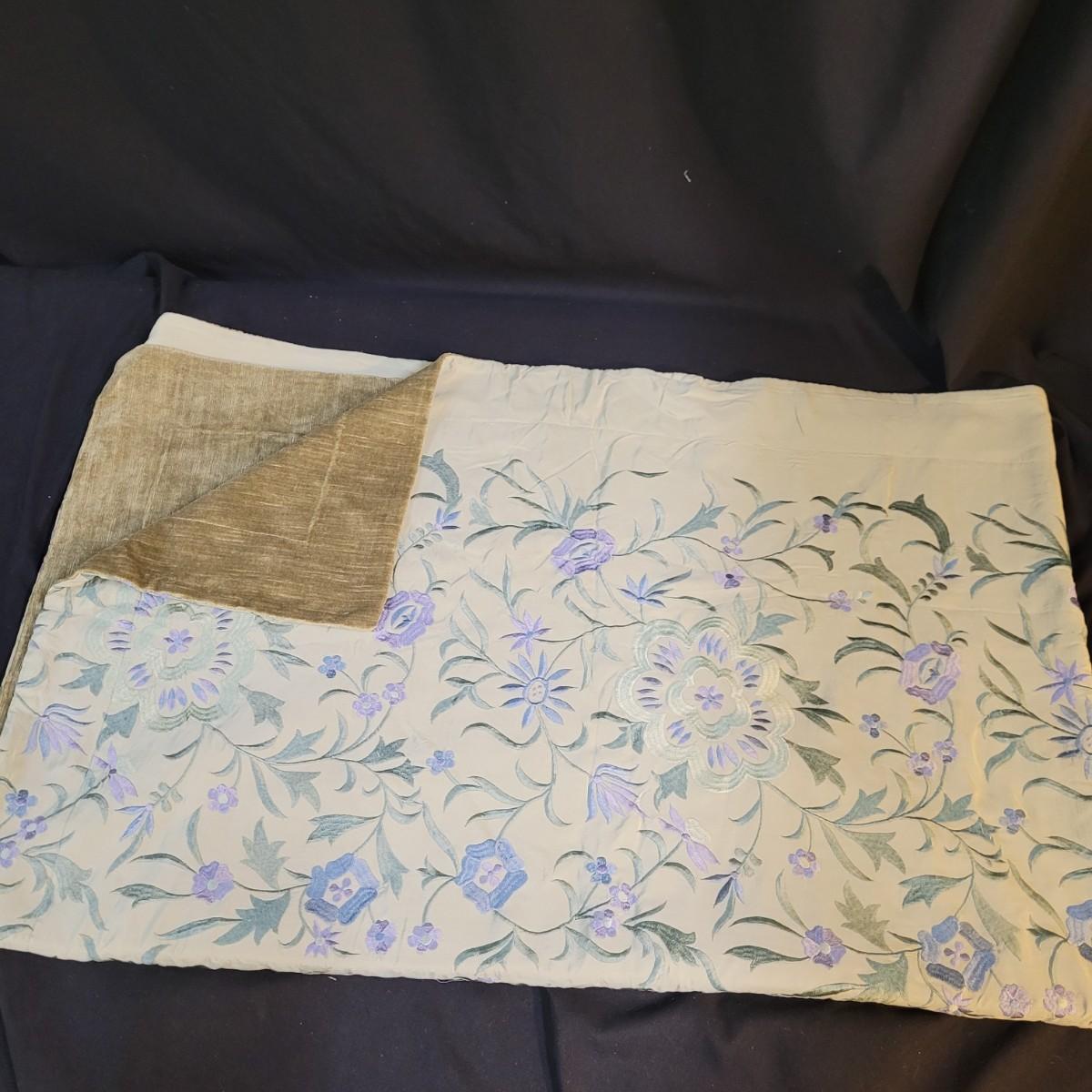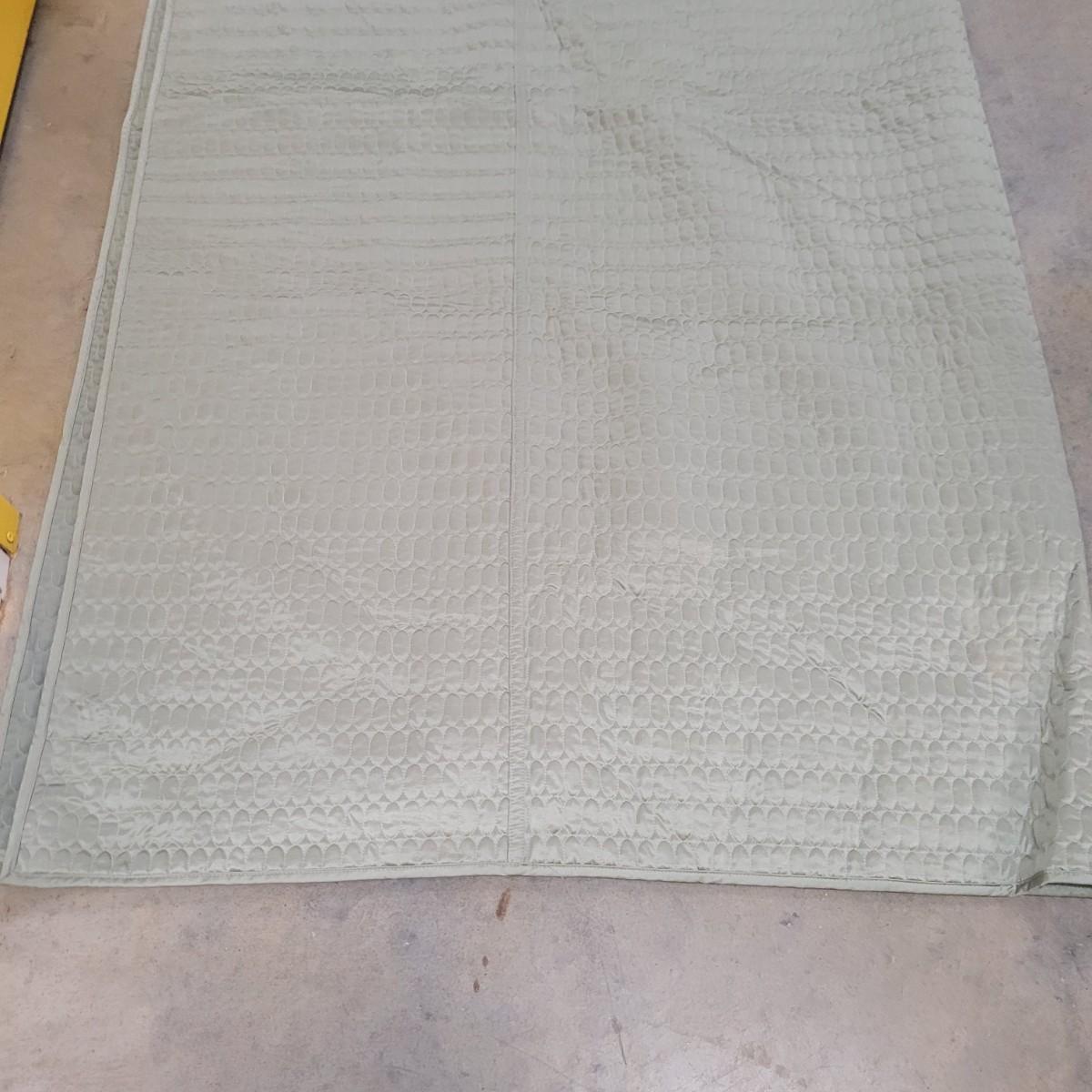 Queen bedding items include satin like sage green quilted blanket, two matching shams, and a taupe silk like bedskirt. Other items include two brown silk shams with embroidered flowers (measure approximately 28"square), heavy velvet sage green blanket with silver painted flowers and faux fur backing (measures approximately 68"L x52"W), sage green silk like blanket with embroidered flowers and olive green velvet backing (measures approximately 68"L x43"W). Zippers function. Shipping available.