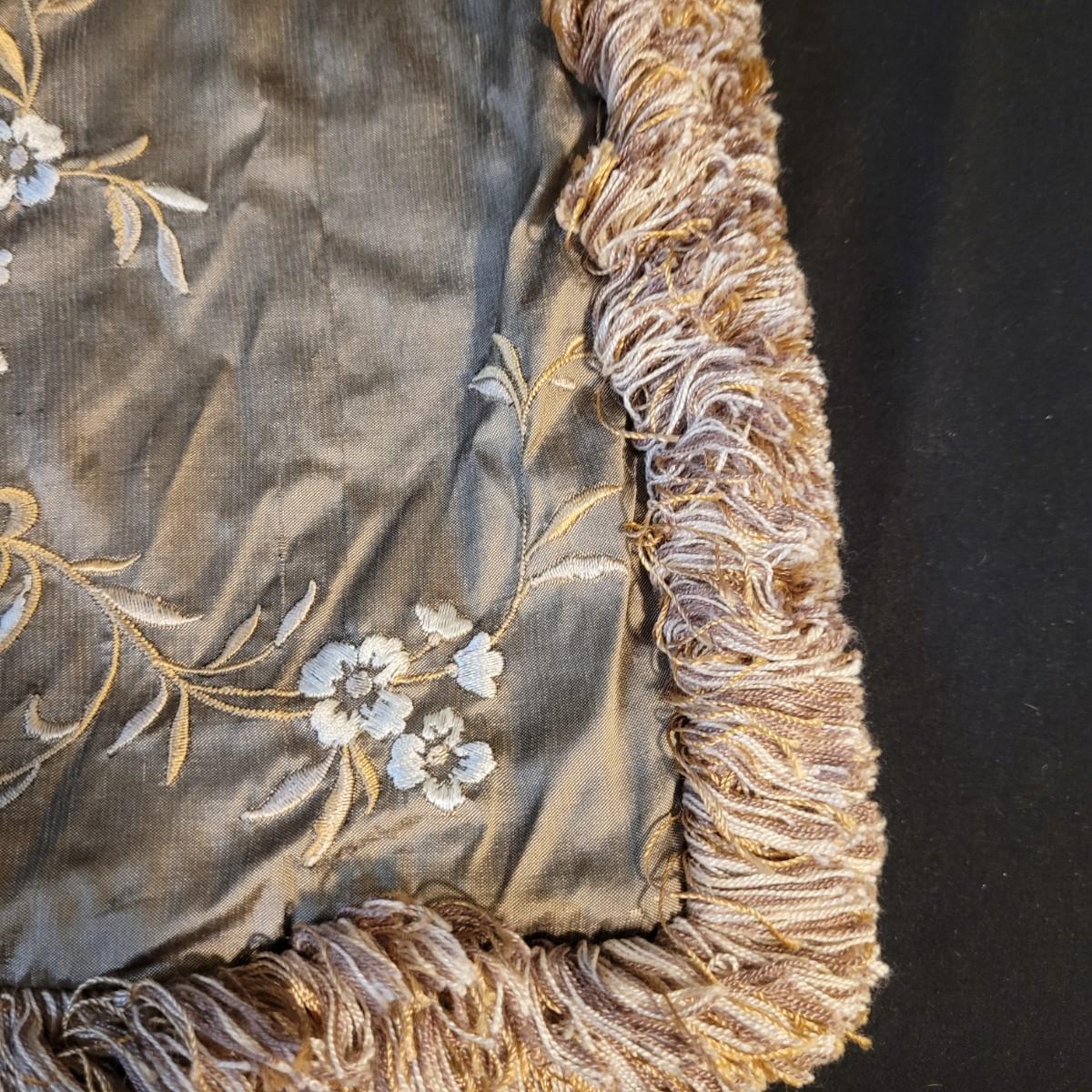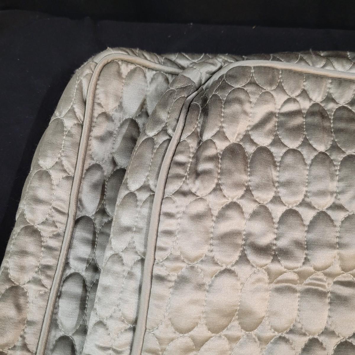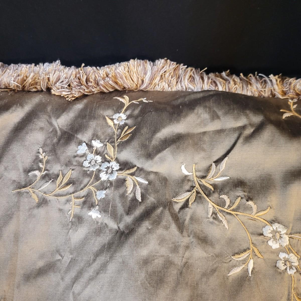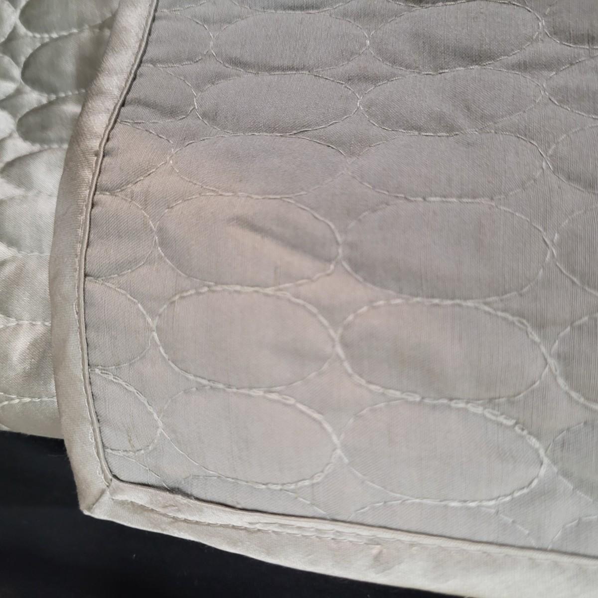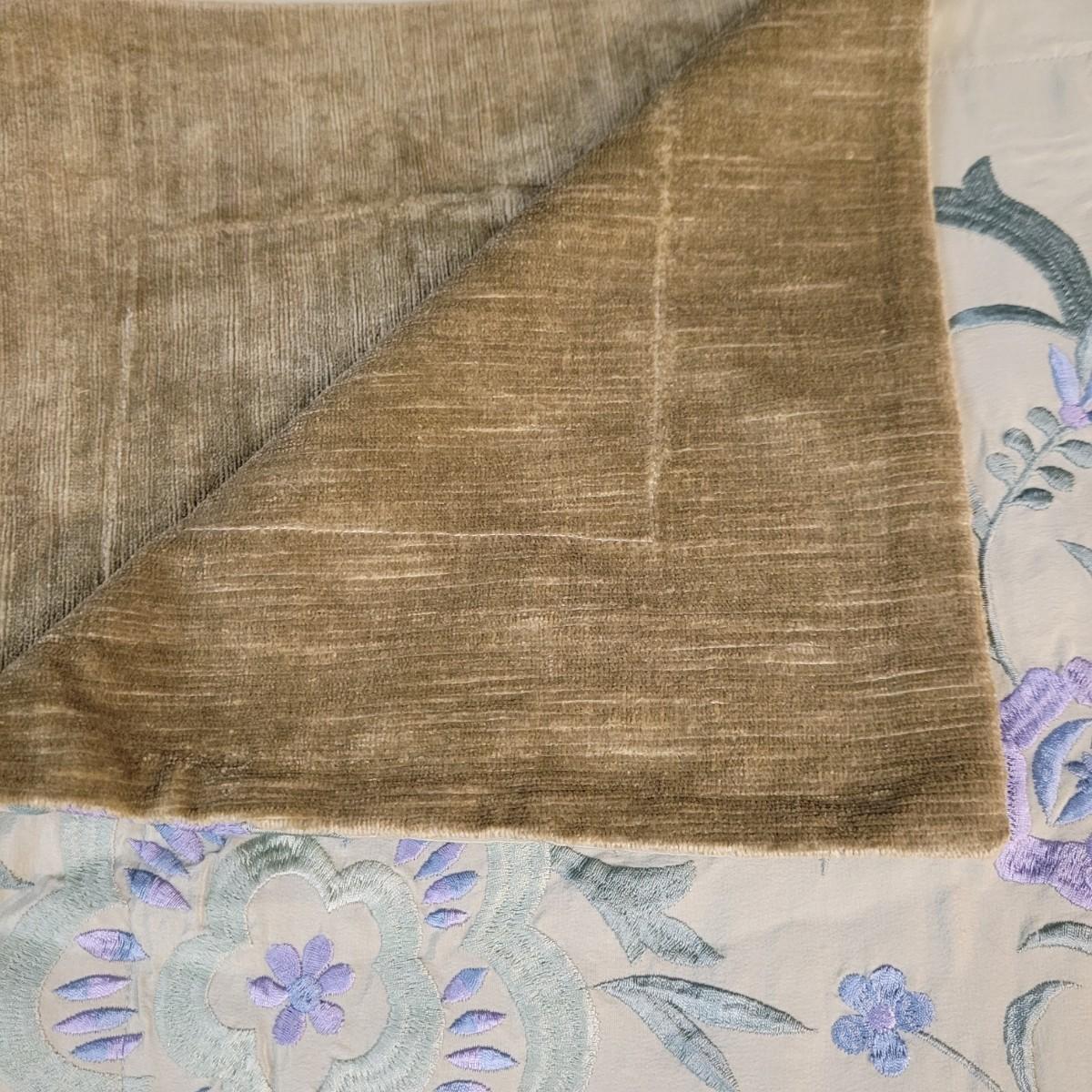 Queen bedding items include satin like sage green quilted blanket, two matching shams, and a taupe silk like bedskirt. Other items include two brown silk shams with embroidered flowers (measure approximately 28"square), heavy velvet sage green blanket with silver painted flowers and faux fur backing (measures approximately 68"L x52"W), sage green silk like blanket with embroidered flowers and olive green velvet backing (measures approximately 68"L x43"W). Zippers function. Shipping available.