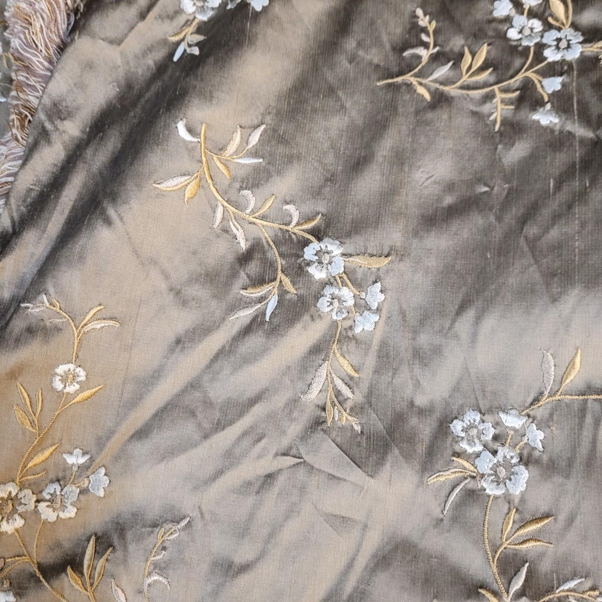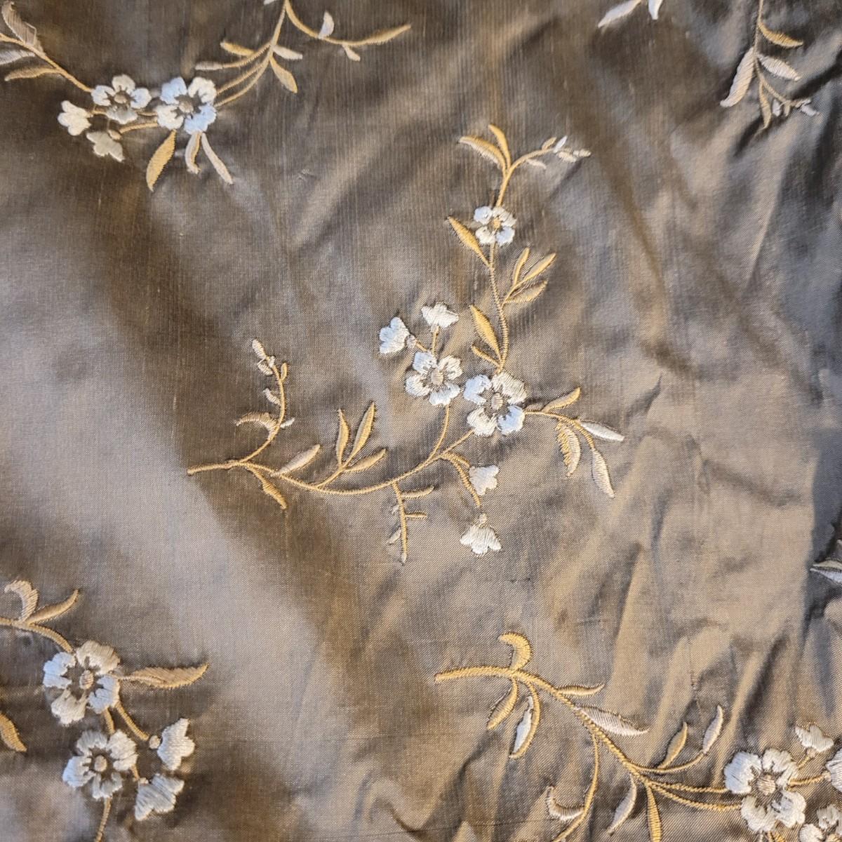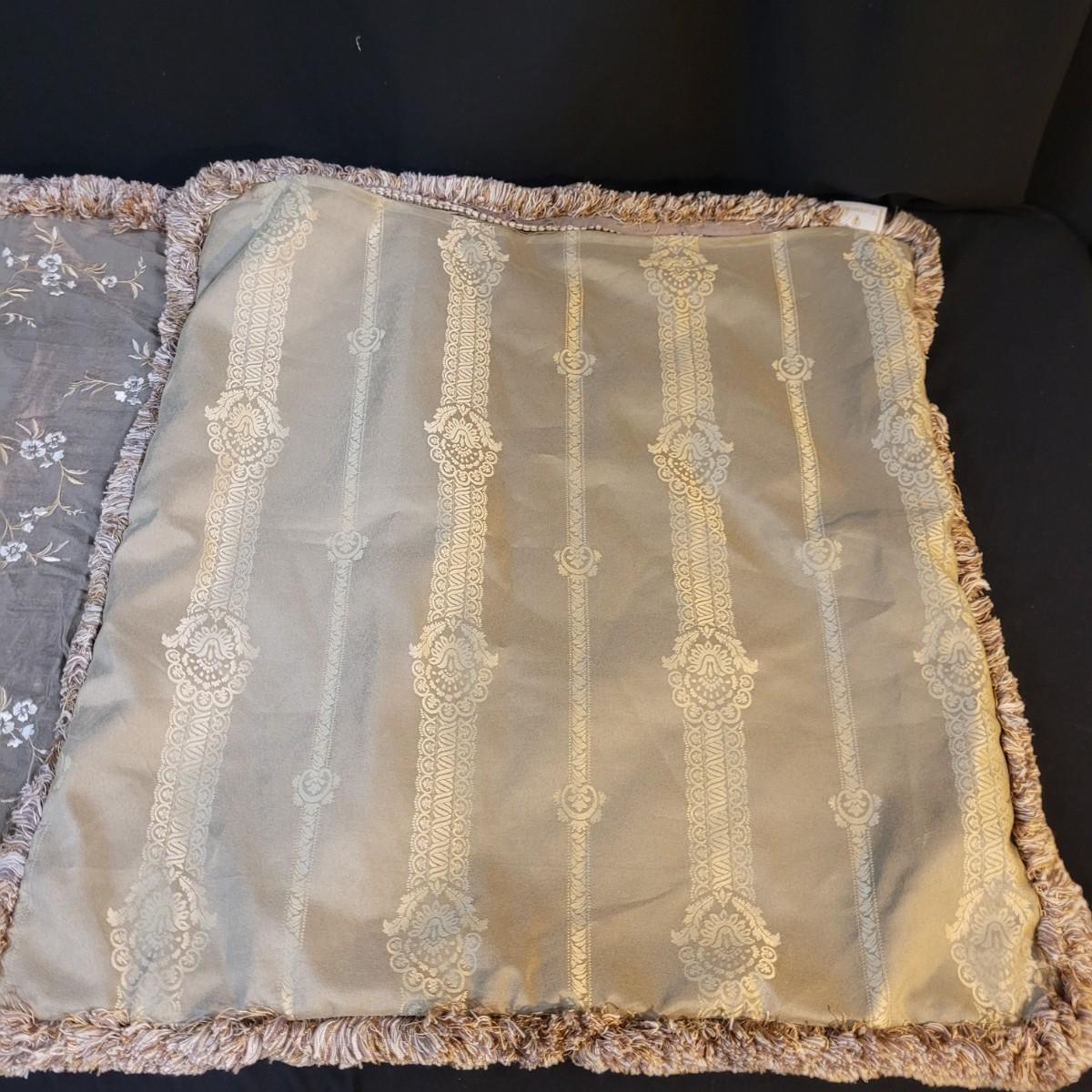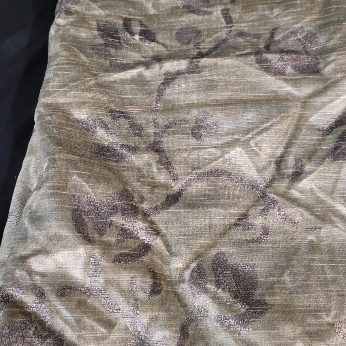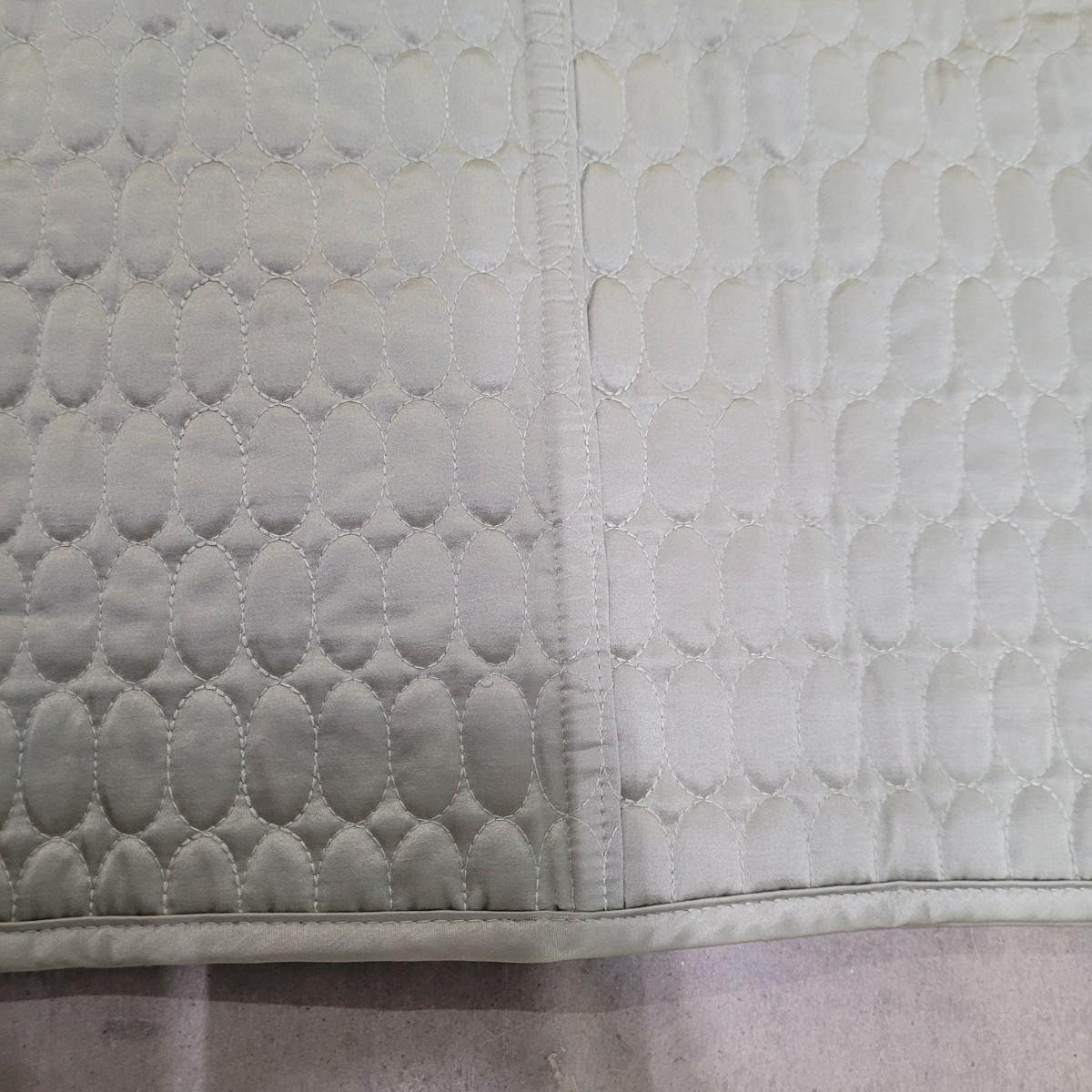 Queen bedding items include satin like sage green quilted blanket, two matching shams, and a taupe silk like bedskirt. Other items include two brown silk shams with embroidered flowers (measure approximately 28"square), heavy velvet sage green blanket with silver painted flowers and faux fur backing (measures approximately 68"L x52"W), sage green silk like blanket with embroidered flowers and olive green velvet backing (measures approximately 68"L x43"W). Zippers function. Shipping available.