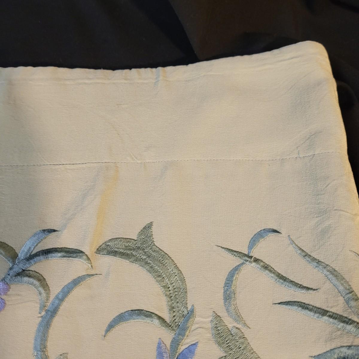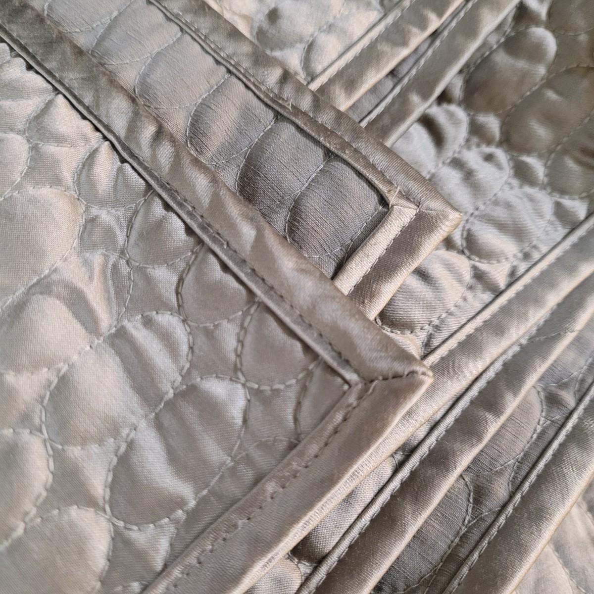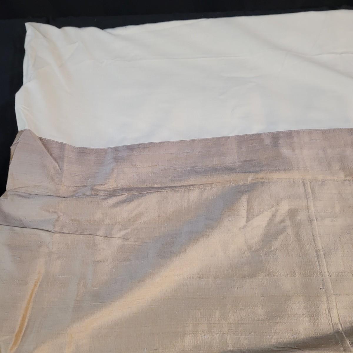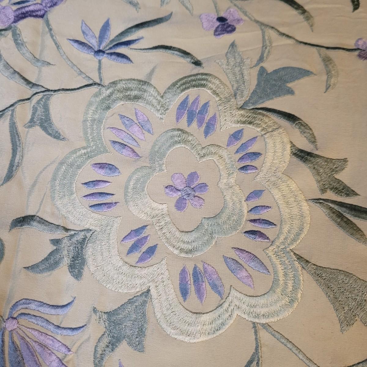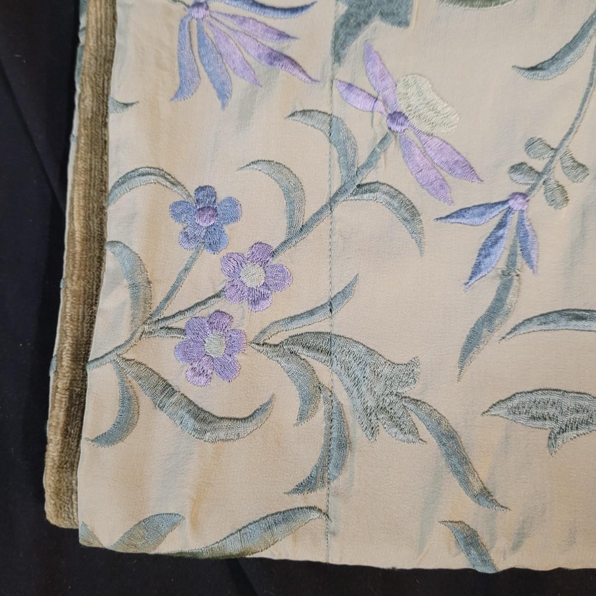 Queen bedding items include satin like sage green quilted blanket, two matching shams, and a taupe silk like bedskirt. Other items include two brown silk shams with embroidered flowers (measure approximately 28"square), heavy velvet sage green blanket with silver painted flowers and faux fur backing (measures approximately 68"L x52"W), sage green silk like blanket with embroidered flowers and olive green velvet backing (measures approximately 68"L x43"W). Zippers function. Shipping available.