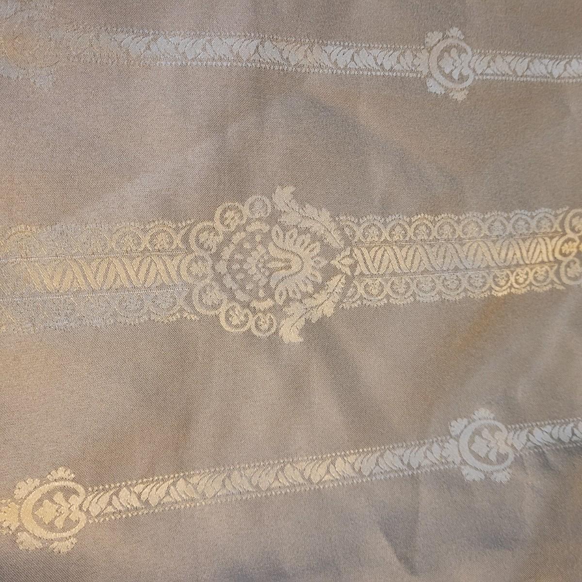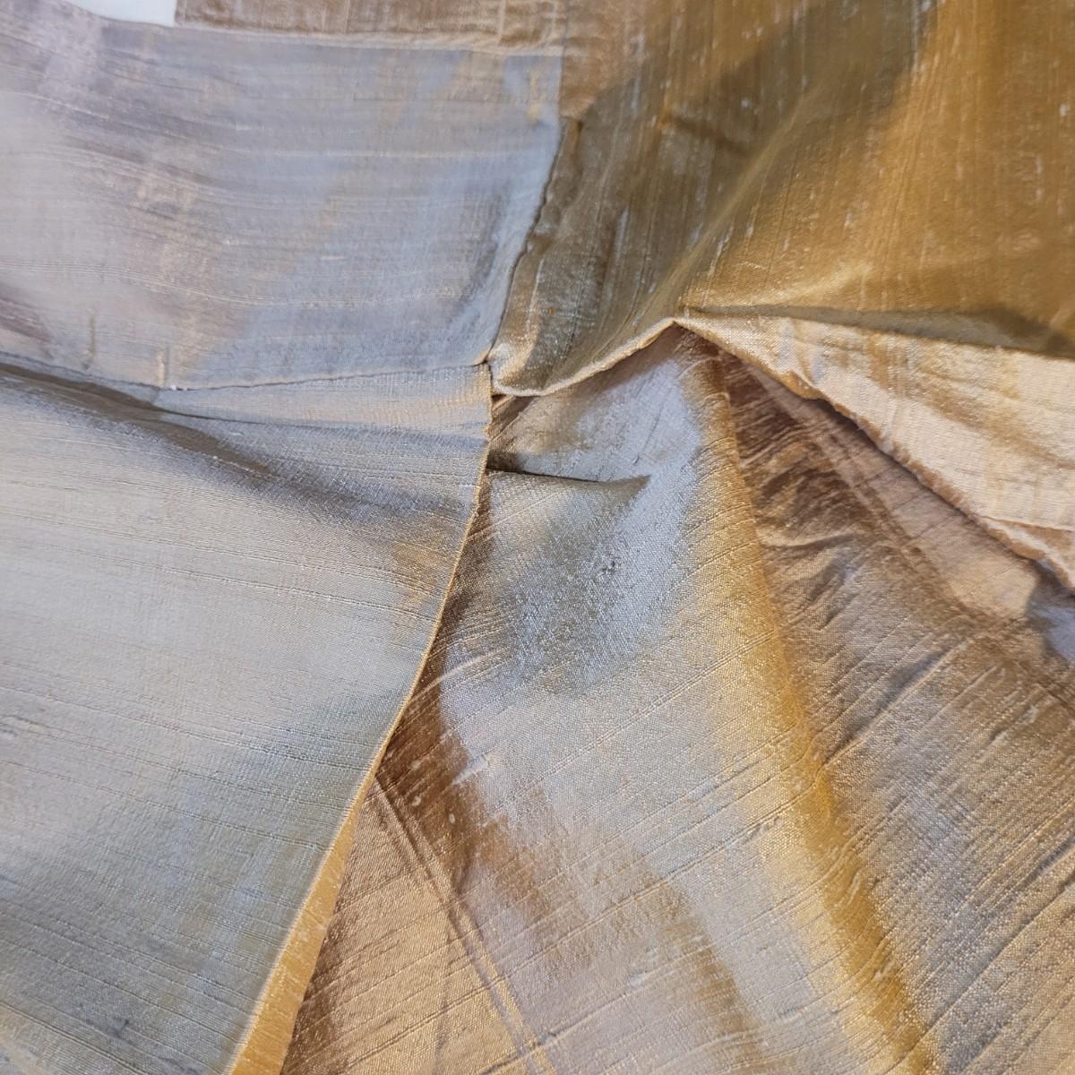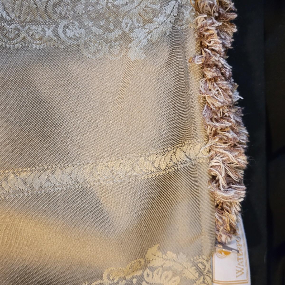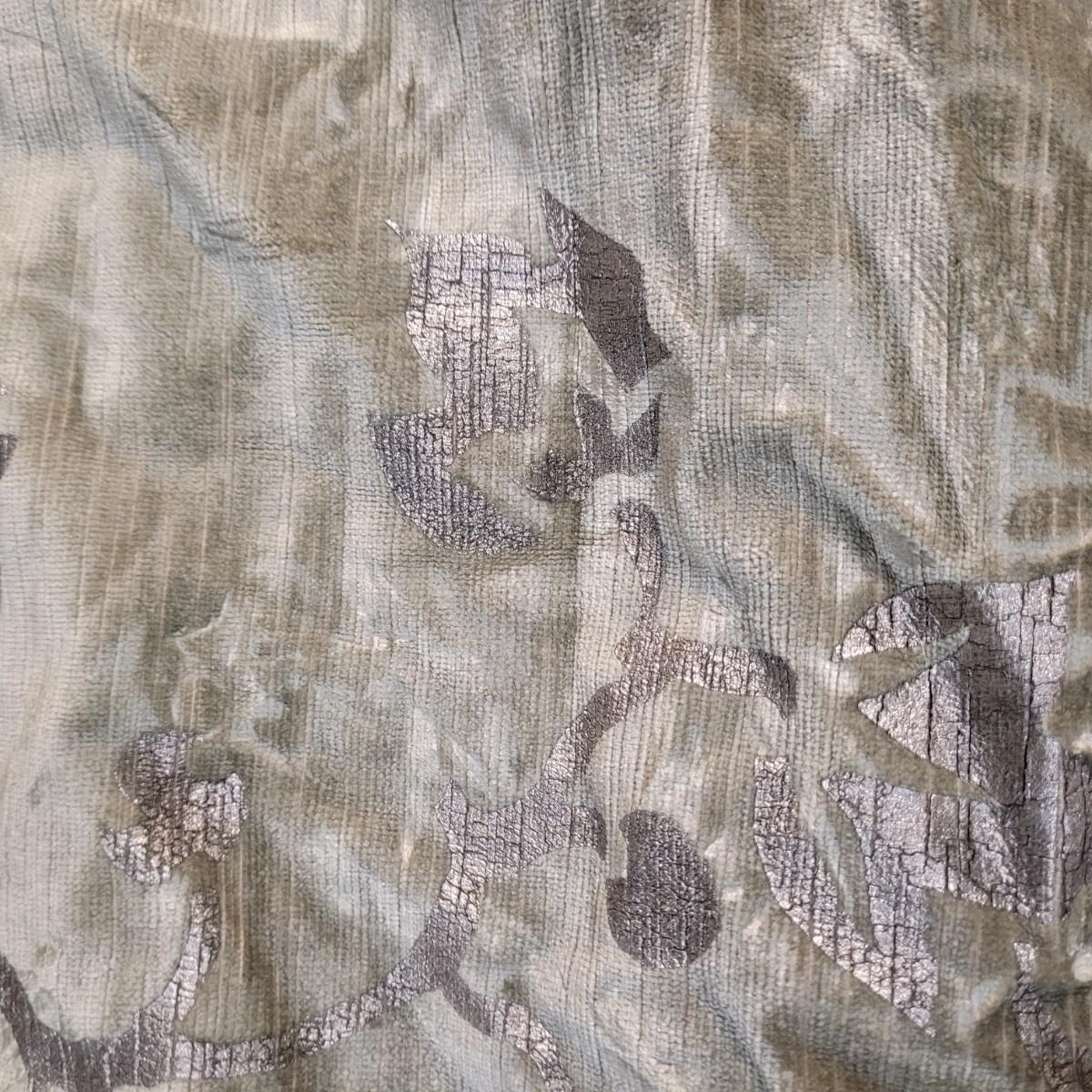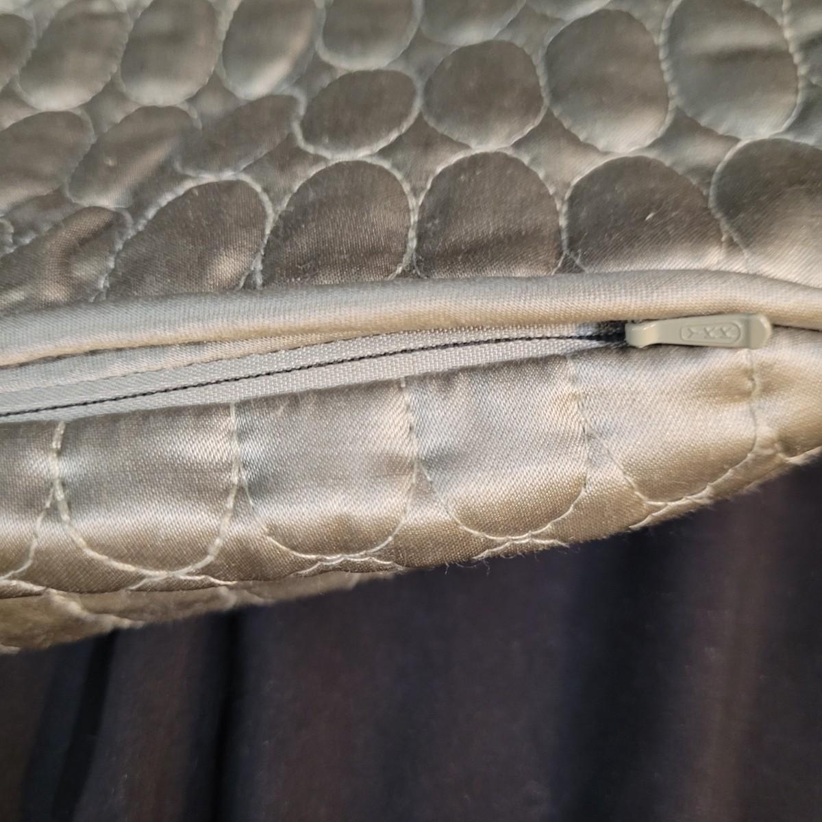 Queen bedding items include satin like sage green quilted blanket, two matching shams, and a taupe silk like bedskirt. Other items include two brown silk shams with embroidered flowers (measure approximately 28"square), heavy velvet sage green blanket with silver painted flowers and faux fur backing (measures approximately 68"L x52"W), sage green silk like blanket with embroidered flowers and olive green velvet backing (measures approximately 68"L x43"W). Zippers function. Shipping available.