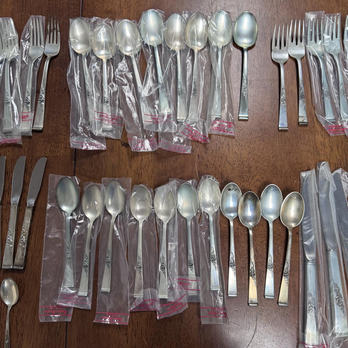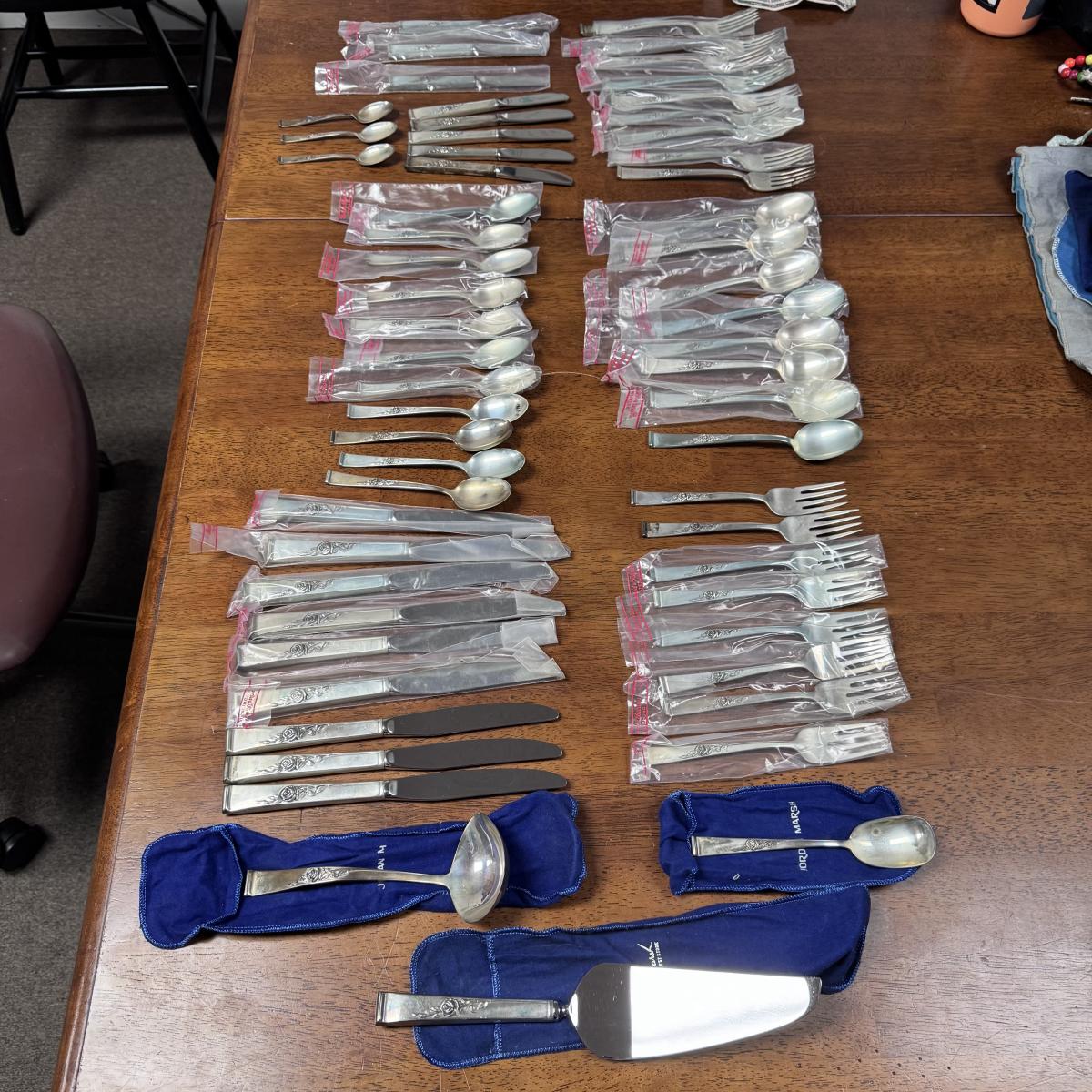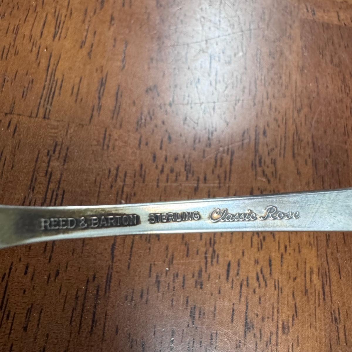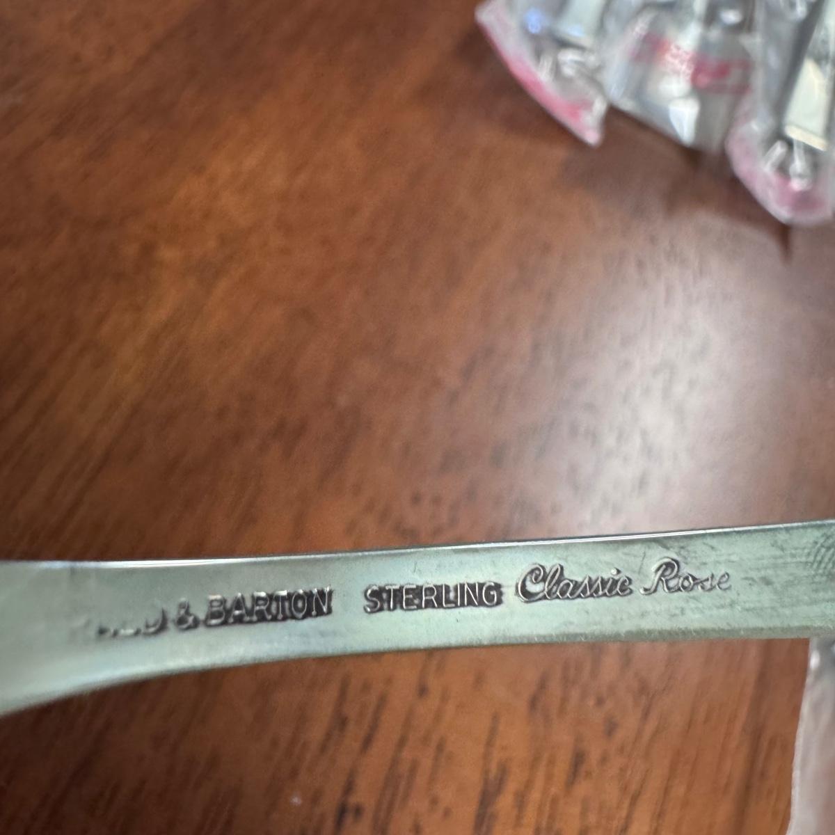 This lot includes a large collection of sterling silverware from the “Classic Rose” collection by Reed and Barton. You’ll find nine knives, eight soup spoons, seven salad forks, nine regular forks, eleven regular spoons, three tiny coffee spoons, and eight smaller knives. You’ll also find one pie serving utensil, a soup serving spoon, and rounded rectangular spoon. All pieces are marked with “Reed & Barton.” Some pieces have a stainless top with a sterling handle, including the knives and the pie serving utensil. The pie serving utensil is the largest item that measures 10” long. The last three utensils pictured came in a blue sleeve. The flatware pictured in plastic, have never been opened. Starting bid is at/or near melt value. Shipping available.