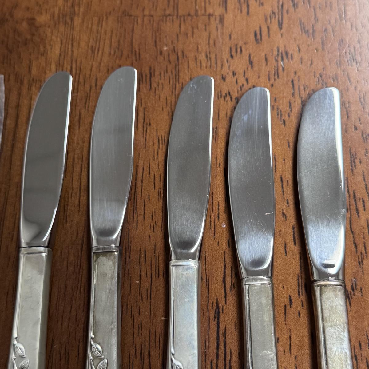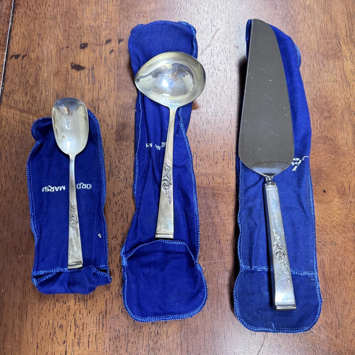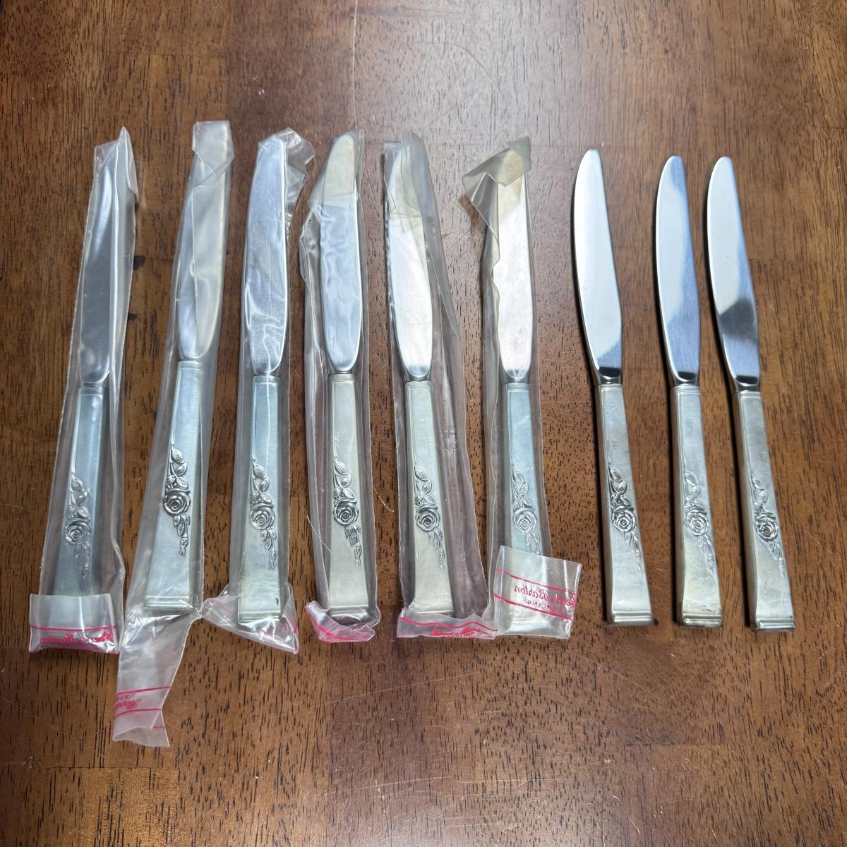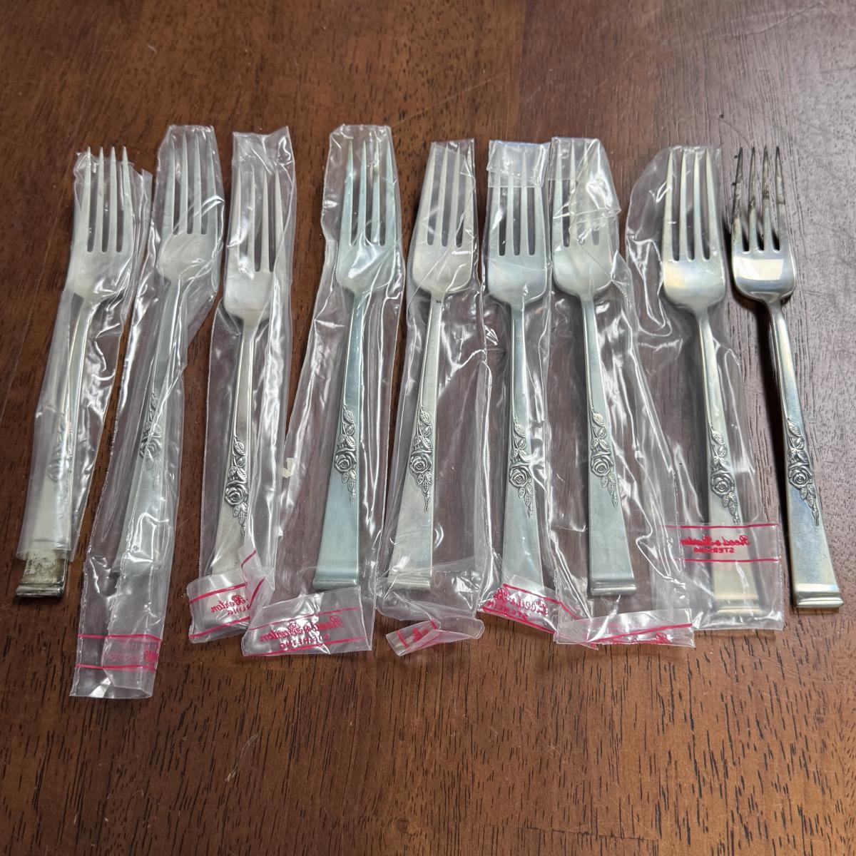 This lot includes a large collection of sterling silverware from the “Classic Rose” collection by Reed and Barton. You’ll find nine knives, eight soup spoons, seven salad forks, nine regular forks, eleven regular spoons, three tiny coffee spoons, and eight smaller knives. You’ll also find one pie serving utensil, a soup serving spoon, and rounded rectangular spoon. All pieces are marked with “Reed & Barton.” Some pieces have a stainless top with a sterling handle, including the knives and the pie serving utensil. The pie serving utensil is the largest item that measures 10” long. The last three utensils pictured came in a blue sleeve. The flatware pictured in plastic, have never been opened. Starting bid is at/or near melt value. Shipping available.
