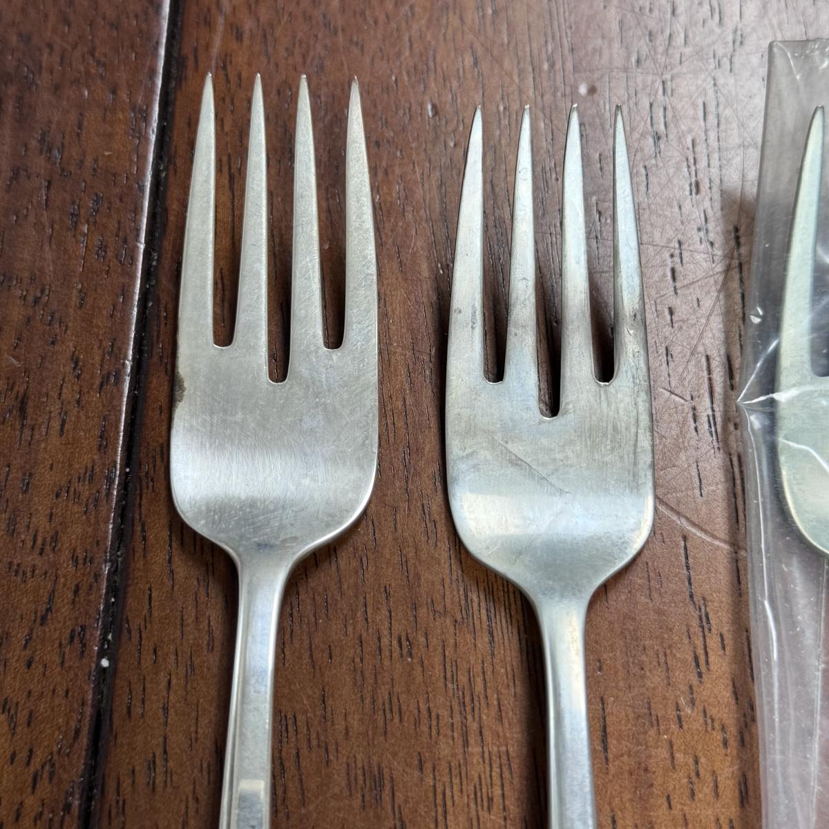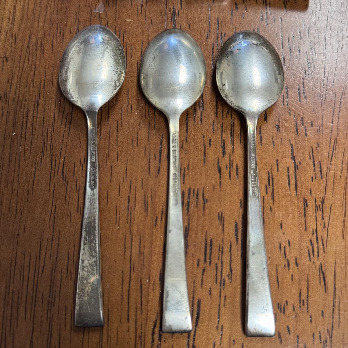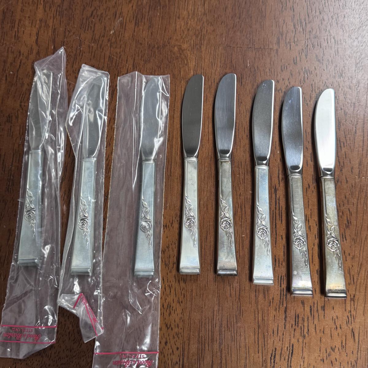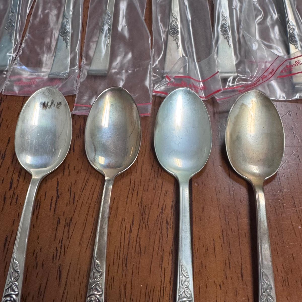 This lot includes a large collection of sterling silverware from the “Classic Rose” collection by Reed and Barton. You’ll find nine knives, eight soup spoons, seven salad forks, nine regular forks, eleven regular spoons, three tiny coffee spoons, and eight smaller knives. You’ll also find one pie serving utensil, a soup serving spoon, and rounded rectangular spoon. All pieces are marked with “Reed & Barton.” Some pieces have a stainless top with a sterling handle, including the knives and the pie serving utensil. The pie serving utensil is the largest item that measures 10” long. The last three utensils pictured came in a blue sleeve. The flatware pictured in plastic, have never been opened. Starting bid is at/or near melt value. Shipping available.