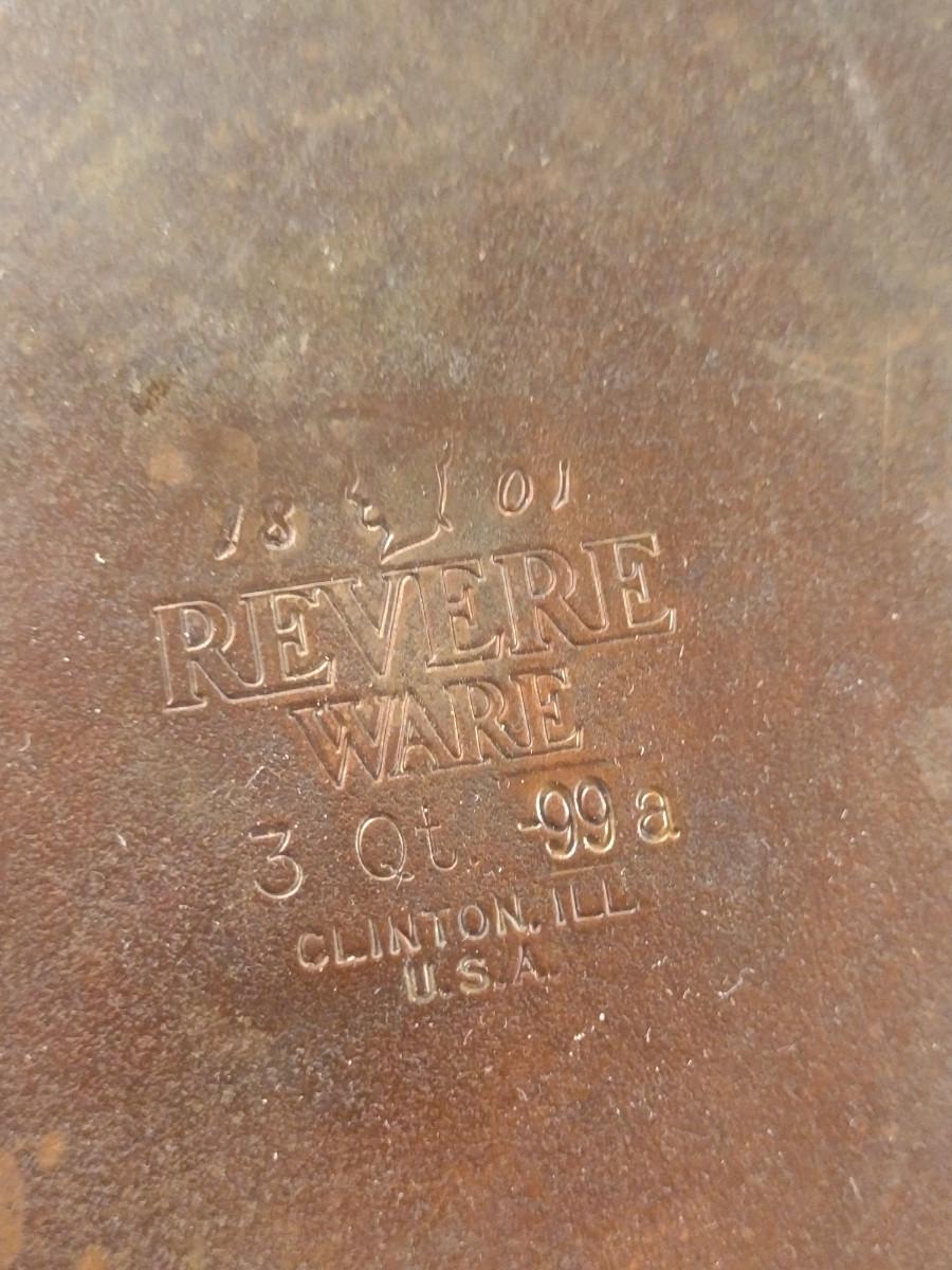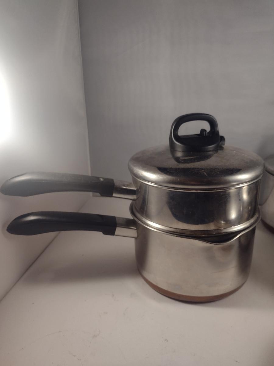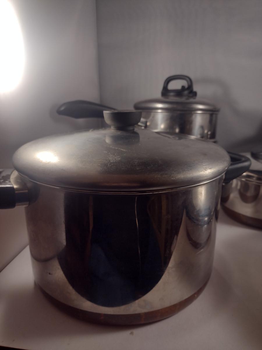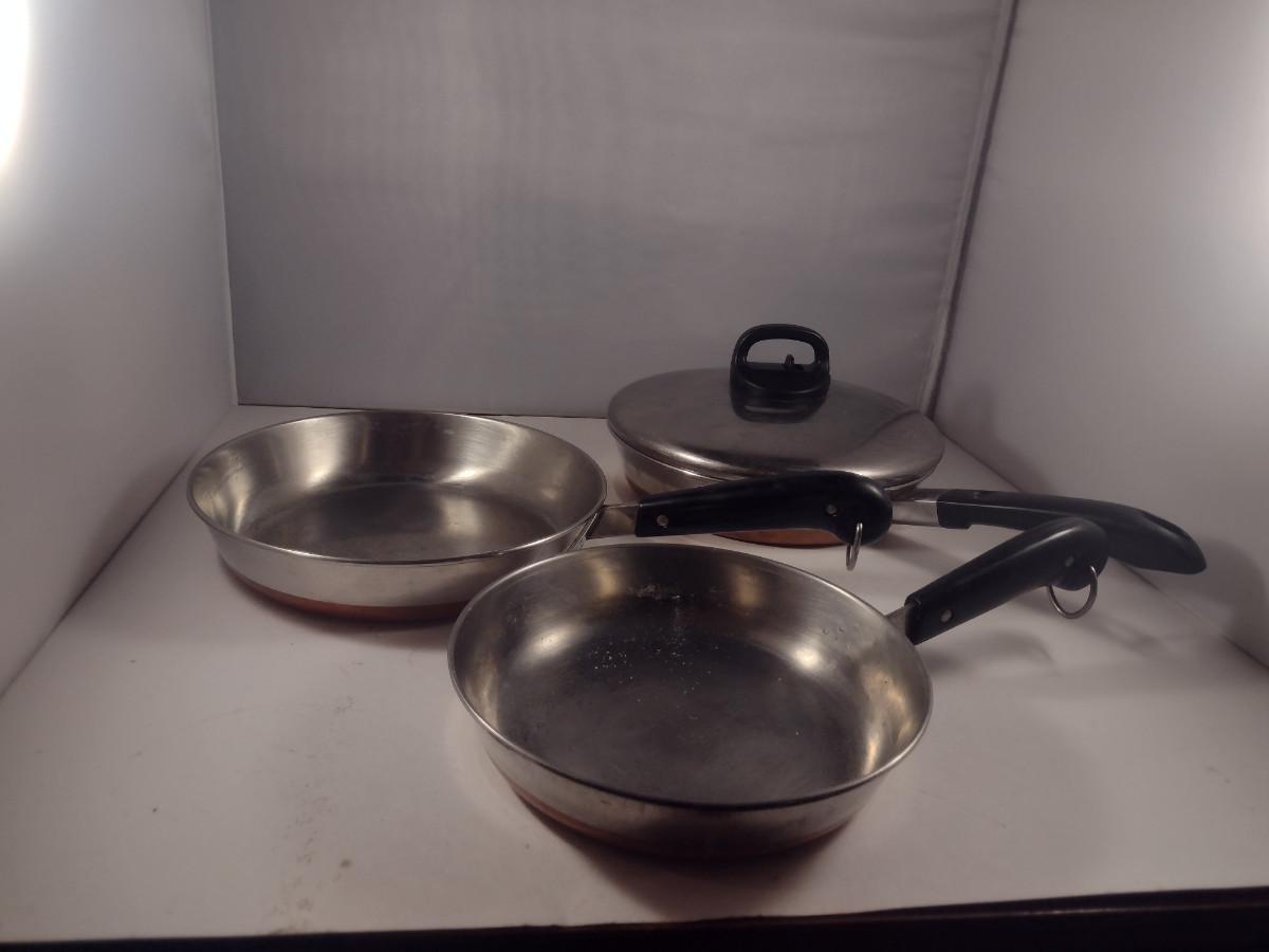 Collection of Revere Ware Cookware. All pieces in used condition. 6 qt covered pot with egg poacher, 2 1/2 qt covered pot with steamer insert, 3 qt covered pot, 1 1/2 qt covered pot, and three skillets (1-8" and 2- 9").