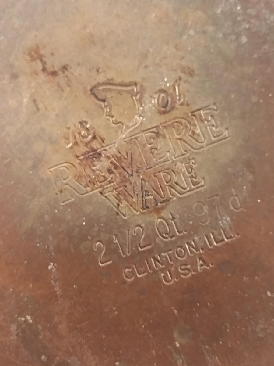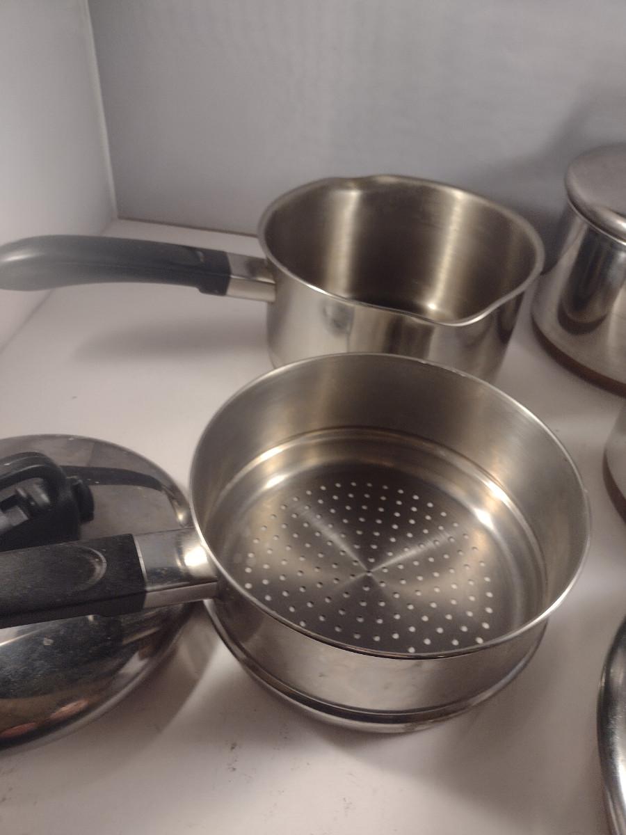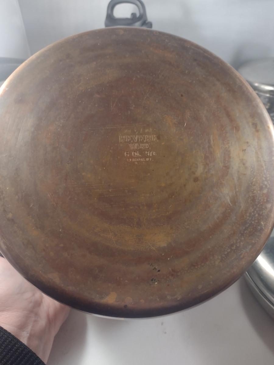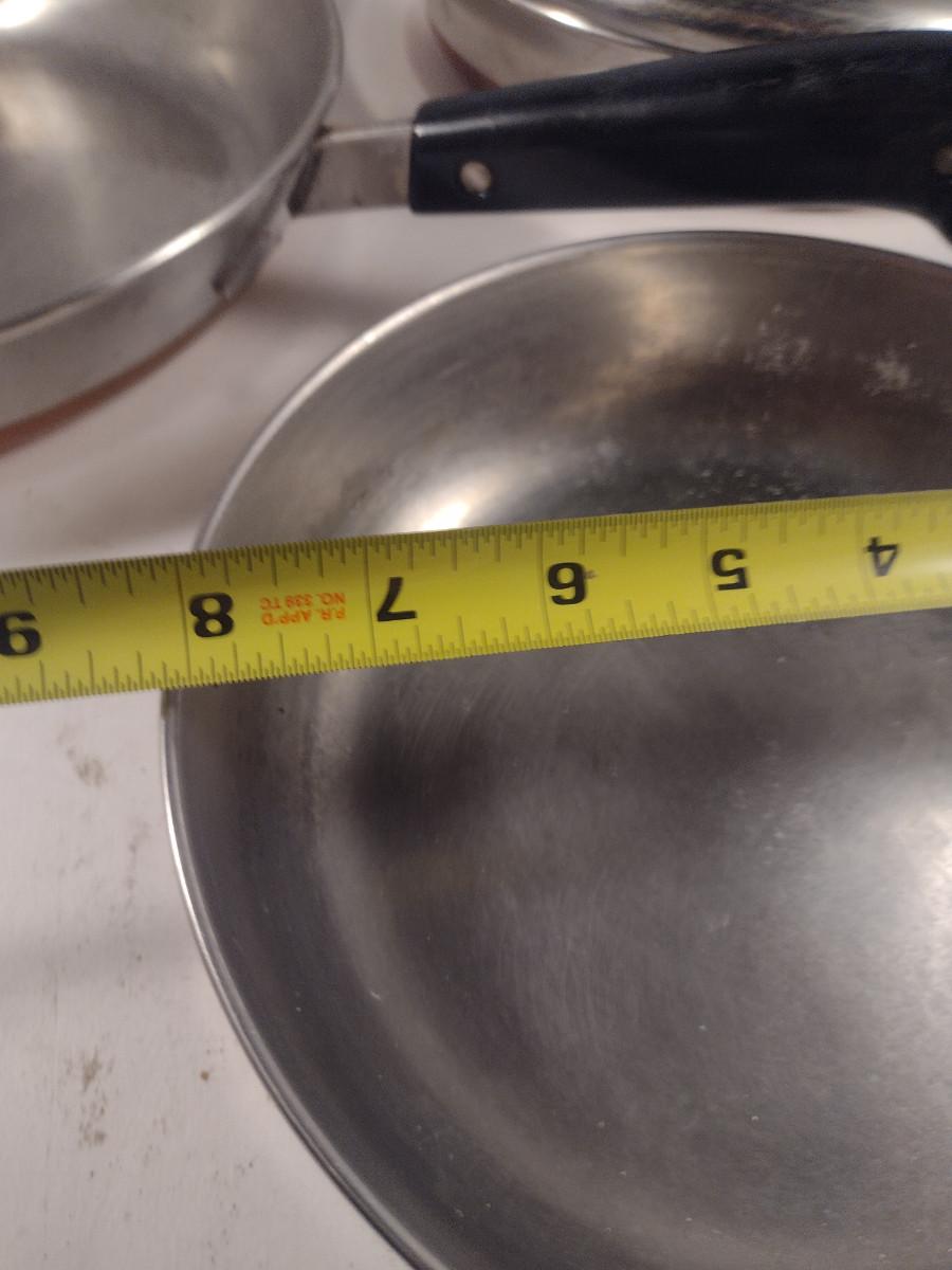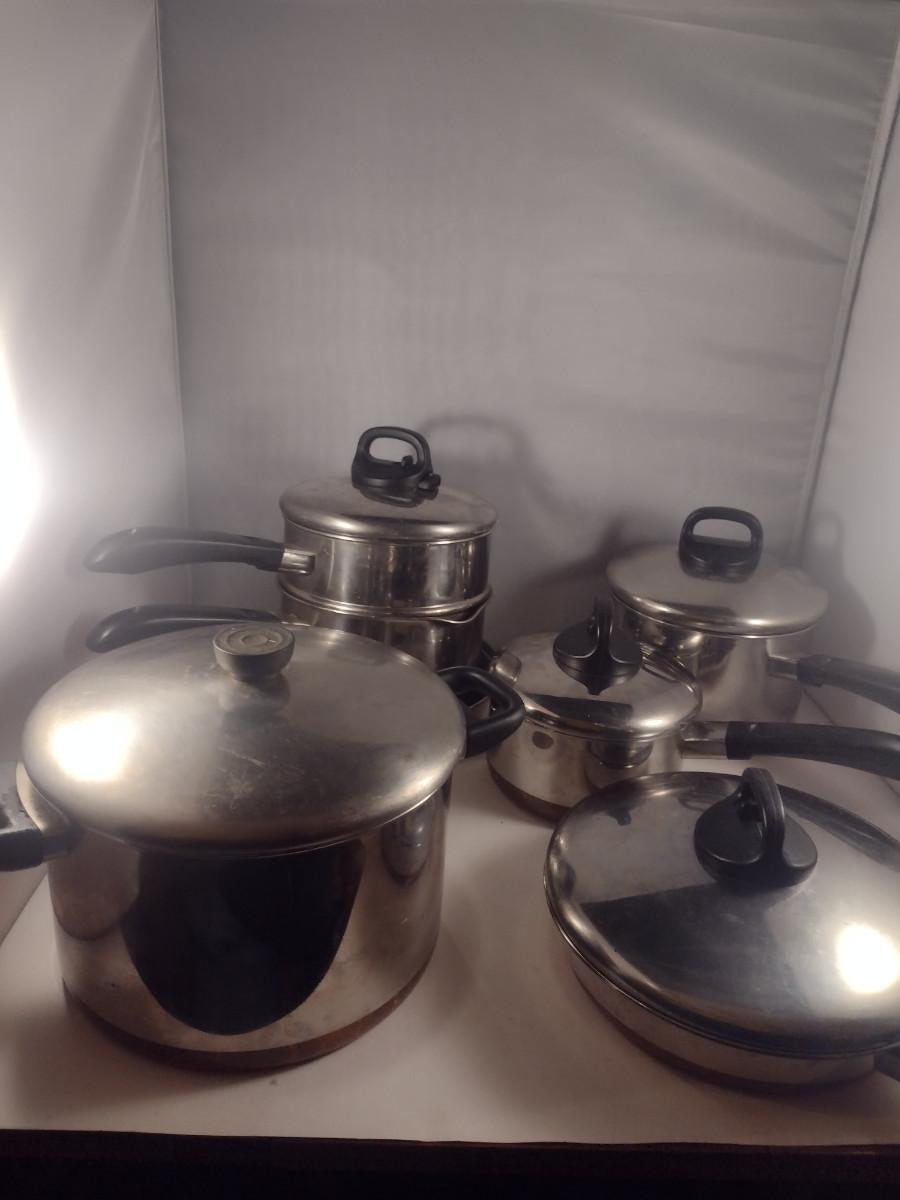 Collection of Revere Ware Cookware. All pieces in used condition. 6 qt covered pot with egg poacher, 2 1/2 qt covered pot with steamer insert, 3 qt covered pot, 1 1/2 qt covered pot, and three skillets (1-8" and 2- 9").