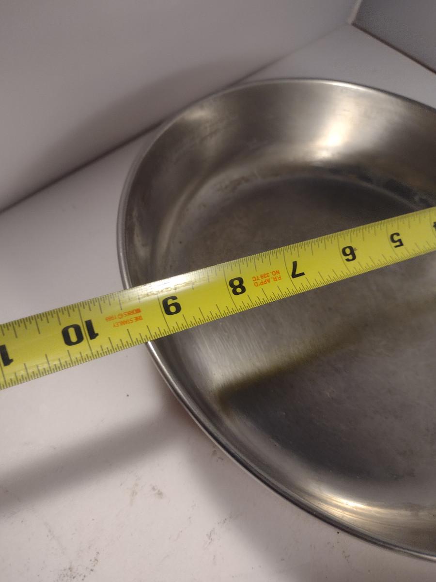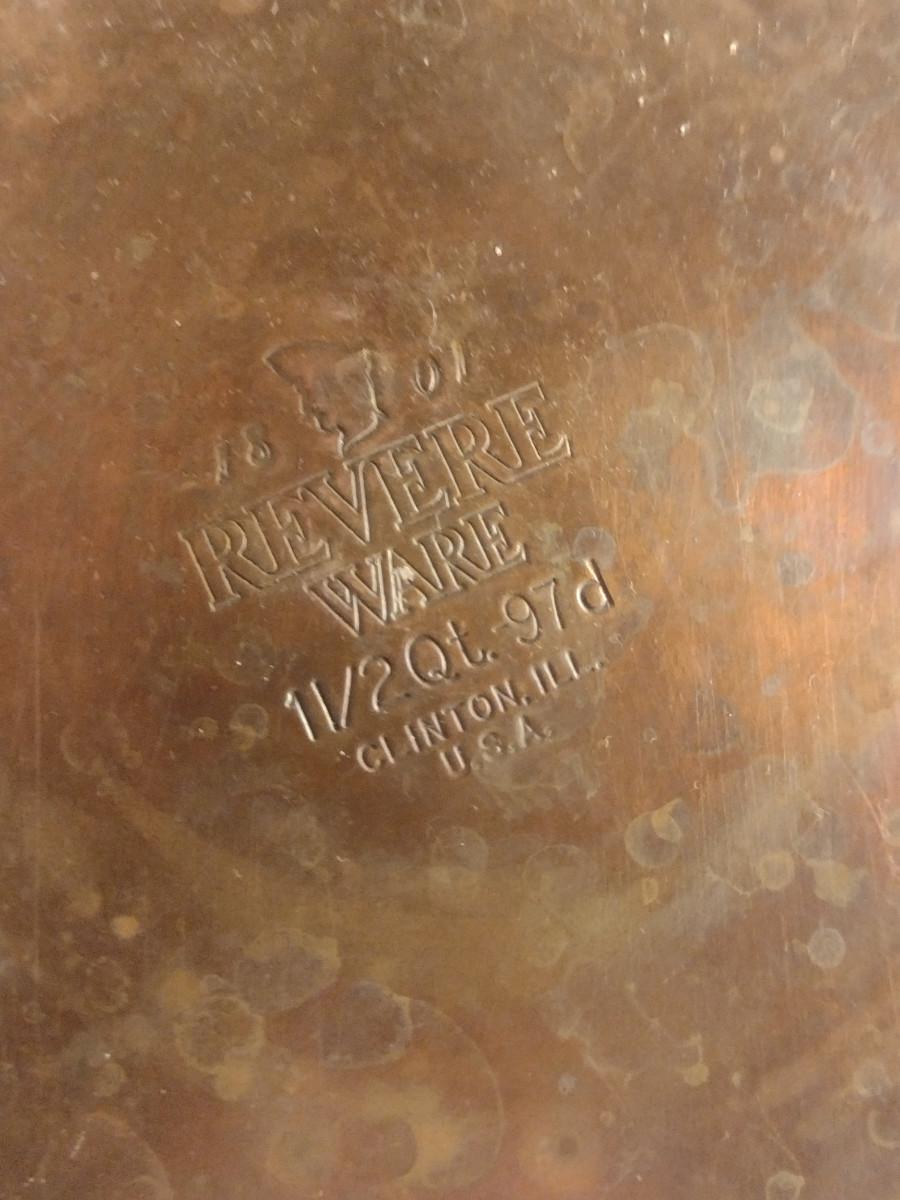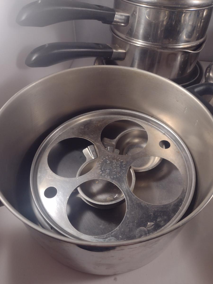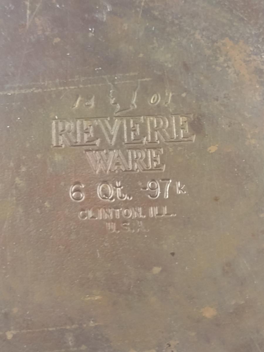Collection of Revere Ware Cookware. All pieces in used condition. 6 qt covered pot with egg poacher, 2 1/2 qt covered pot with steamer insert, 3 qt covered pot, 1 1/2 qt covered pot, and three skillets (1-8" and 2- 9").