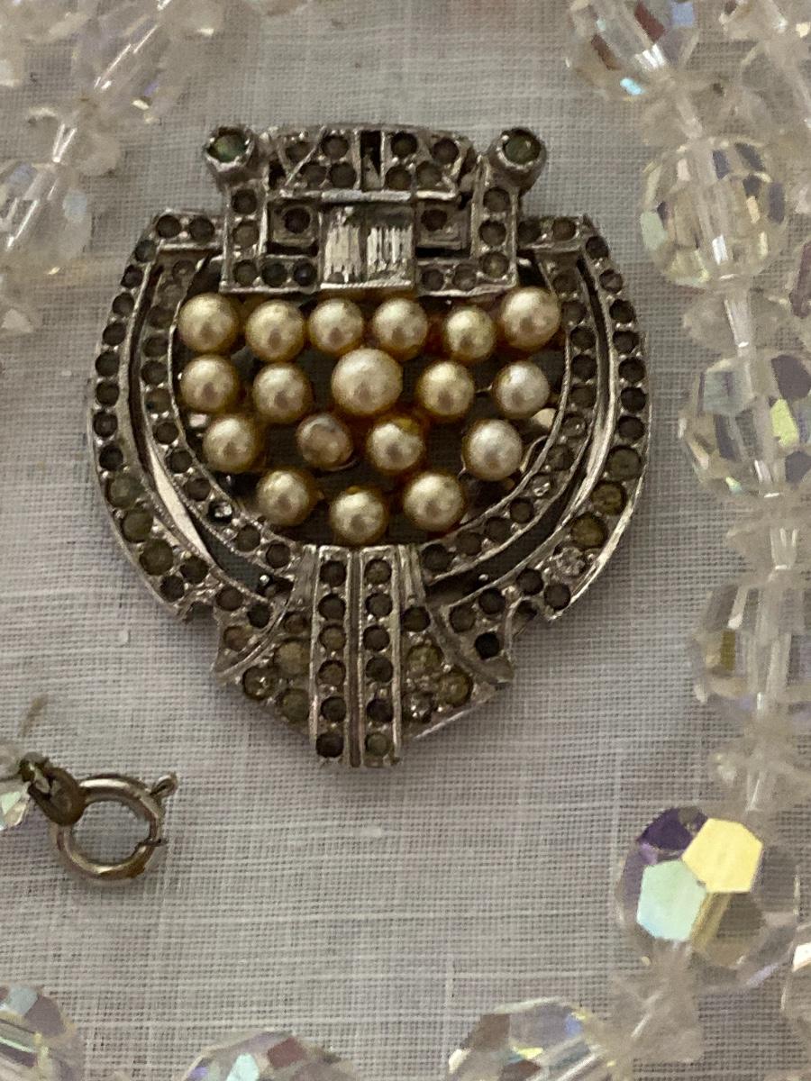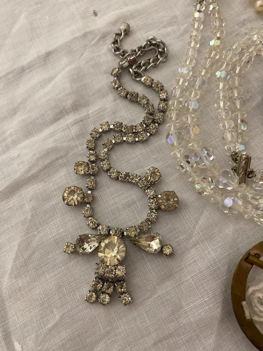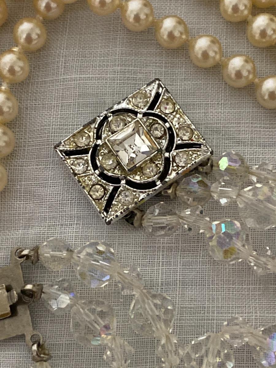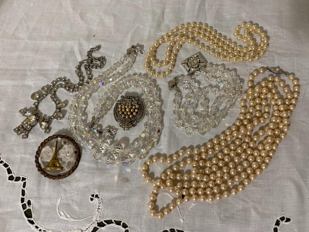 Vintage Jewelry Comprising a 54 inch glass Pearl necklace, a 30 inch glass Pearl necklace, a 7 inch three strand rhinestone bracelet, a rhinestone and pot metal shoe clip with seed pearls, a 26 inch double strand rhinestone necklace that needs a new clasp, a vintage Eiffel Tower brooch and a 12 to 15 inch adjustable rhinestone choker necklace.