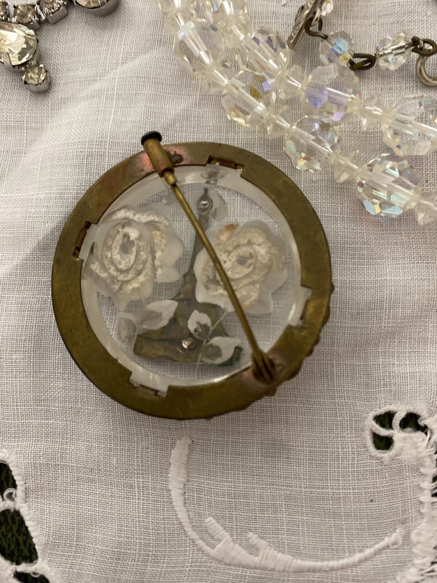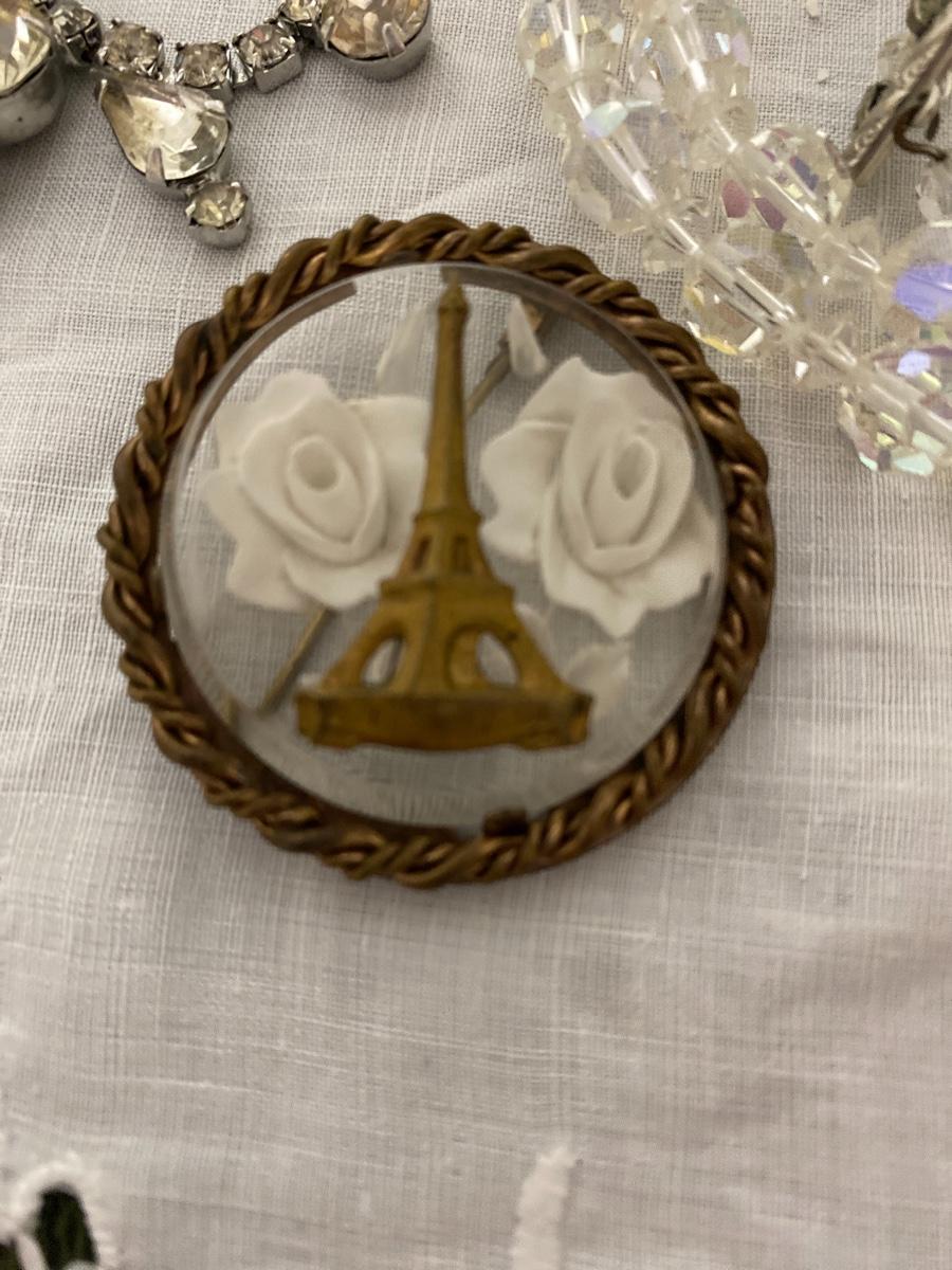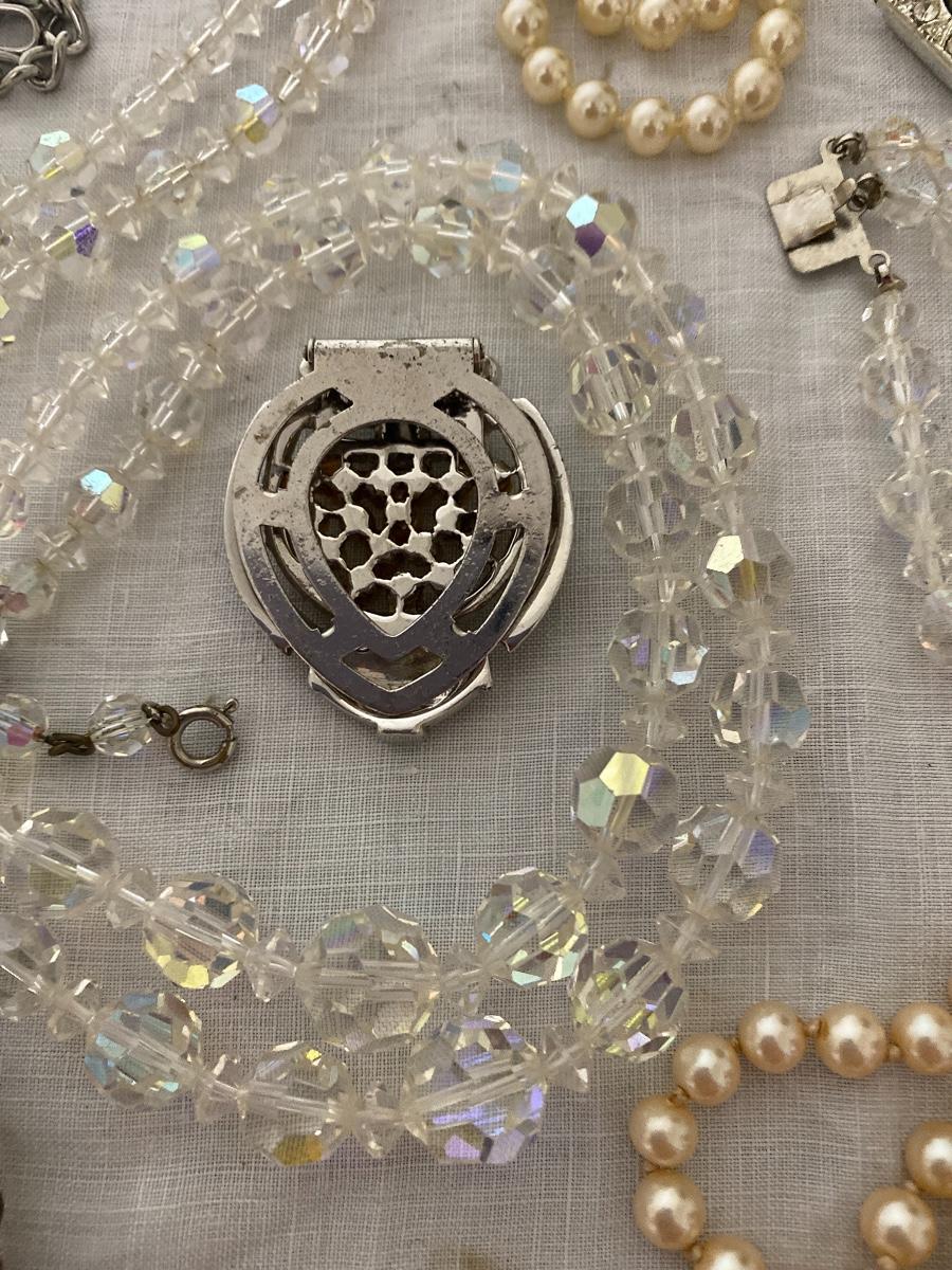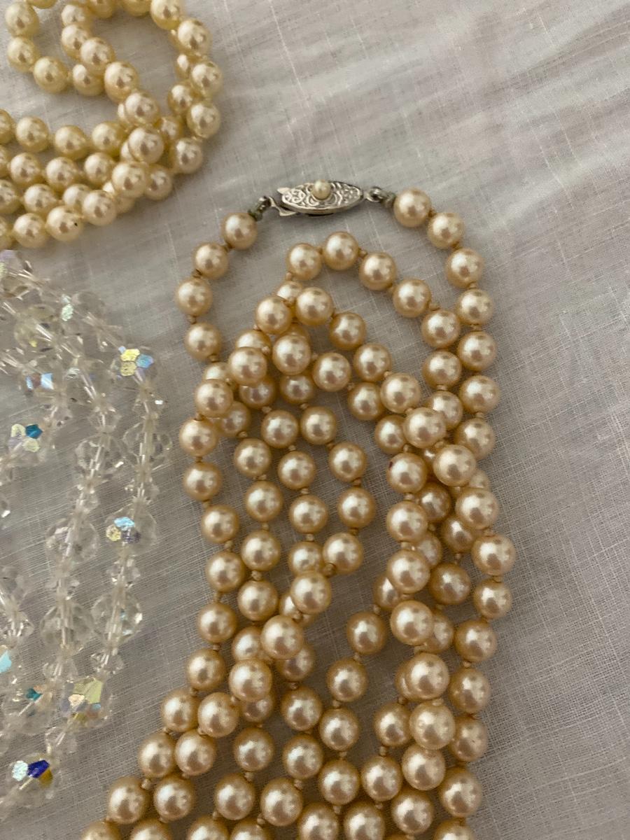 Vintage Jewelry Comprising a 54 inch glass Pearl necklace, a 30 inch glass Pearl necklace, a 7 inch three strand rhinestone bracelet, a rhinestone and pot metal shoe clip with seed pearls, a 26 inch double strand rhinestone necklace that needs a new clasp, a vintage Eiffel Tower brooch and a 12 to 15 inch adjustable rhinestone choker necklace.