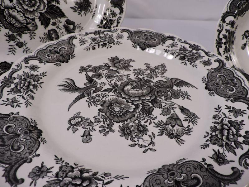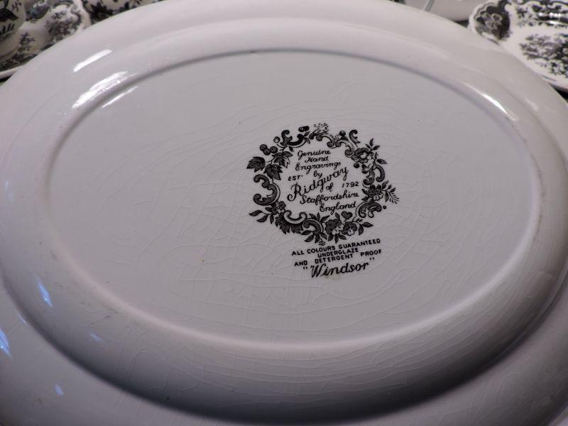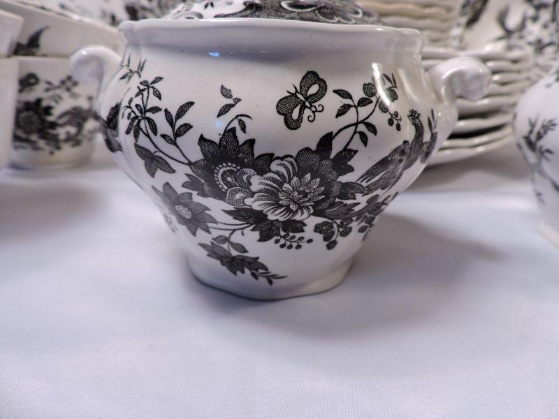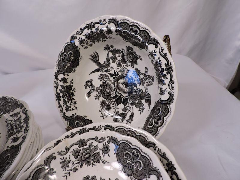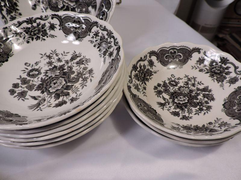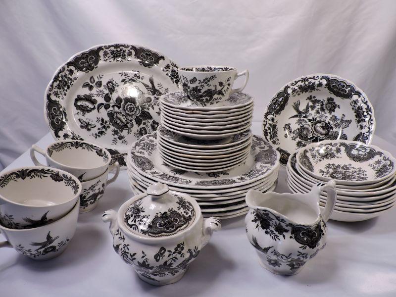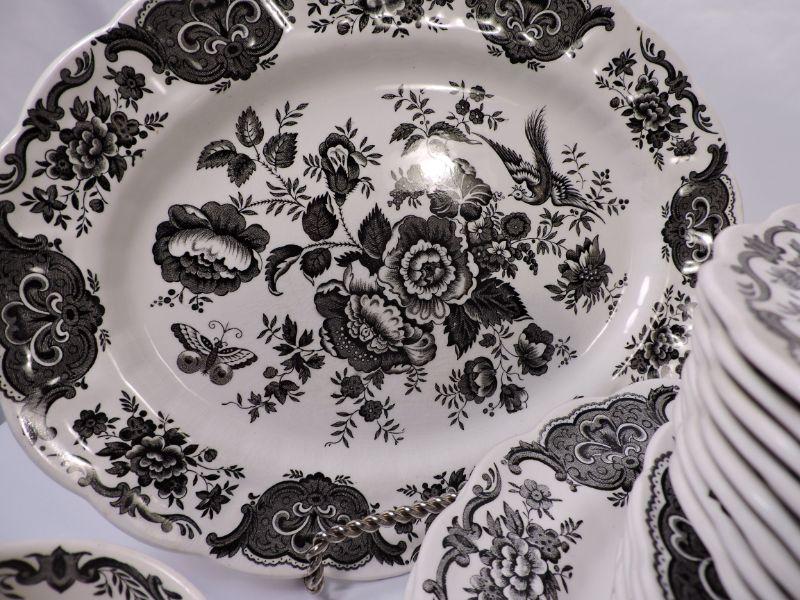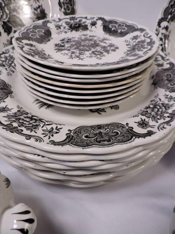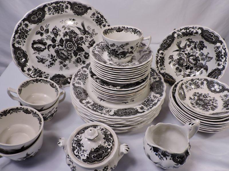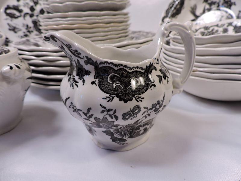 Beautiful collection of white and black Stafforshire "Windsor" pattern dinnerware. Includes 8 dinner plates, 8 small plates, 6 large soup bowls, 3 smaller bowls, 8 saucers, 5 teacups, creamer and sugar, and serving platter and bowl. Please bring container and packing material. **Please read Terms and Conditions before placing a bid. Pick up is Sunday, November 24 from 9am to 3pm or Tuesday, November 26 from 4pm-7pm in Mantua, NJ. All sales are final. All sales are as is, where is. Please review all photos. Any props included in photos are not included in listing. All measurements are approximate.