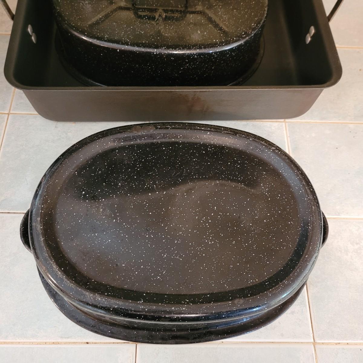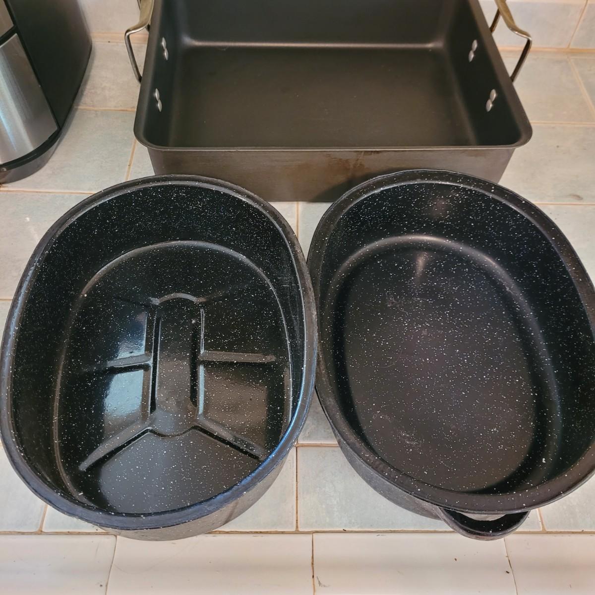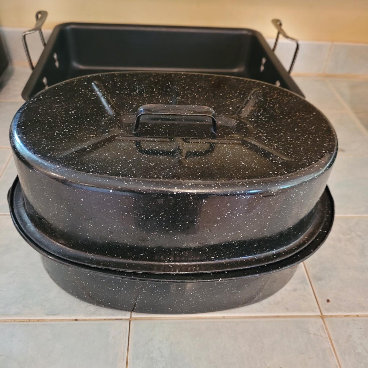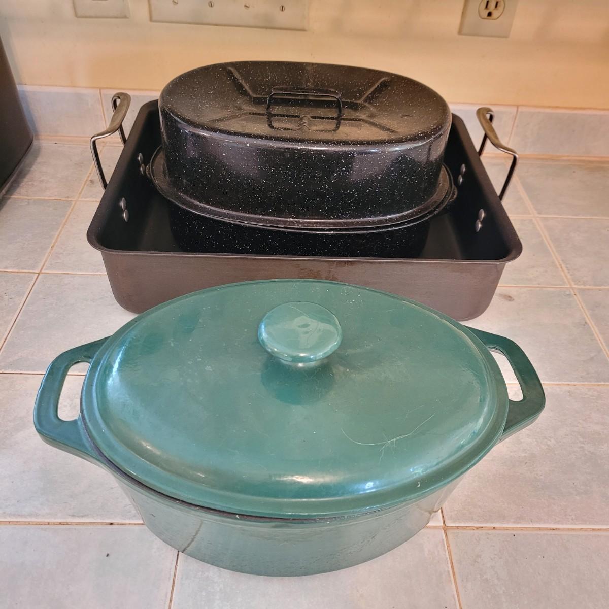 Three roasting pans, including a large Teflon coated pan, aluminum pan with raised lid, and enamel cast iron Dutch oven. Large Teflon pan measures approximately 16.5"L x13.5"W.