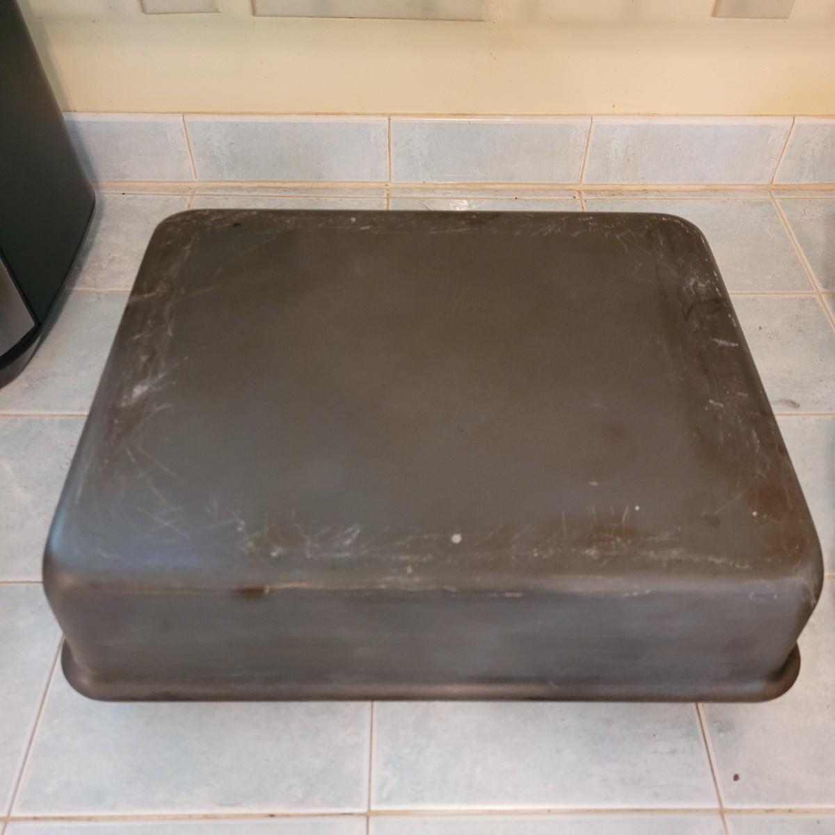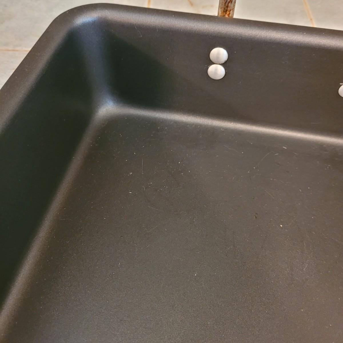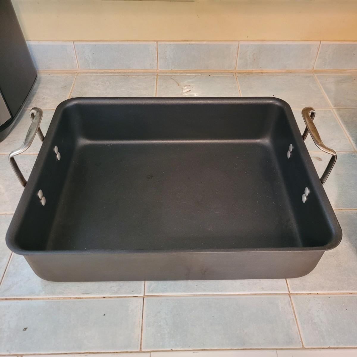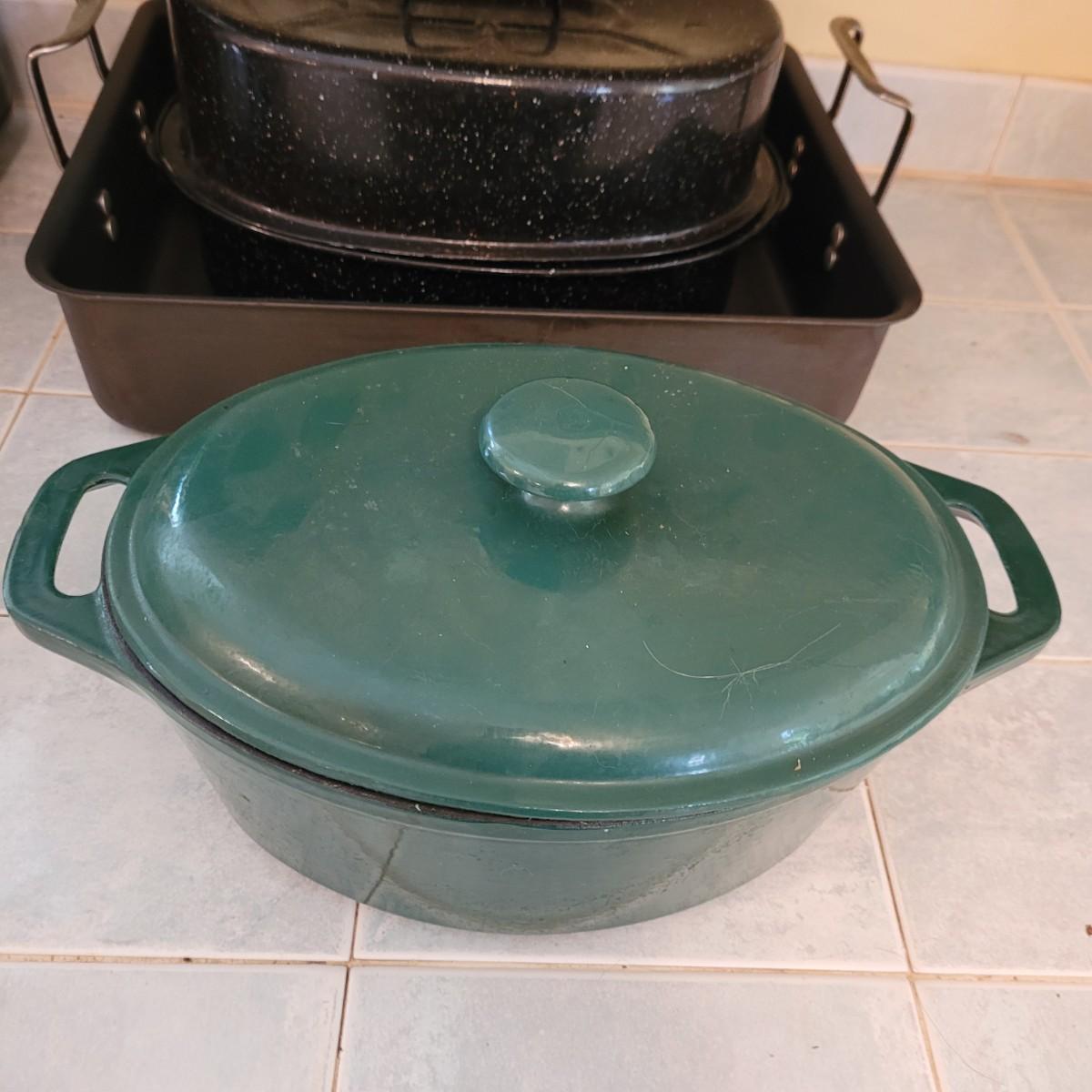 Three roasting pans, including a large Teflon coated pan, aluminum pan with raised lid, and enamel cast iron Dutch oven. Large Teflon pan measures approximately 16.5"L x13.5"W.