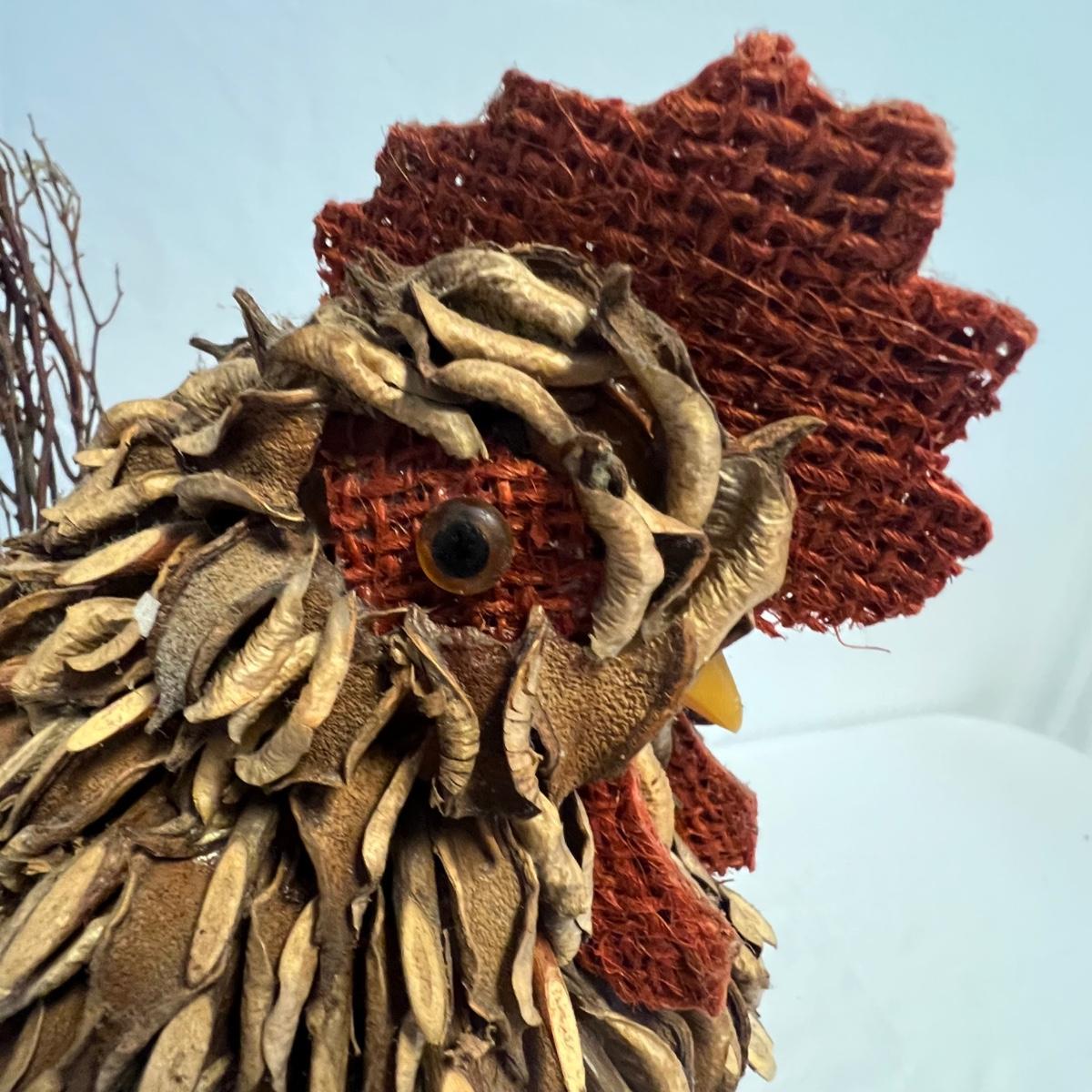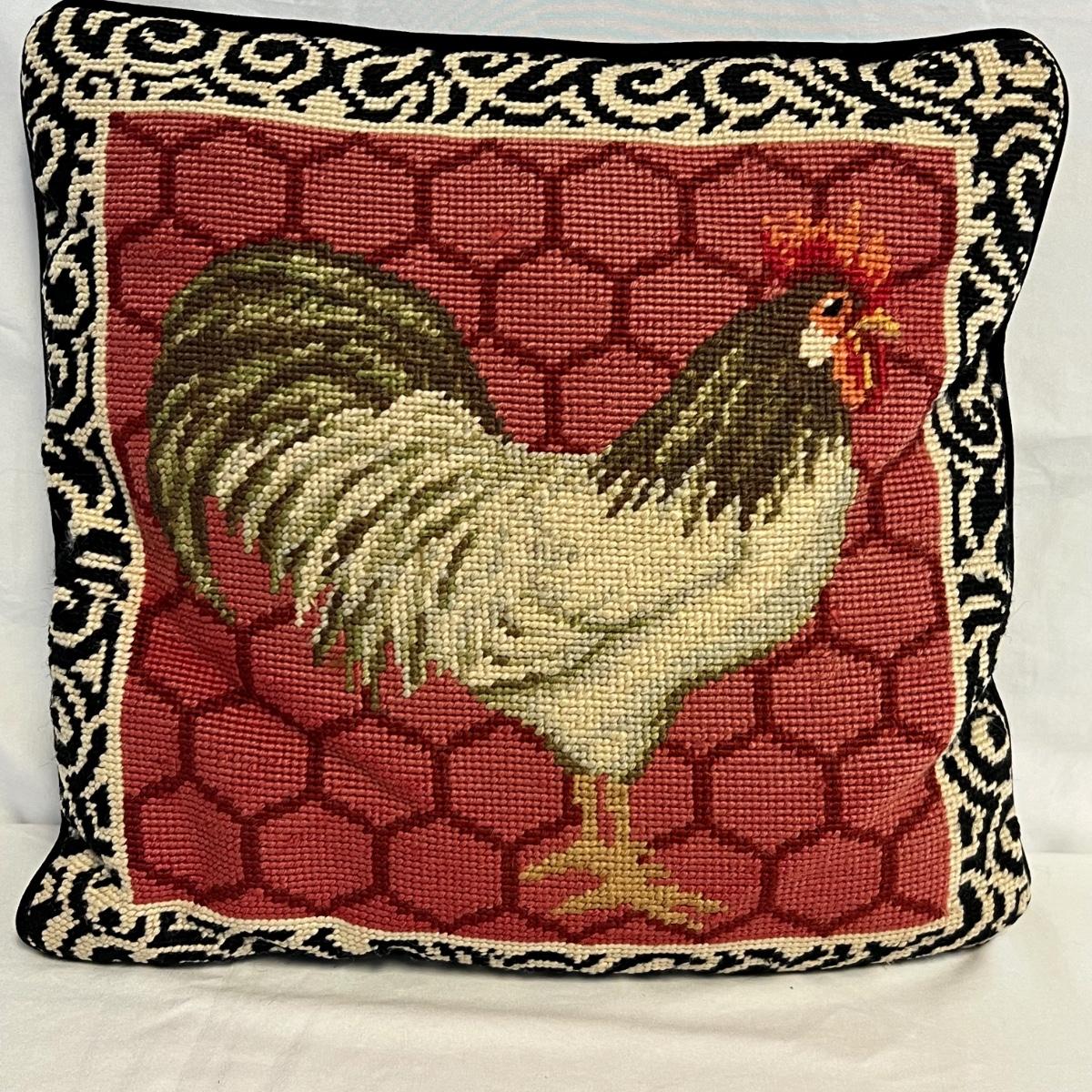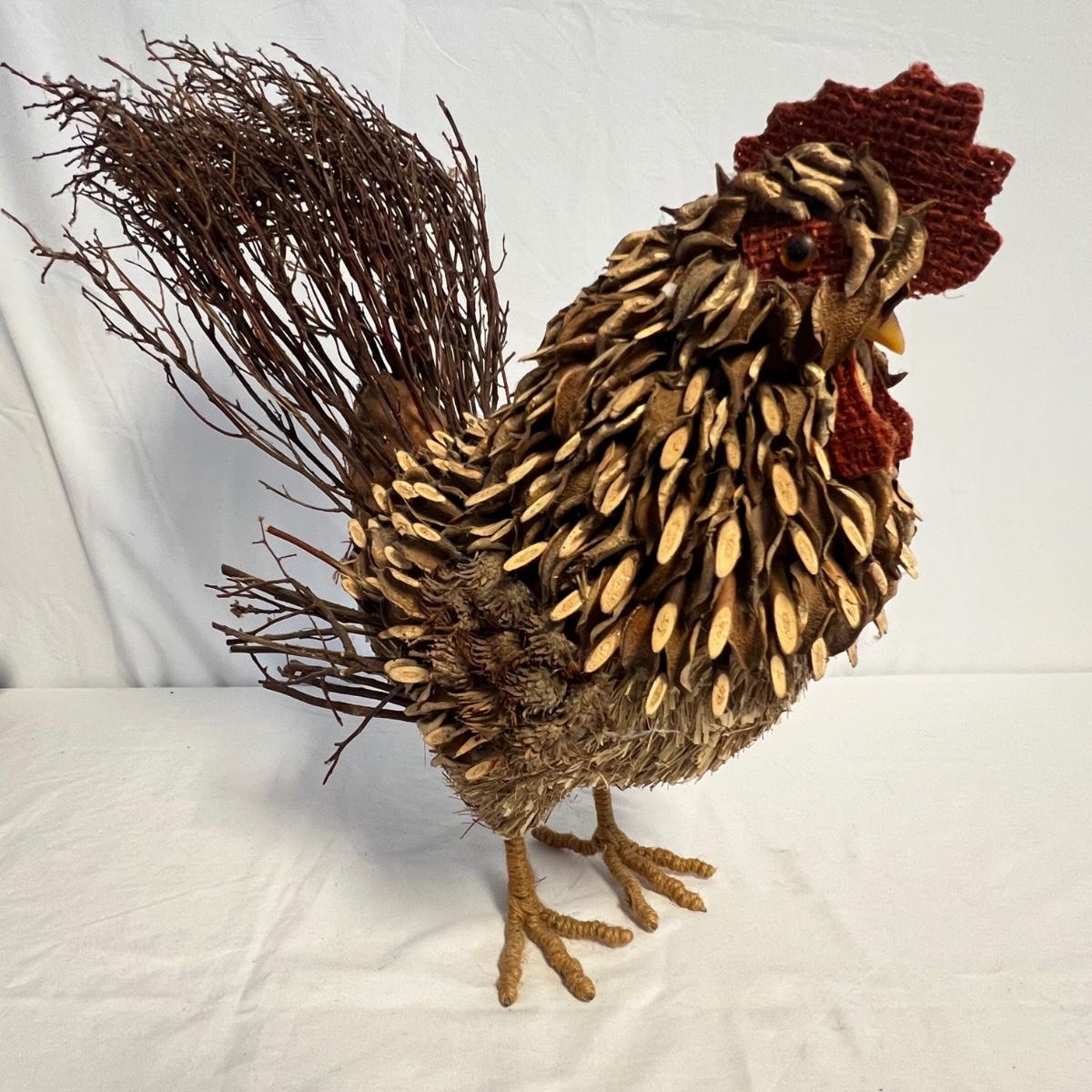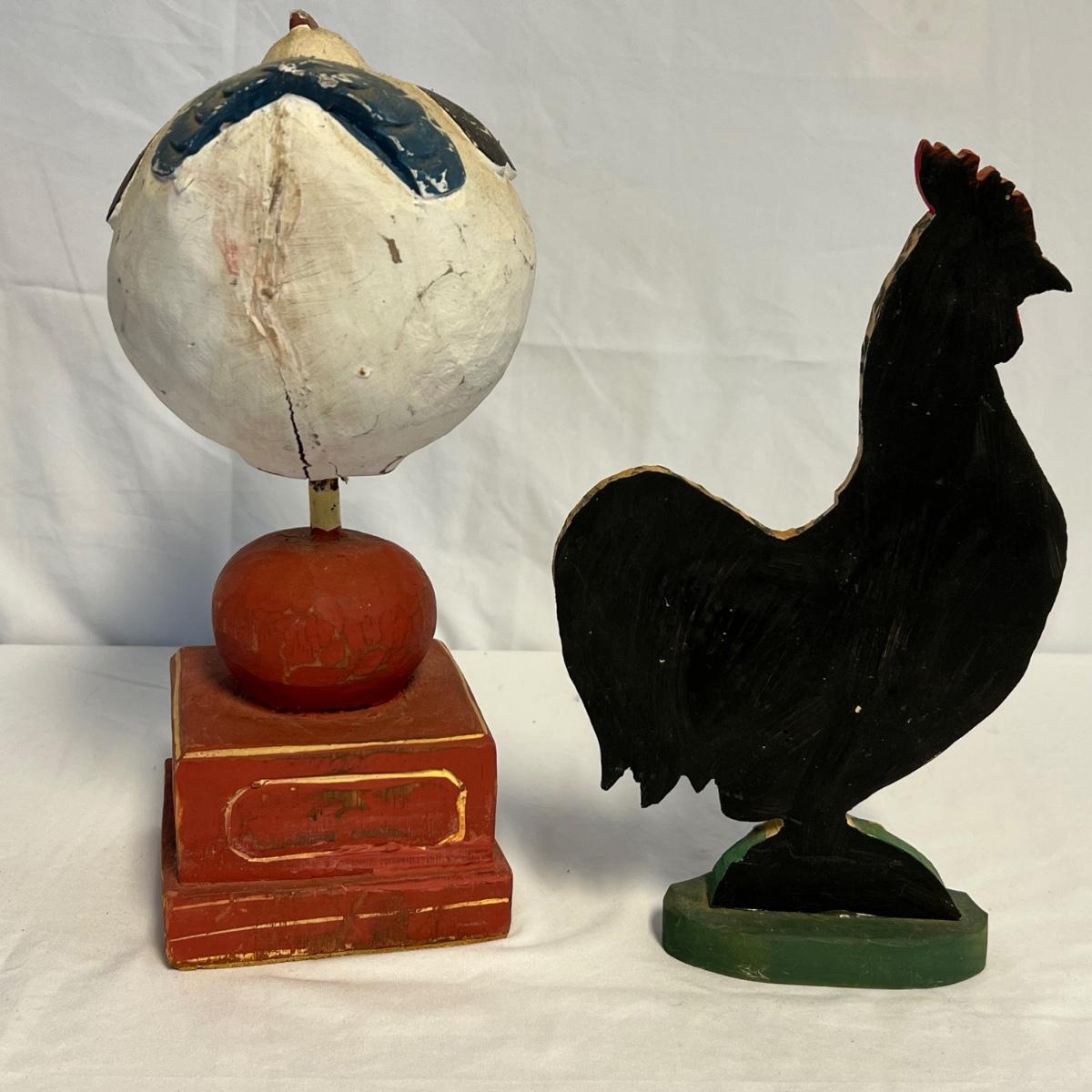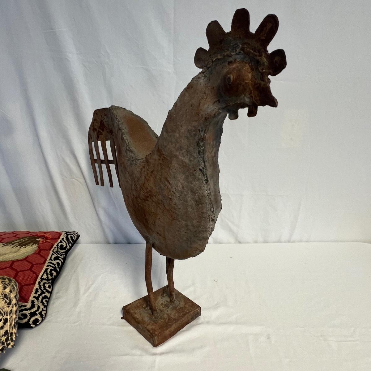 These four rooster statues includes a wooden doorstop with the initials J.W plus another wooden piece from Foreside, made in Indonesia. One rooster is made from natural materials such as bark and twigs and the largest rooster is metal with a rust patina; it measures approximately 23" x 5" x 21"H. Note the Foreside sculpture has a crack. Accent pillow is needlepoint.