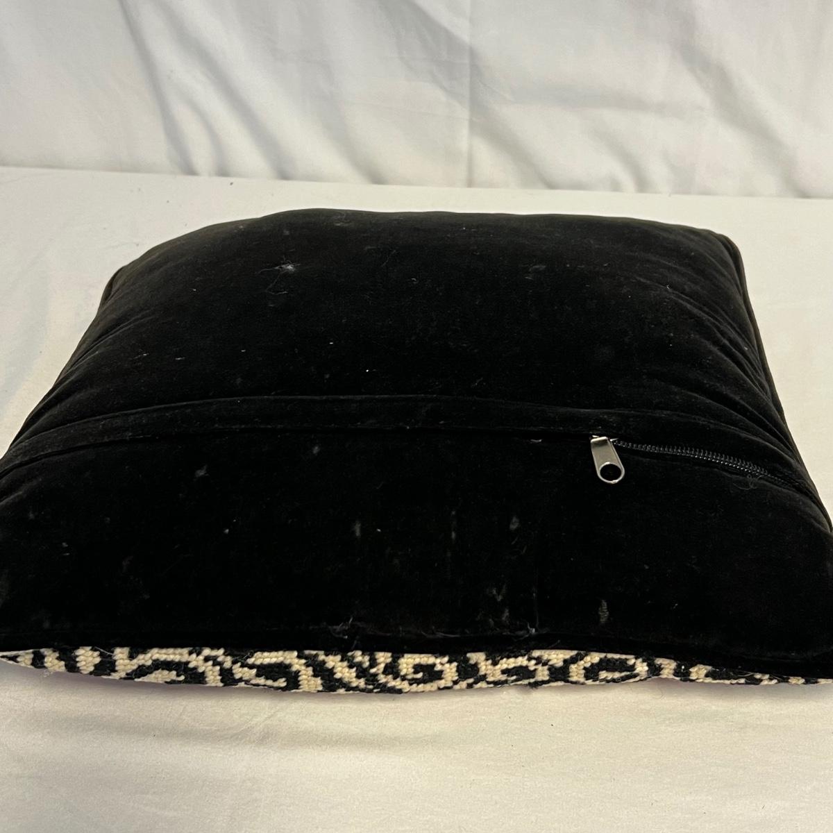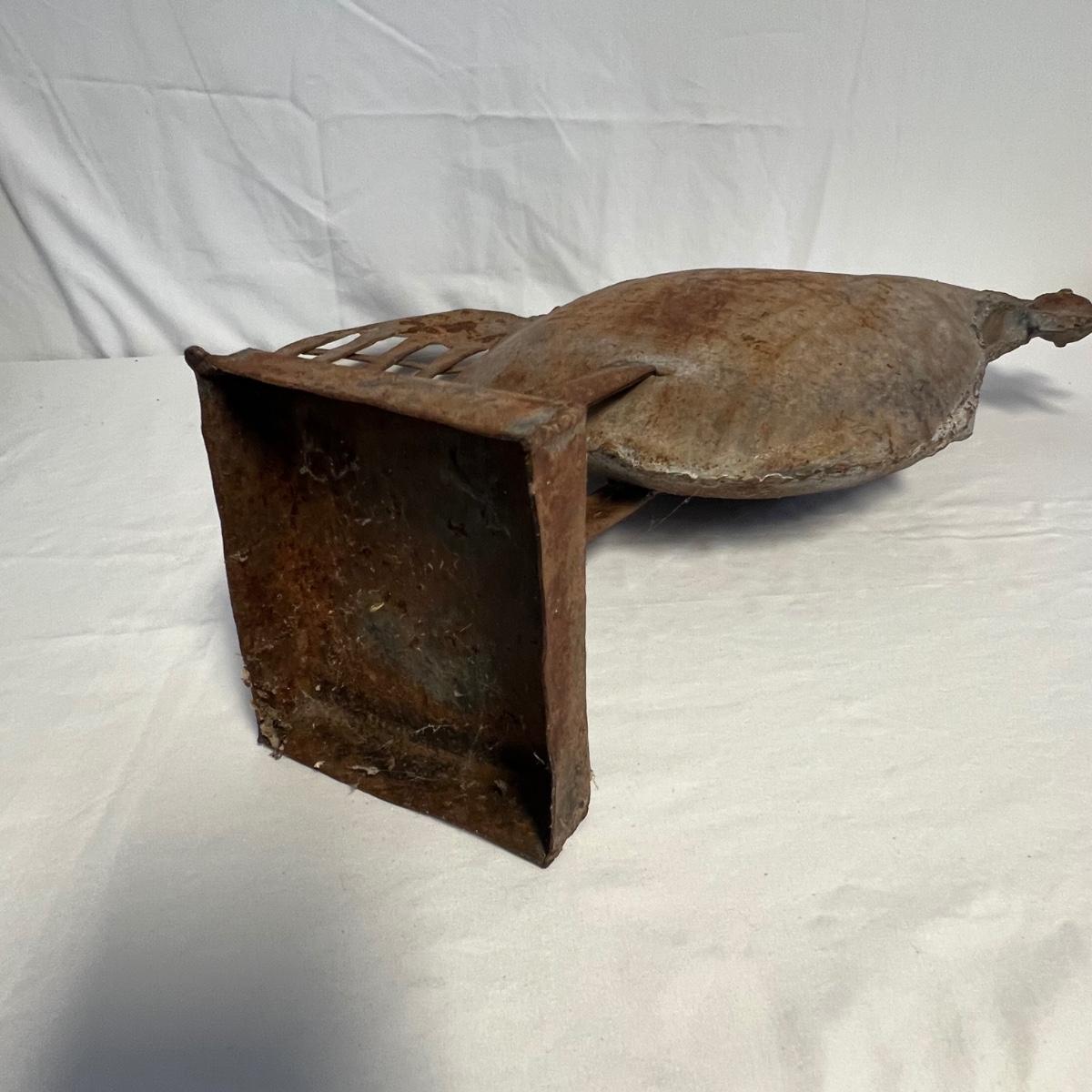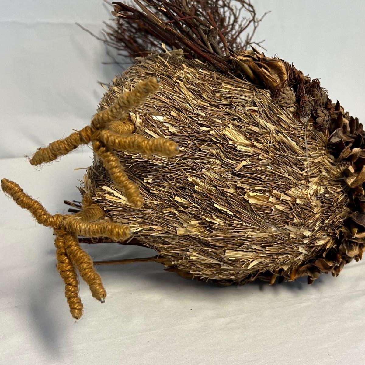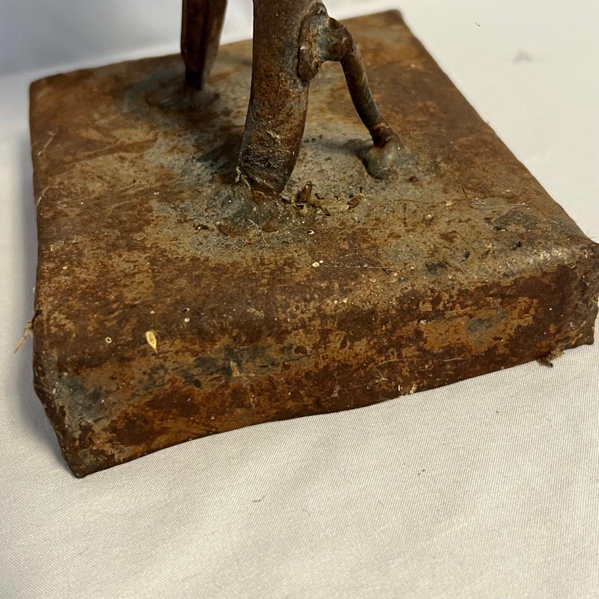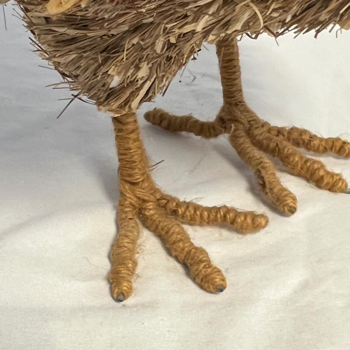 These four rooster statues includes a wooden doorstop with the initials J.W plus another wooden piece from Foreside, made in Indonesia. One rooster is made from natural materials such as bark and twigs and the largest rooster is metal with a rust patina; it measures approximately 23" x 5" x 21"H. Note the Foreside sculpture has a crack. Accent pillow is needlepoint.