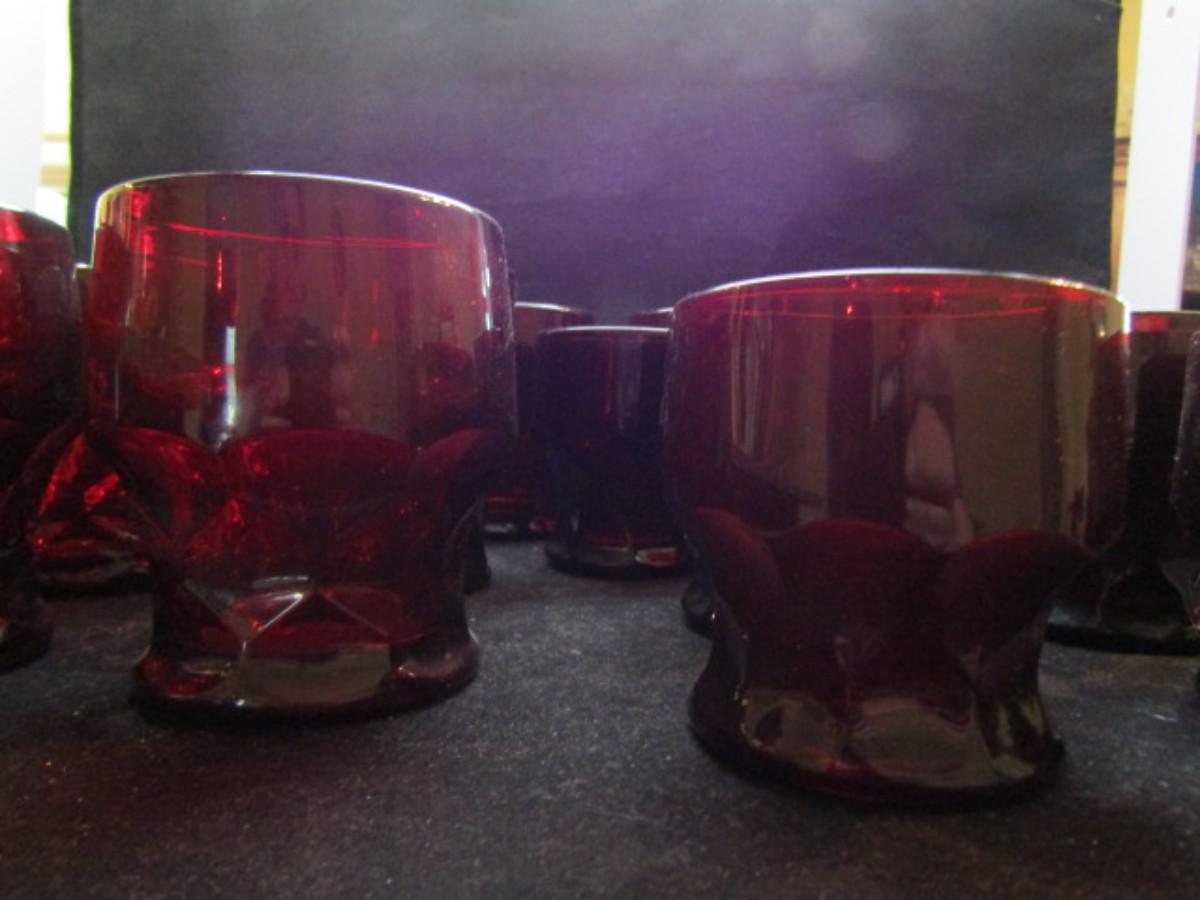 Collection of Ruby Red Drink Ware- Possibly Vintage Anchor Hocking (#164). Approx 15 pieces. 2 different sizes.