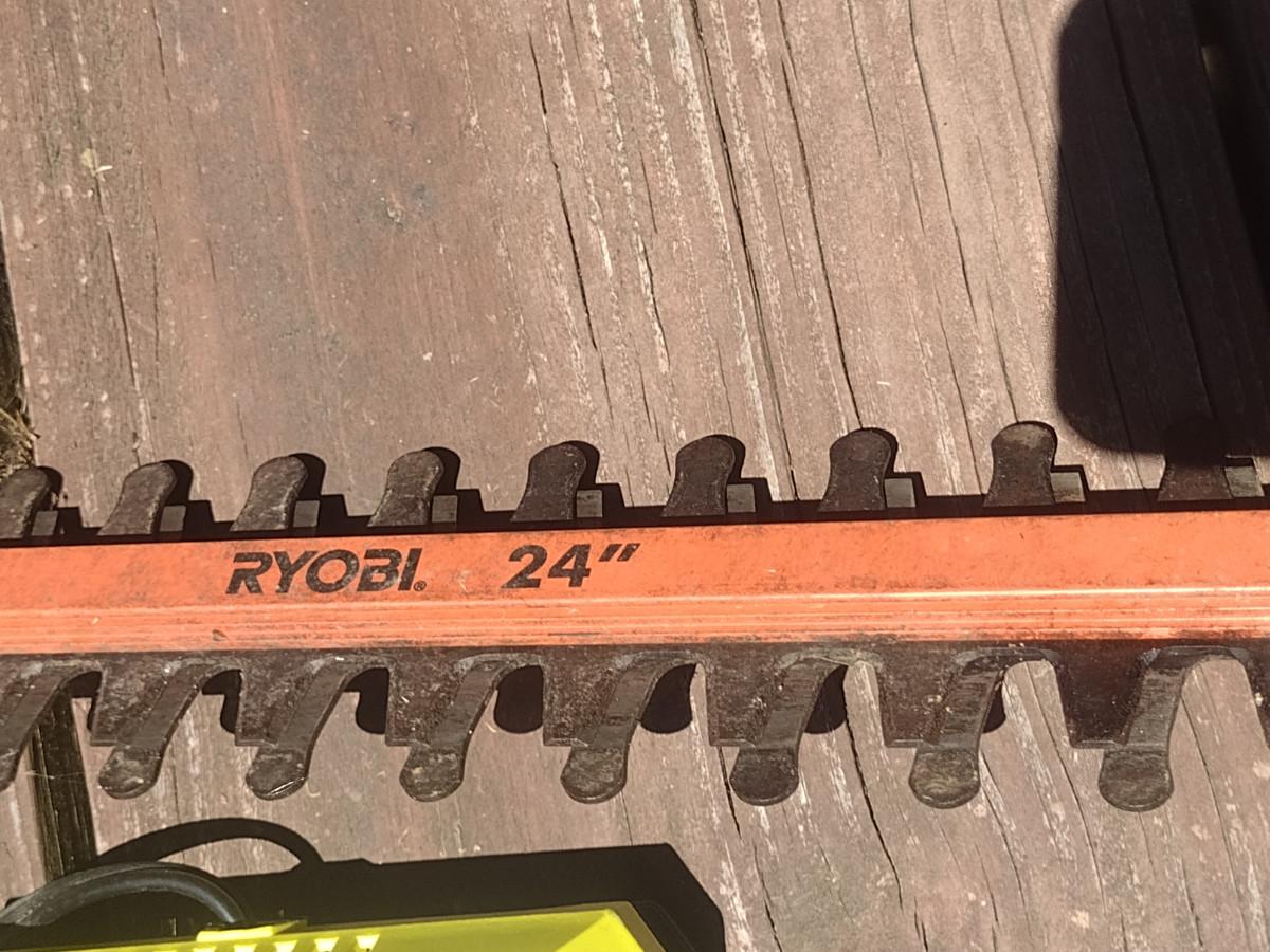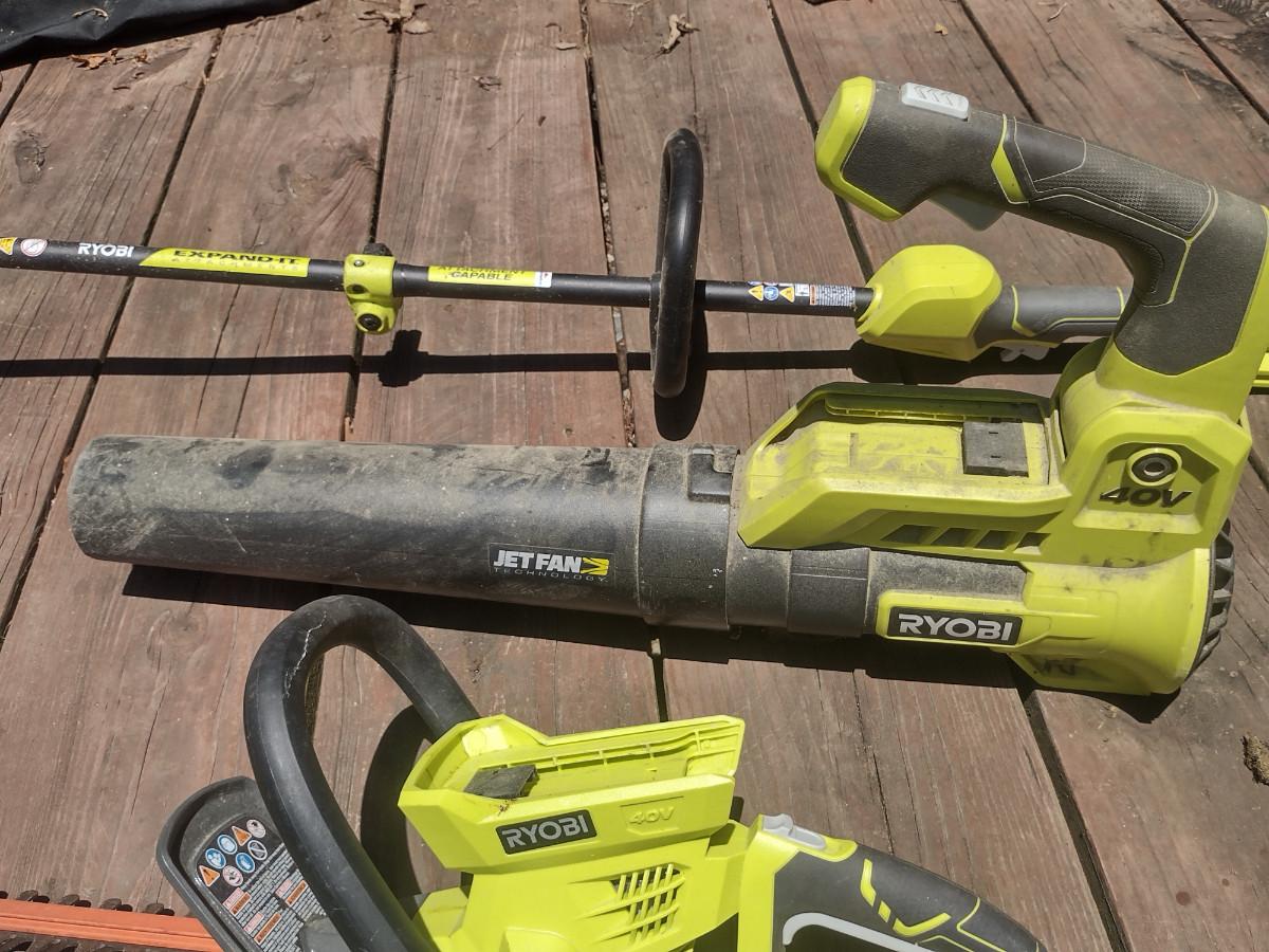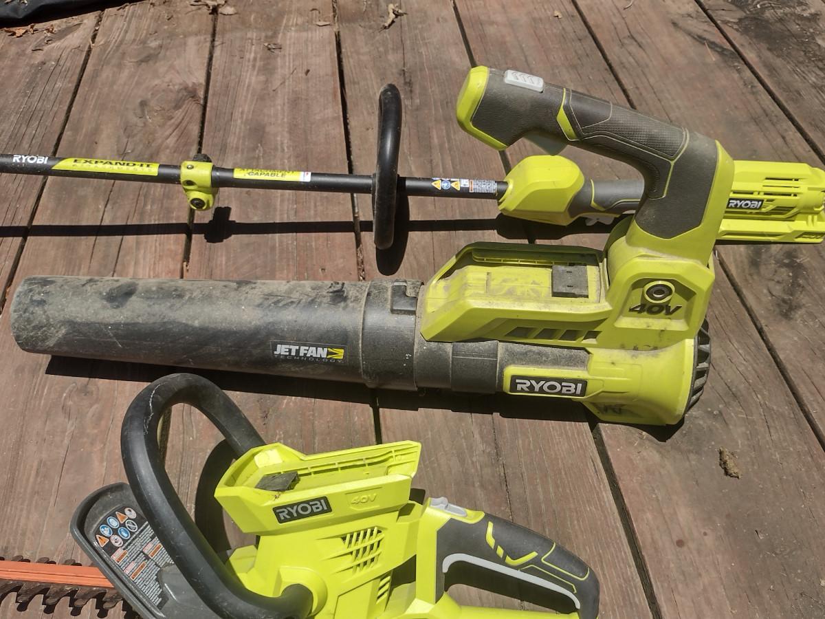 Collection of Ryobi Battery Powered 40 Volt Lawn Tools- Weed Eater, Blower, Hedge Trimmer (24")