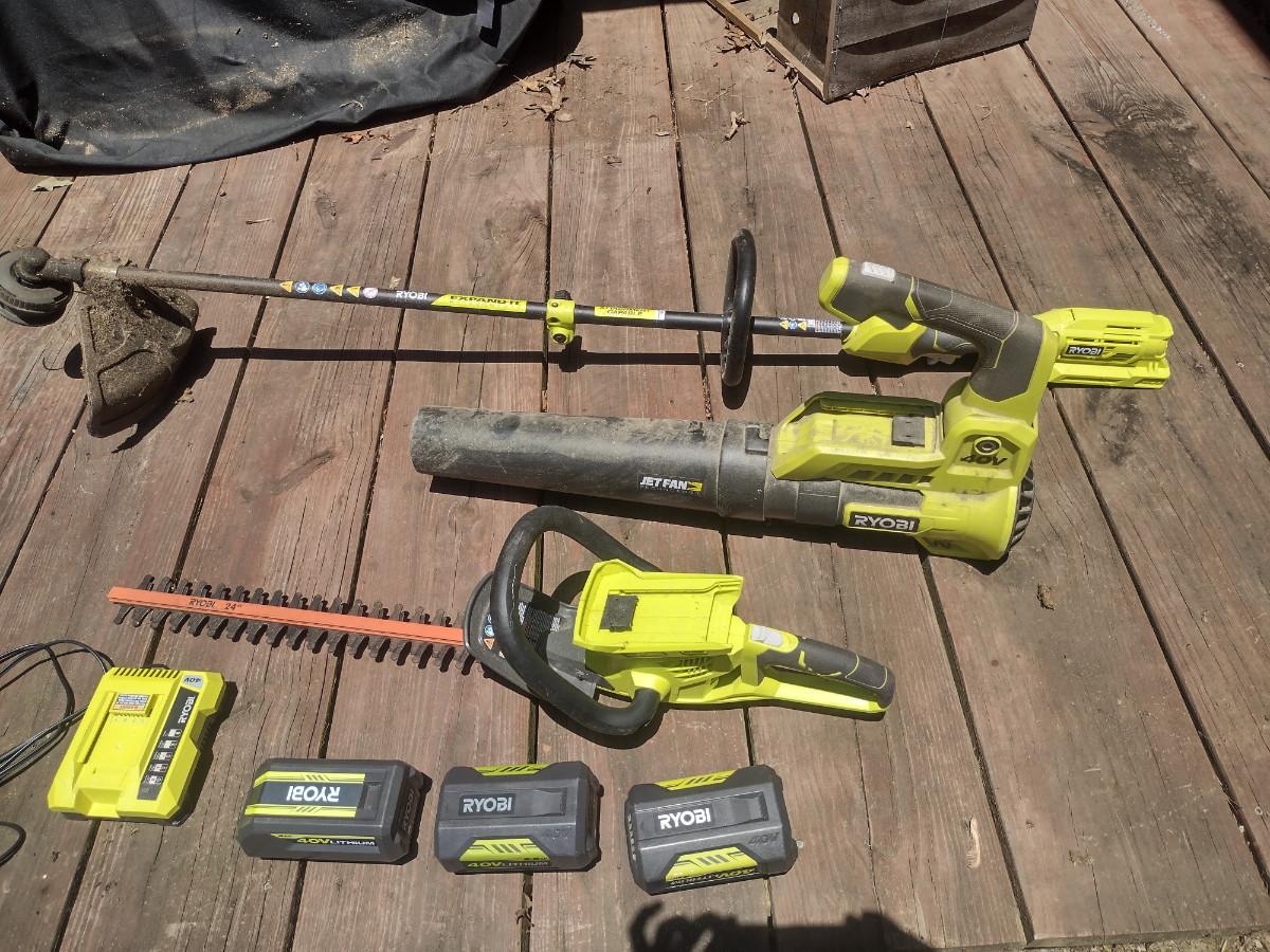 Collection of Ryobi Battery Powered 40 Volt Lawn Tools- Weed Eater, Blower, Hedge Trimmer (24"). Items appear to be in working condition and includes three batteries and charger.