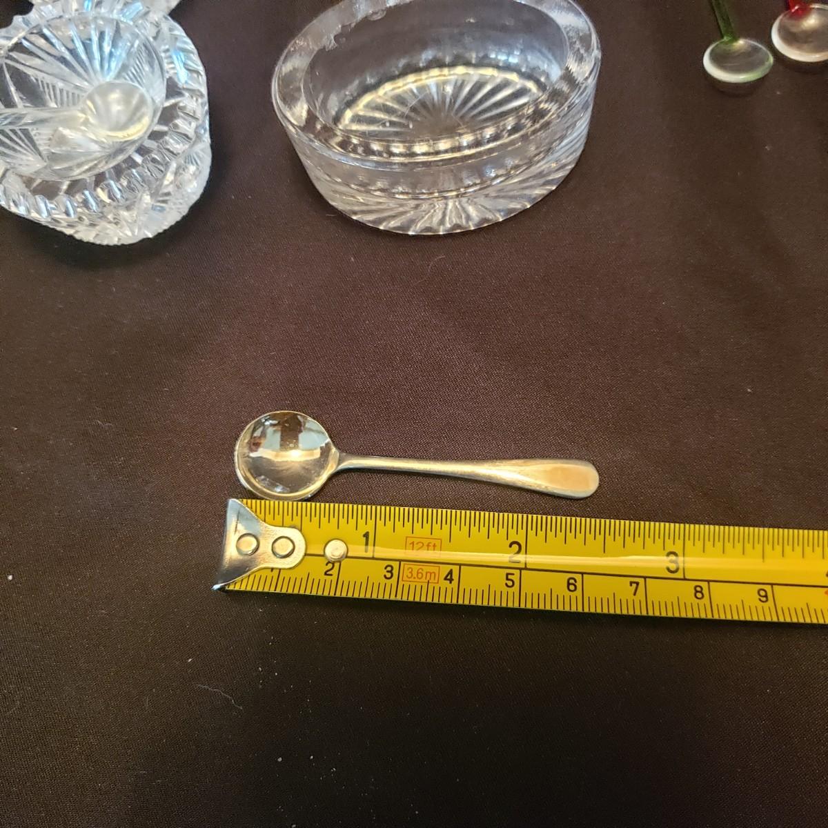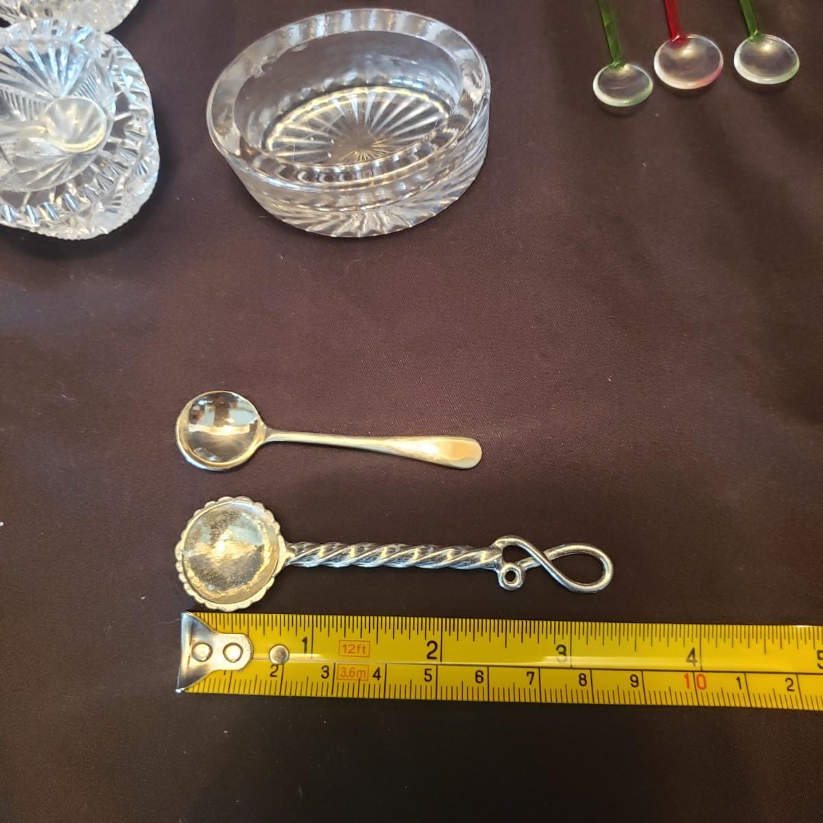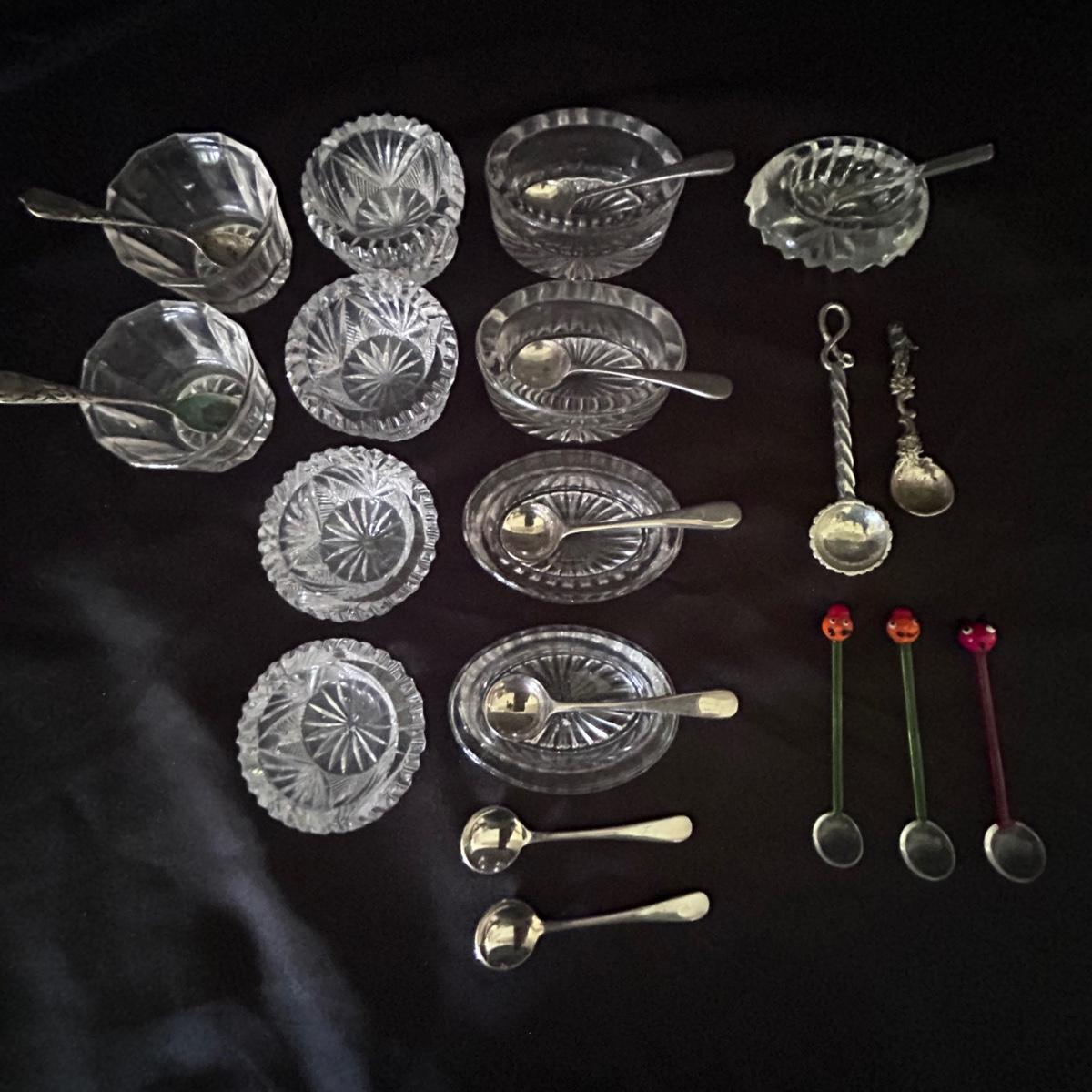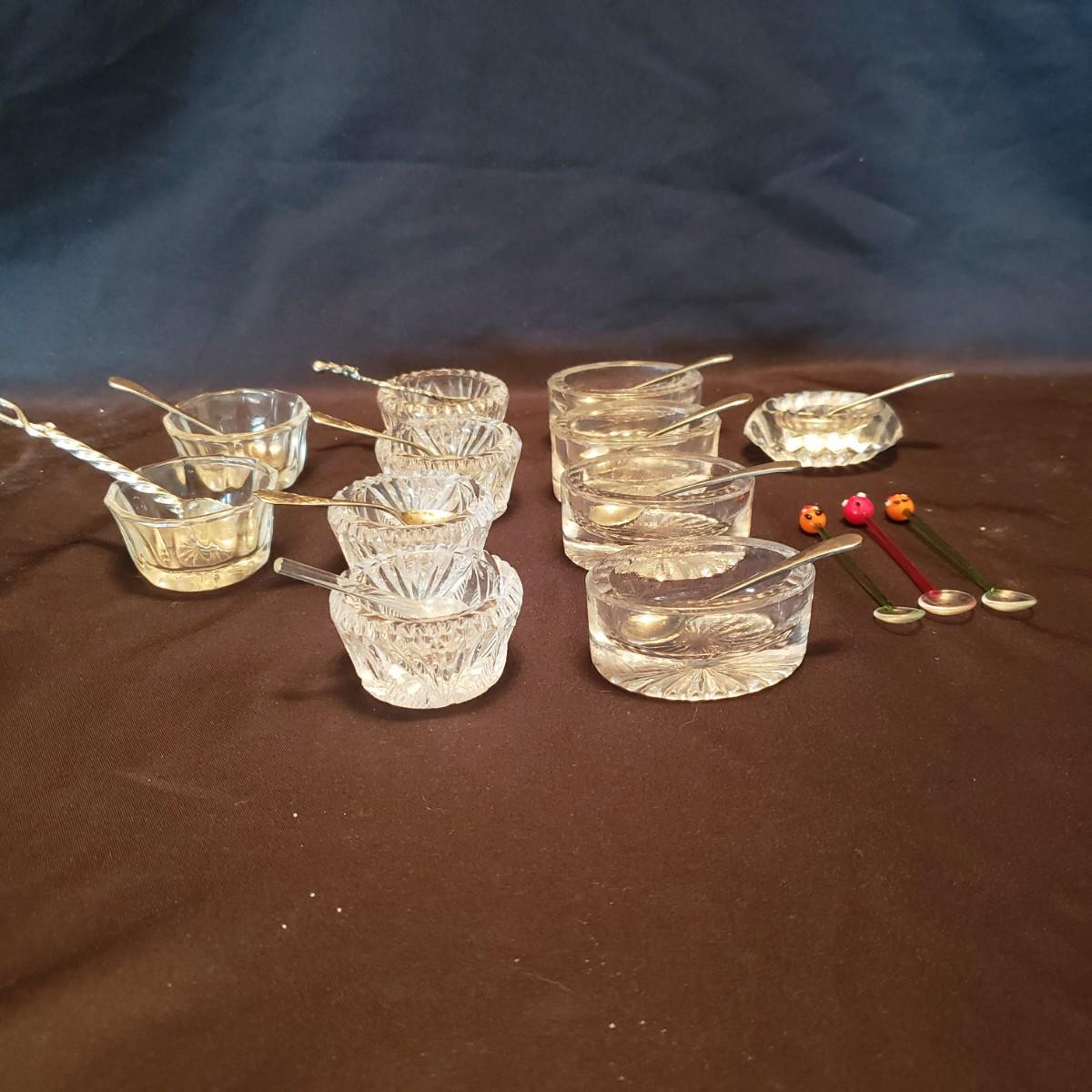 Lot includes 11 cellars in four different patterns 14 spoons in a variety of six styles. There are four glass spoons.. See photos for counts. The six simple spoons from England appear to be Sterling. All known markings are noted in photos. Shipping available.