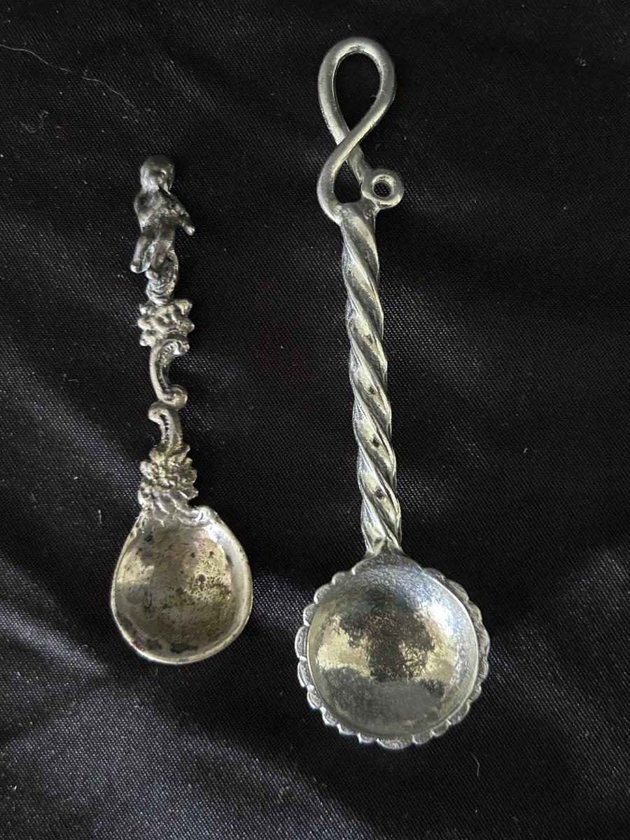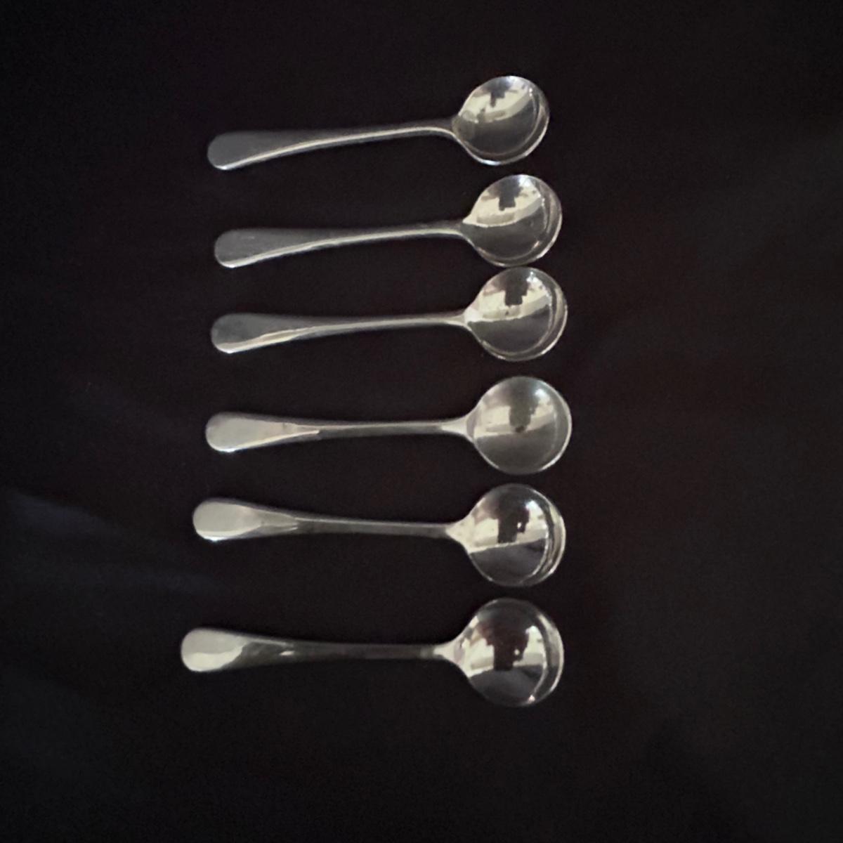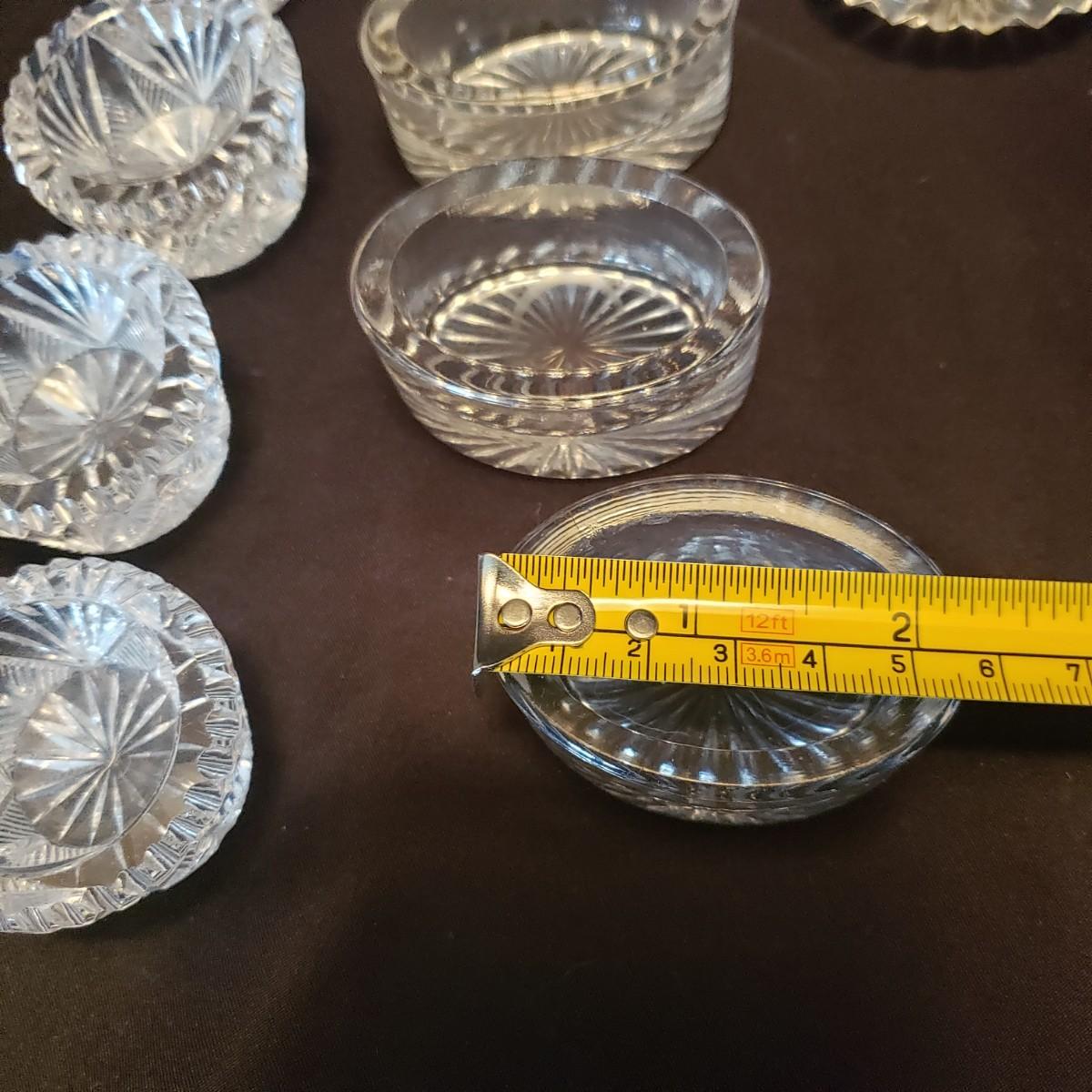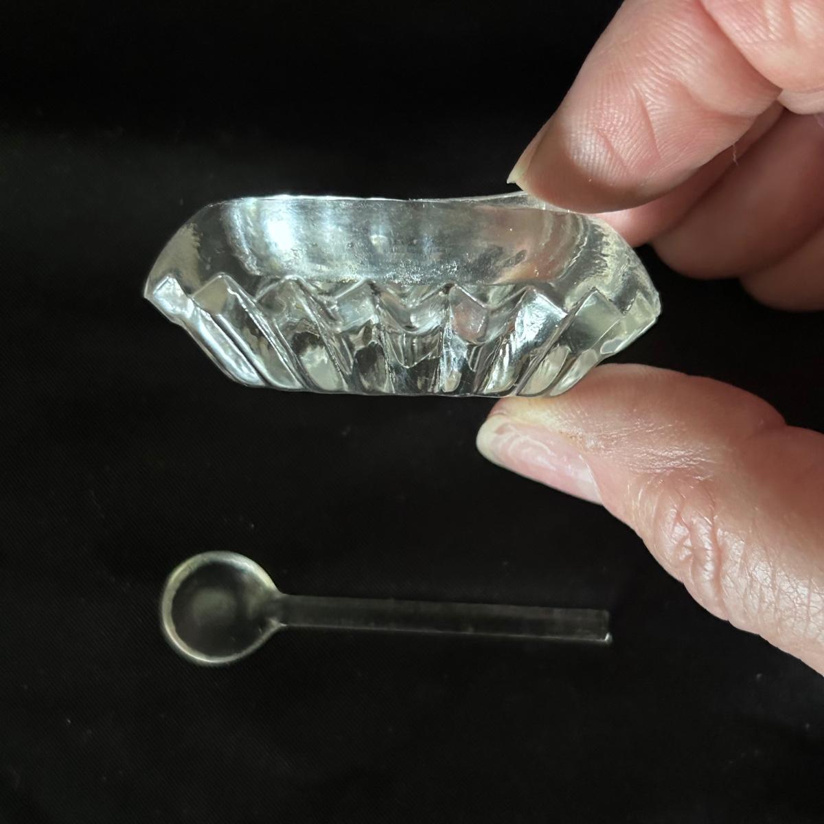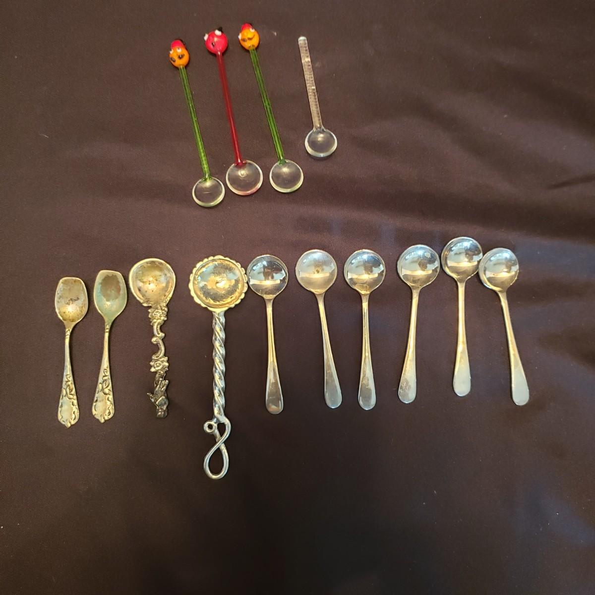 Lot includes 11 cellars in four different patterns 14 spoons in a variety of six styles. There are four glass spoons.. See photos for counts. The six simple spoons from England appear to be Sterling. All known markings are noted in photos. Shipping available.