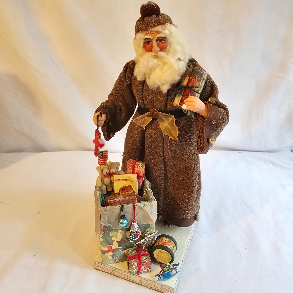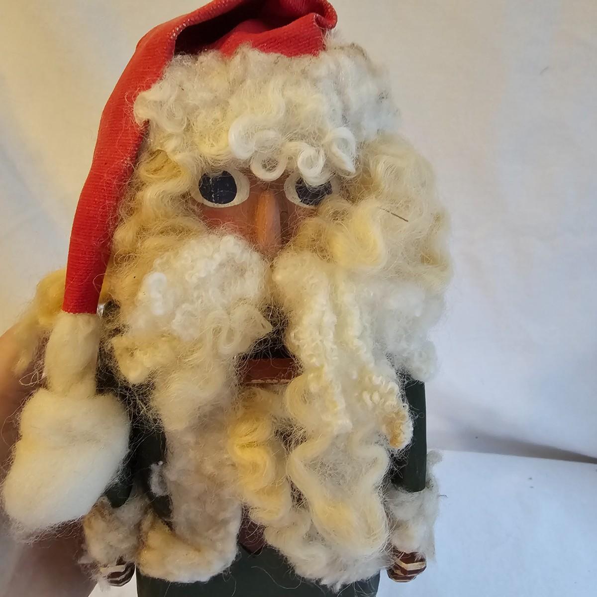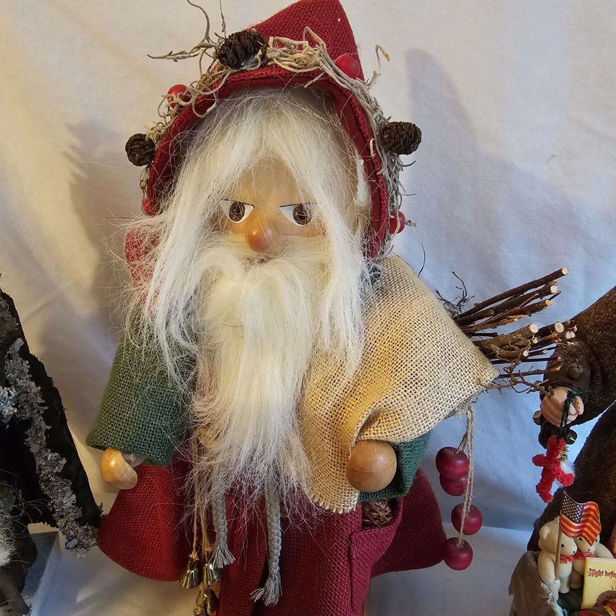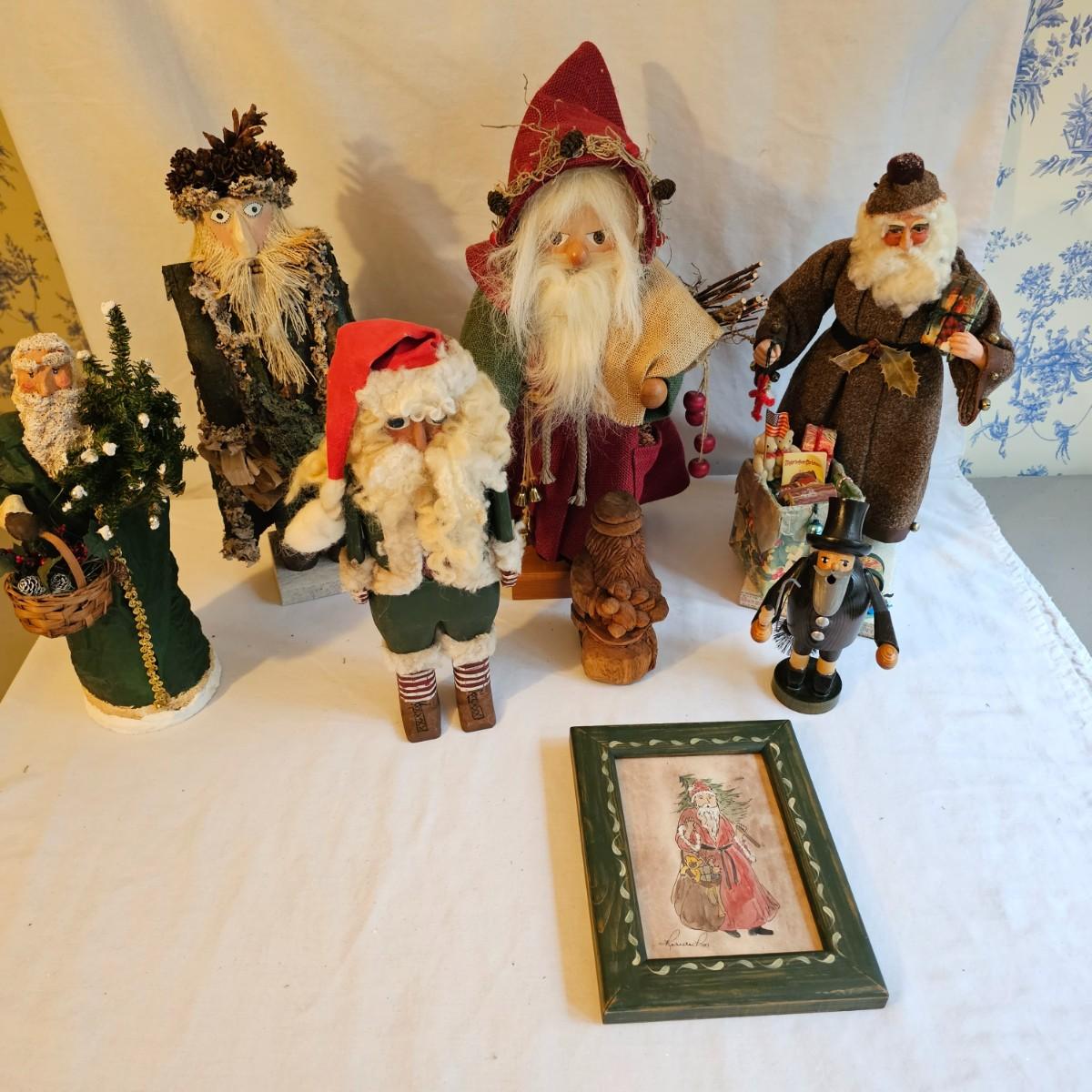 Different and varied styles of Santa, Kris Kringle, Pere Noel. Seven types of figures in many materials. The large red figure is 11" x 9" x 18"H, has burlap cloak and is also a nutcracker, made in Germany. The small carved item is 3" x 4" x 7"H. Most all pieces are hand made, with paper mache, bark and wood used in their makeup. Many are signed. Photo of Santa is 7" x 9". All figures come with their original boxes. See photos for details. Shipping available. Shipping can be costly. We suggest contacting our preferred local shipping provider, Postage Express, with dimensions and getting an estimate before bidding: (828) 670-5501 or postageexpress@yahoo.com.