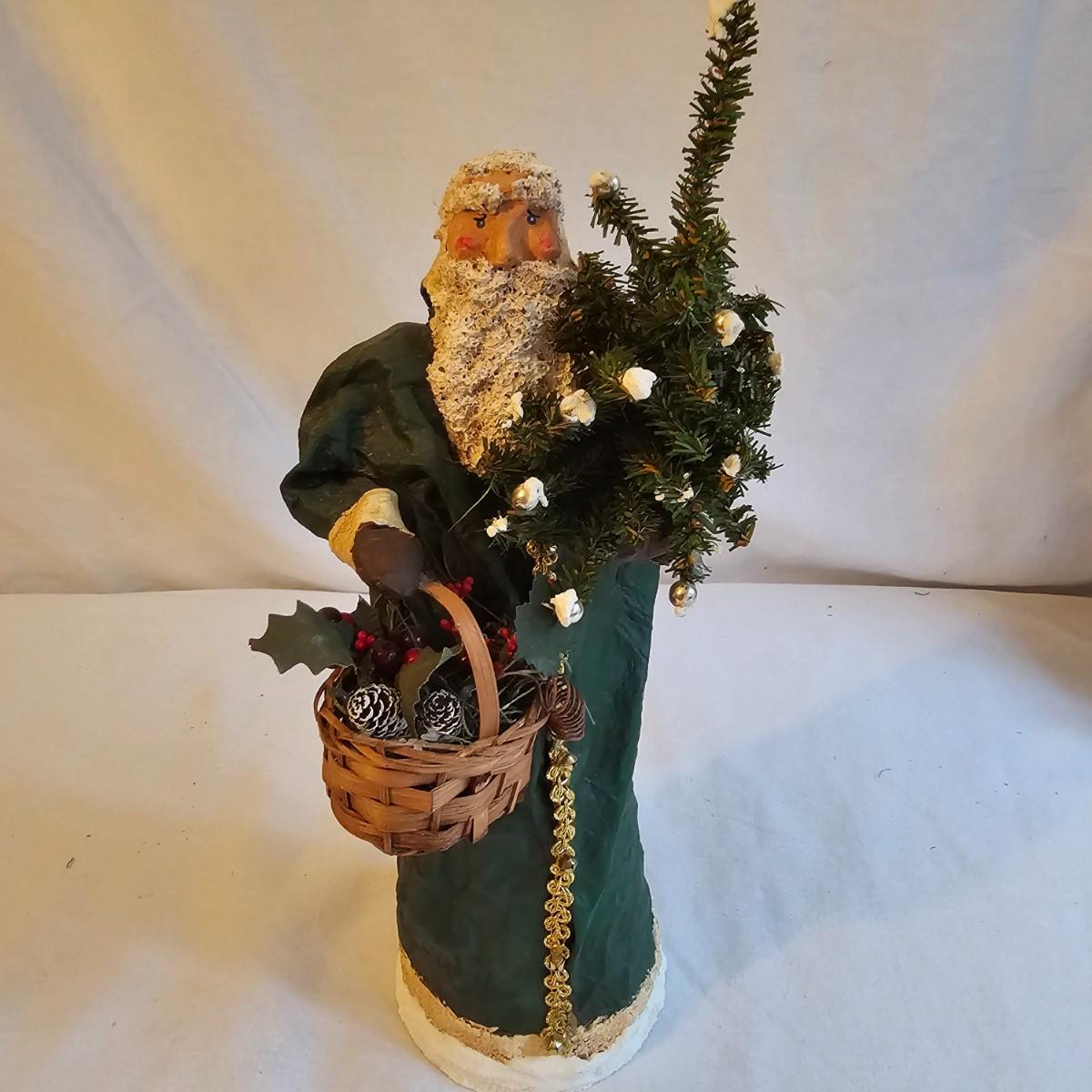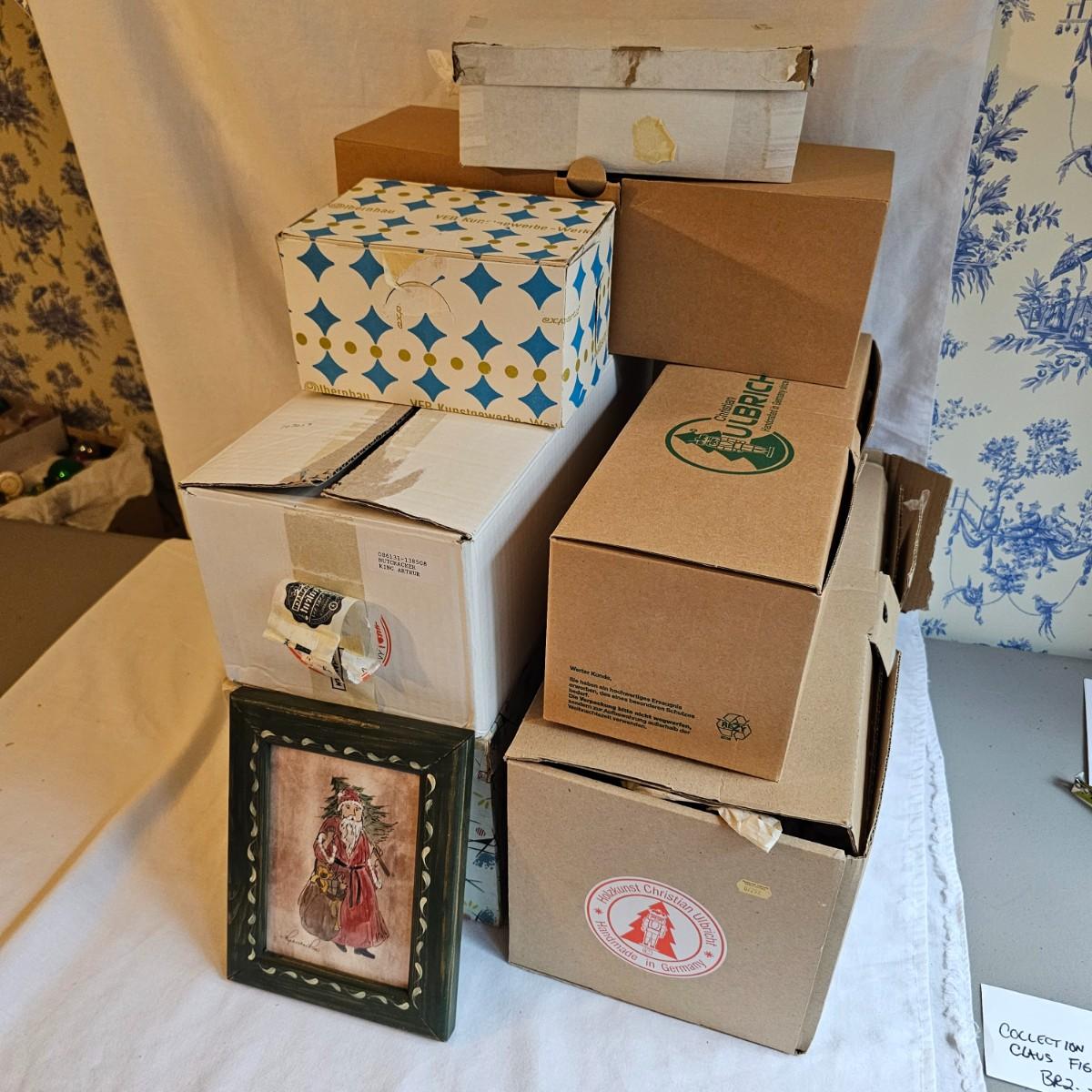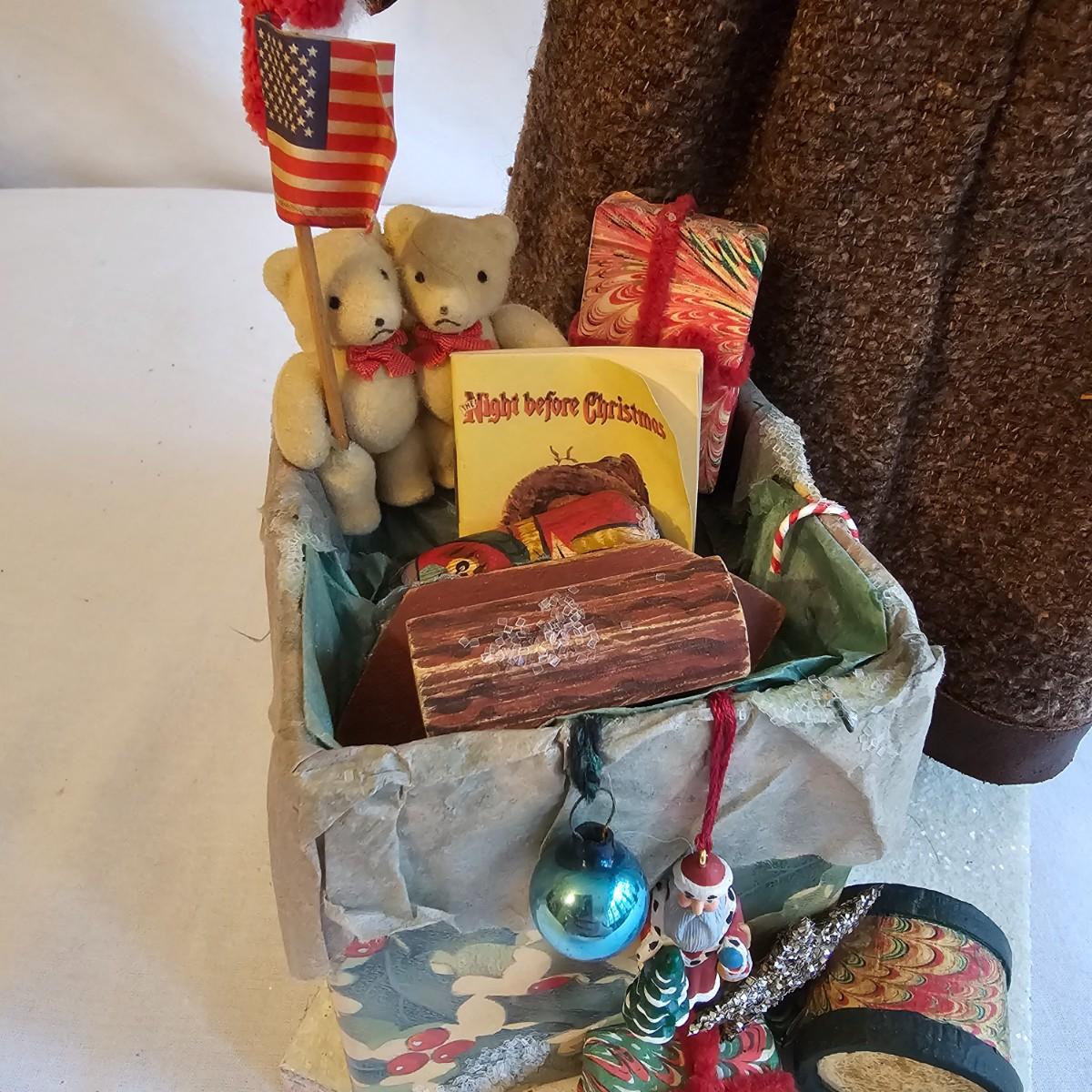 Different and varied styles of Santa, Kris Kringle, Pere Noel. Seven types of figures in many materials. The large red figure is 11" x 9" x 18"H, has burlap cloak and is also a nutcracker, made in Germany. The small carved item is 3" x 4" x 7"H. Most all pieces are hand made, with paper mache, bark and wood used in their makeup. Many are signed. Photo of Santa is 7" x 9". All figures come with their original boxes. See photos for details. Shipping available. Shipping can be costly. We suggest contacting our preferred local shipping provider, Postage Express, with dimensions and getting an estimate before bidding: (828) 670-5501 or postageexpress@yahoo.com.