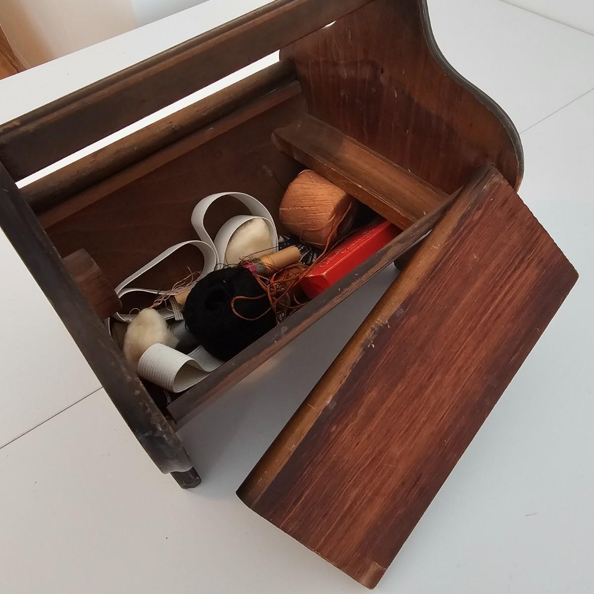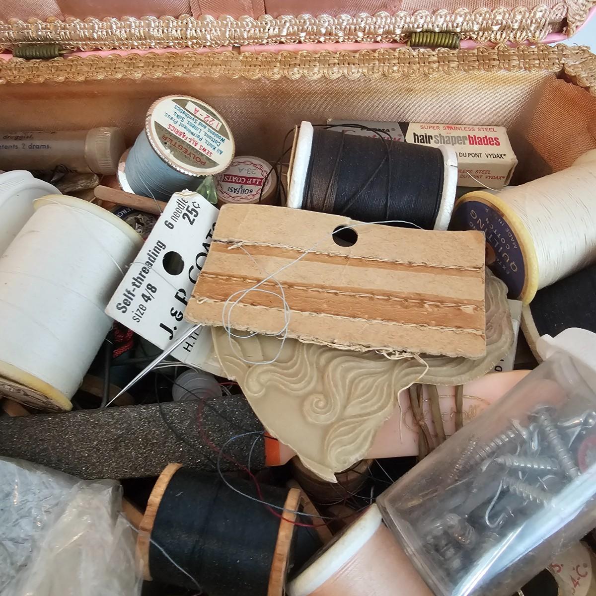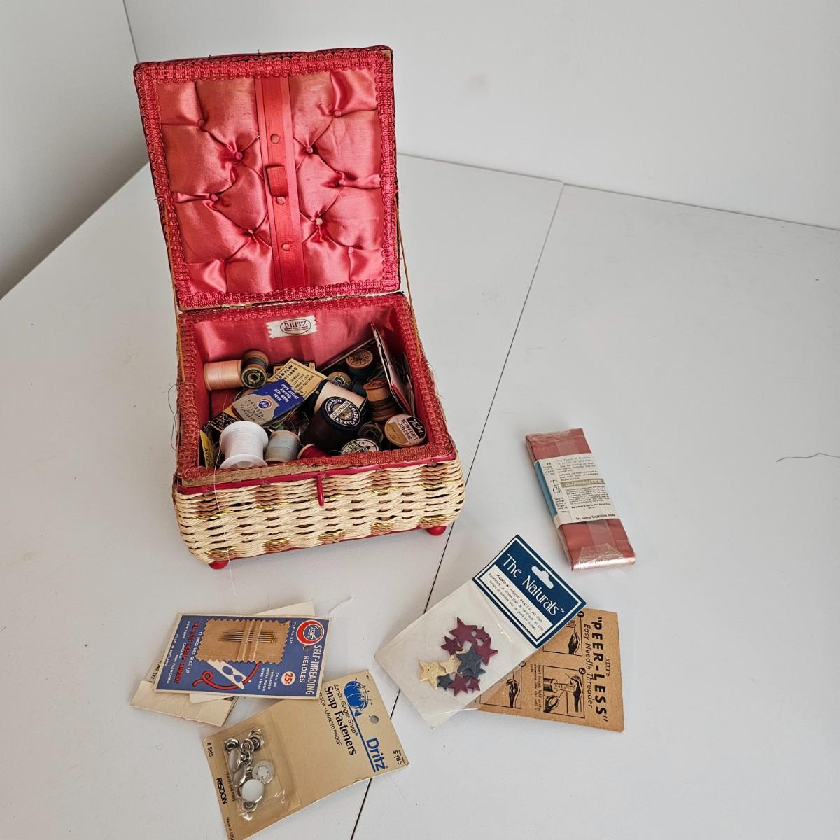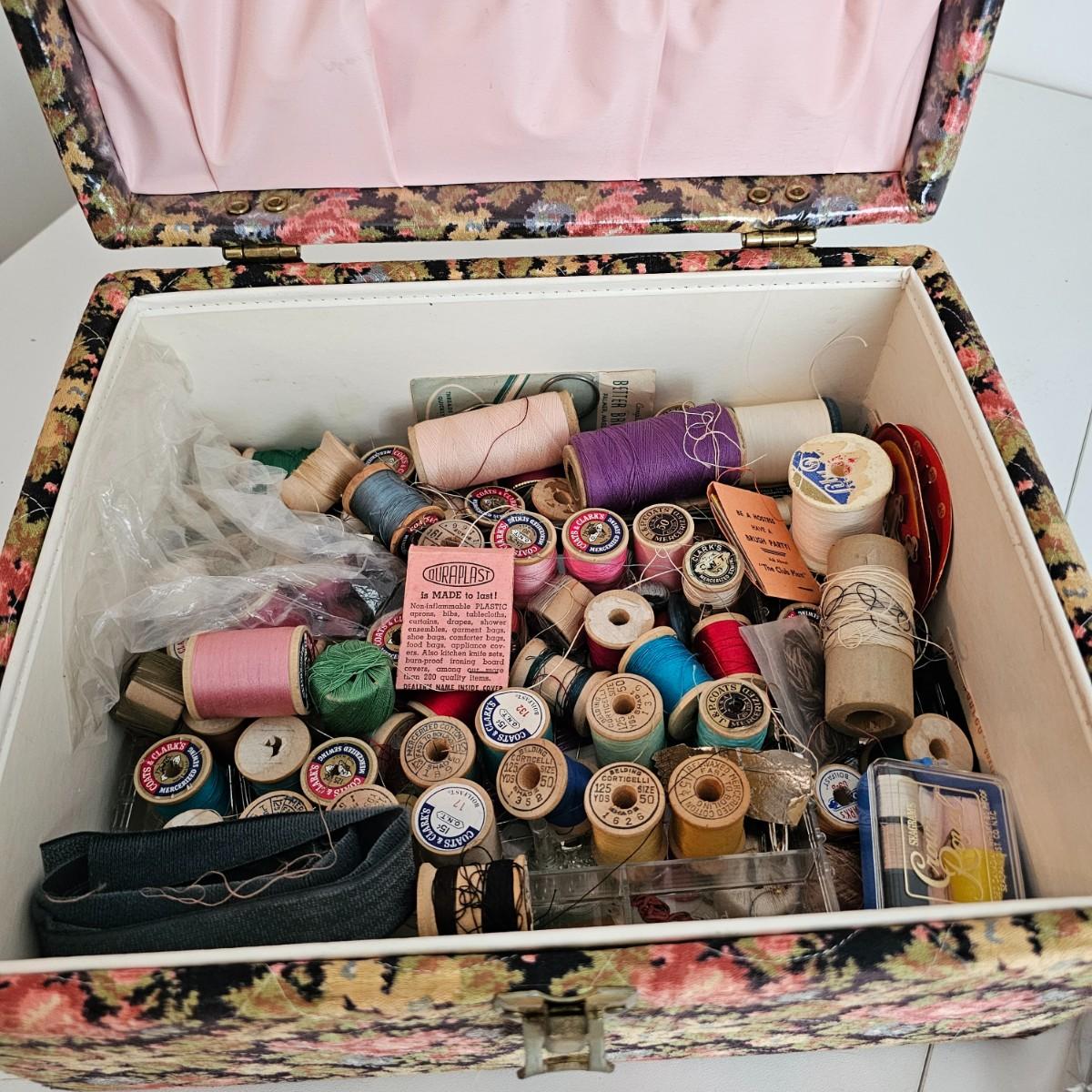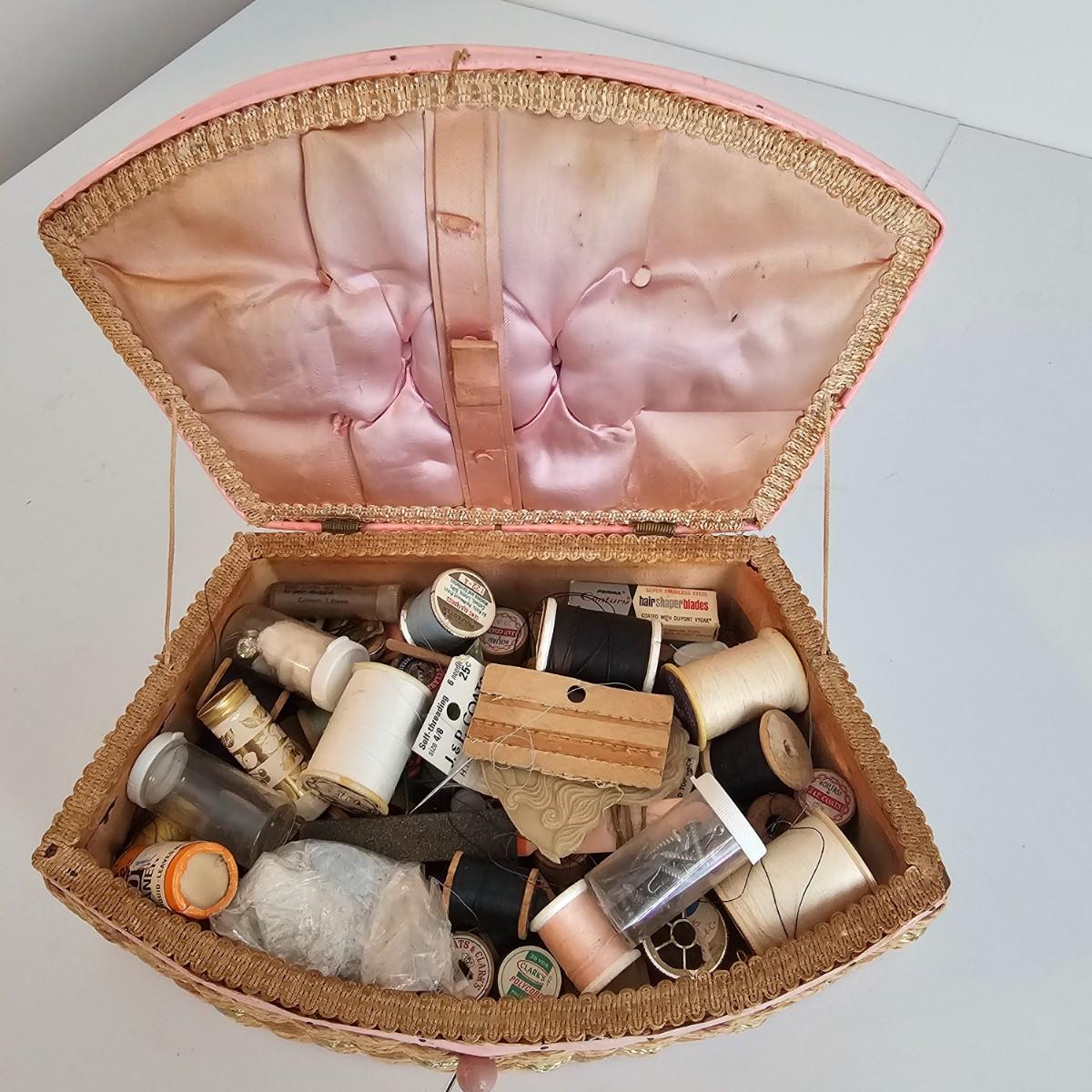 Some old, some newer, these six sewing baskets/boxes are full of accessories. Thread, needles, pins, buttons, ribbons and more. Tall piece on legs measures 14" x 14" x 29"H, has missing pieces on top and sides and bottom of interior drawer is split. Pink unit with drawers is 9" x 12" x 7"H, older wooden caddy with flip sides is 9" x 10" x 10"H, has a pin missing on one door, easily replaced. See photos for details. Local pickup only.