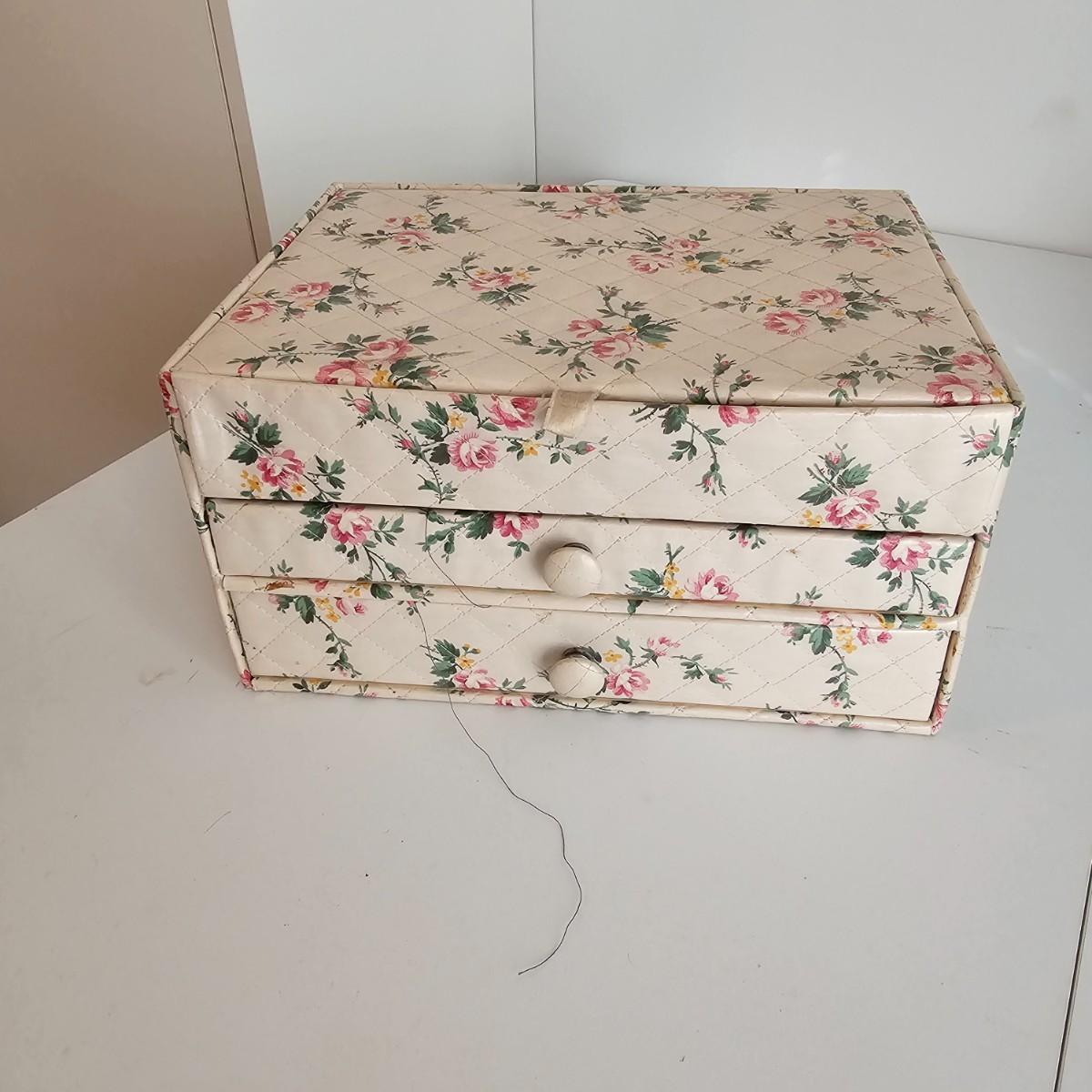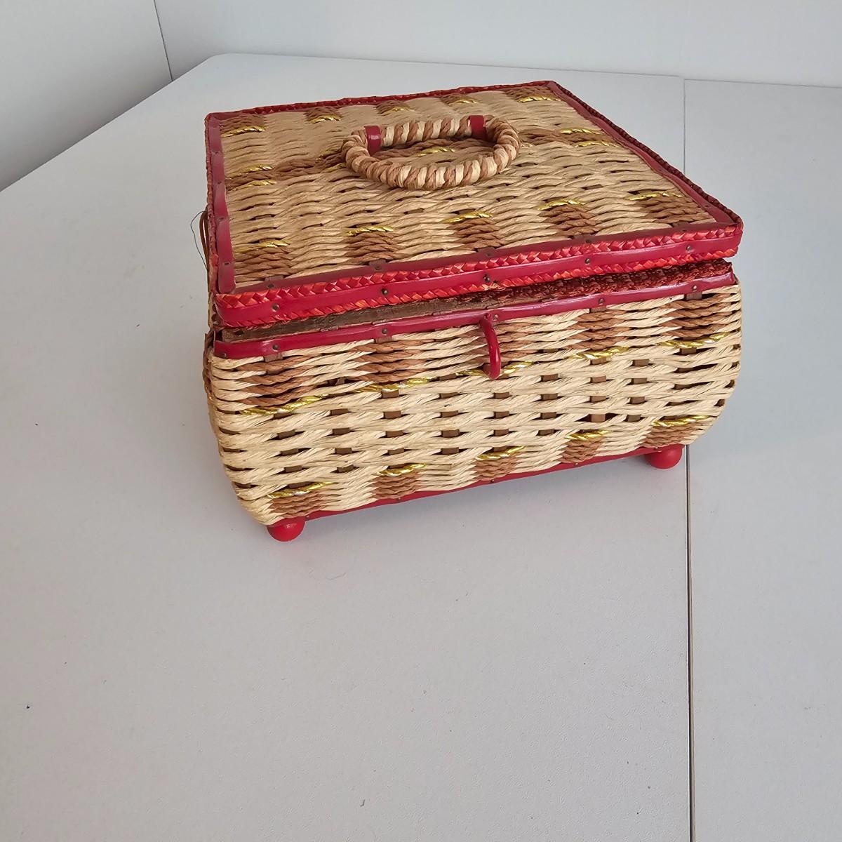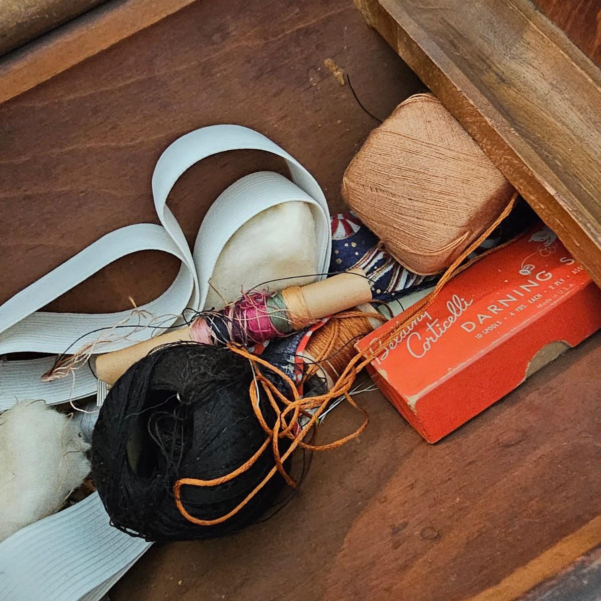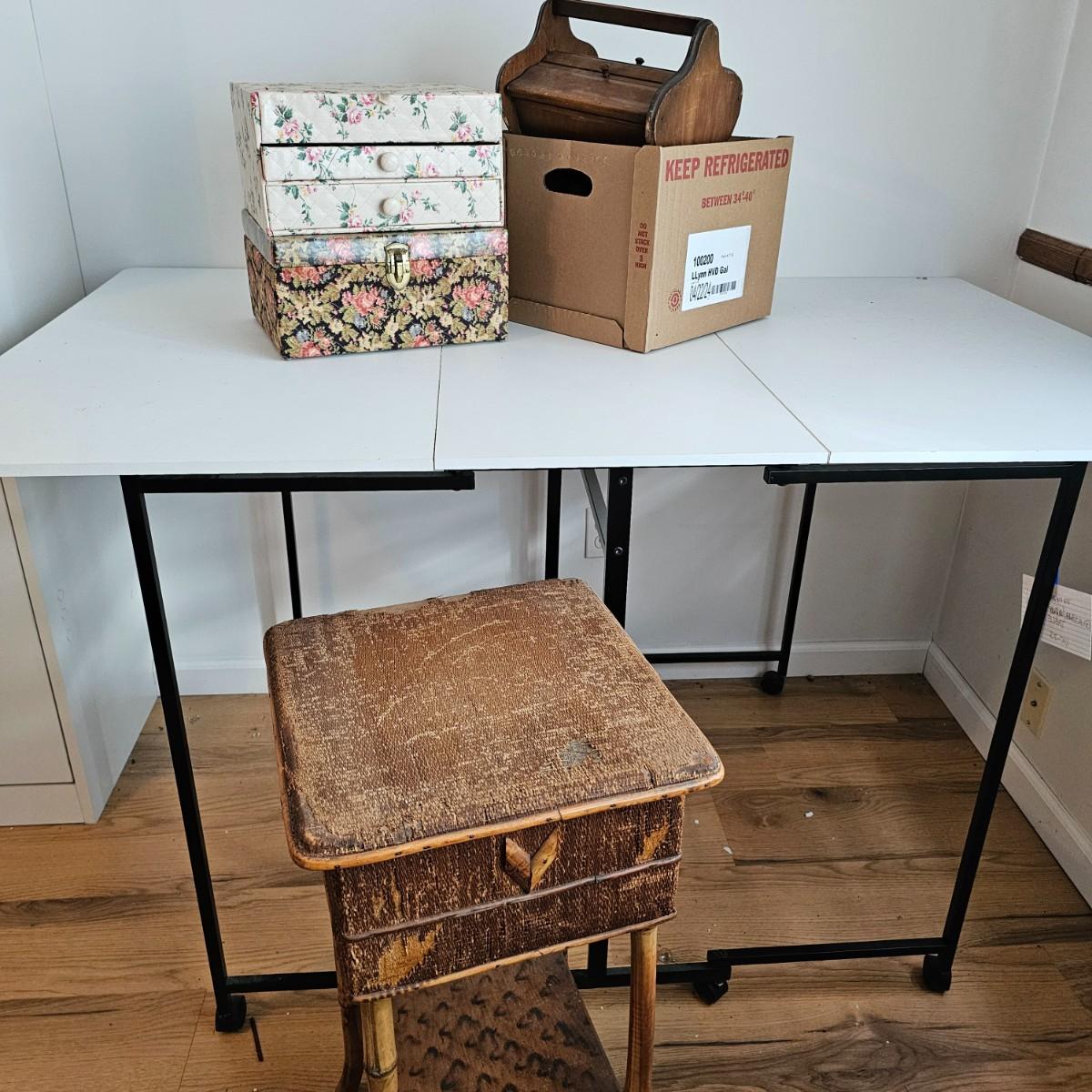 Some old, some newer, these six sewing baskets/boxes are full of accessories. Thread, needles, pins, buttons, ribbons and more. Tall piece on legs measures 14" x 14" x 29"H, has missing pieces on top and sides and bottom of interior drawer is split. Pink unit with drawers is 9" x 12" x 7"H, older wooden caddy with flip sides is 9" x 10" x 10"H, has a pin missing on one door, easily replaced. See photos for details. Local pickup only.
