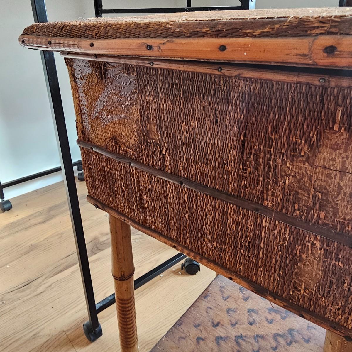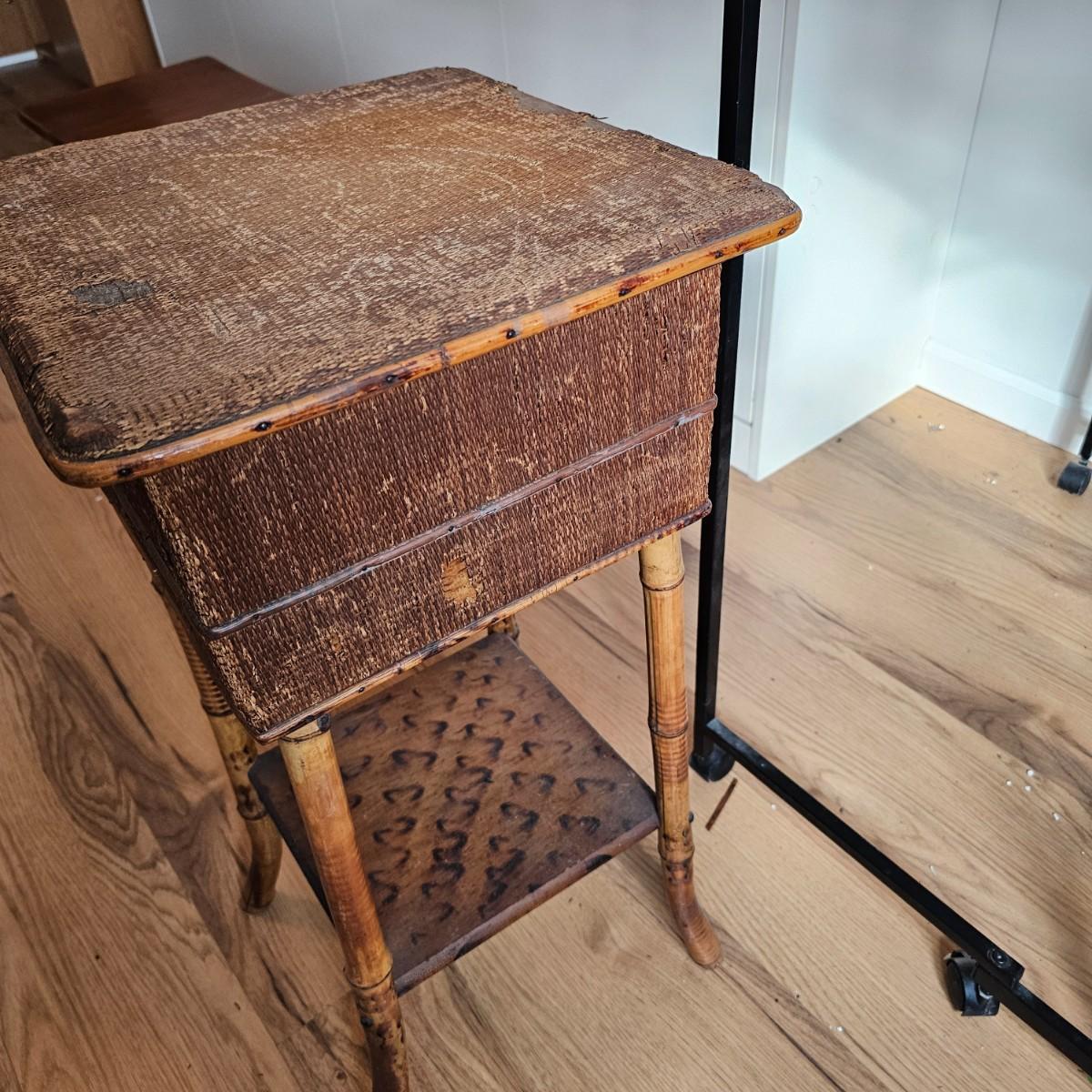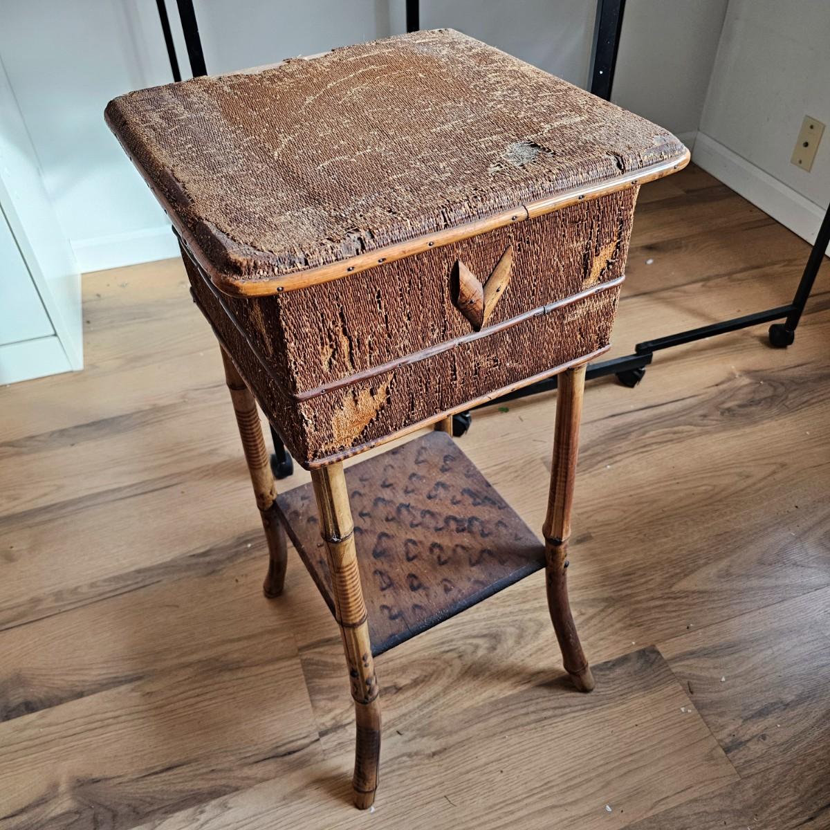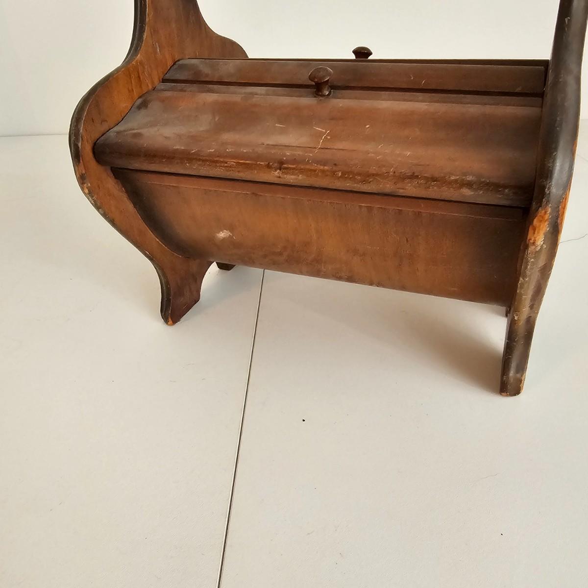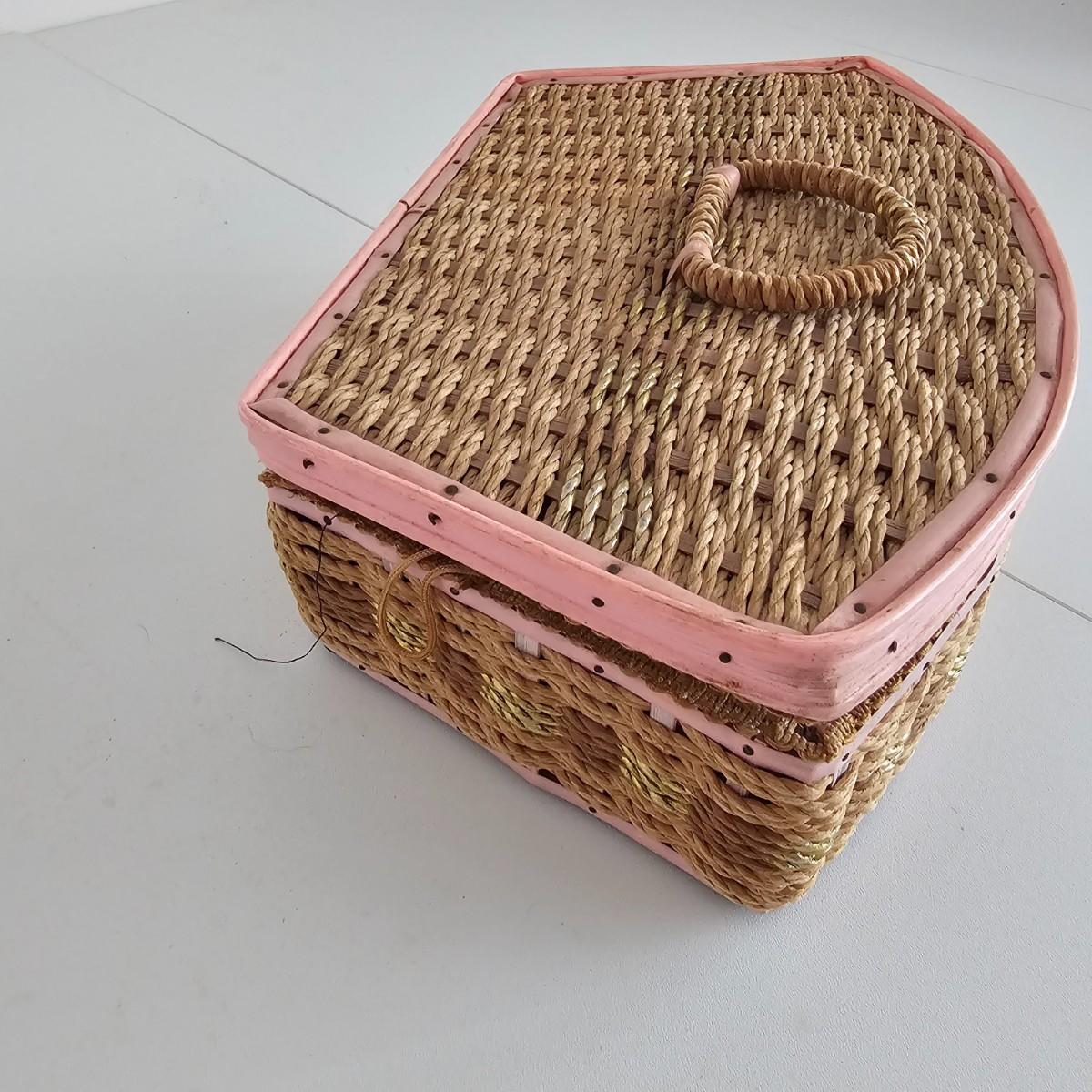 Some old, some newer, these six sewing baskets/boxes are full of accessories. Thread, needles, pins, buttons, ribbons and more. Tall piece on legs measures 14" x 14" x 29"H, has missing pieces on top and sides and bottom of interior drawer is split. Pink unit with drawers is 9" x 12" x 7"H, older wooden caddy with flip sides is 9" x 10" x 10"H, has a pin missing on one door, easily replaced. See photos for details. Local pickup only.
