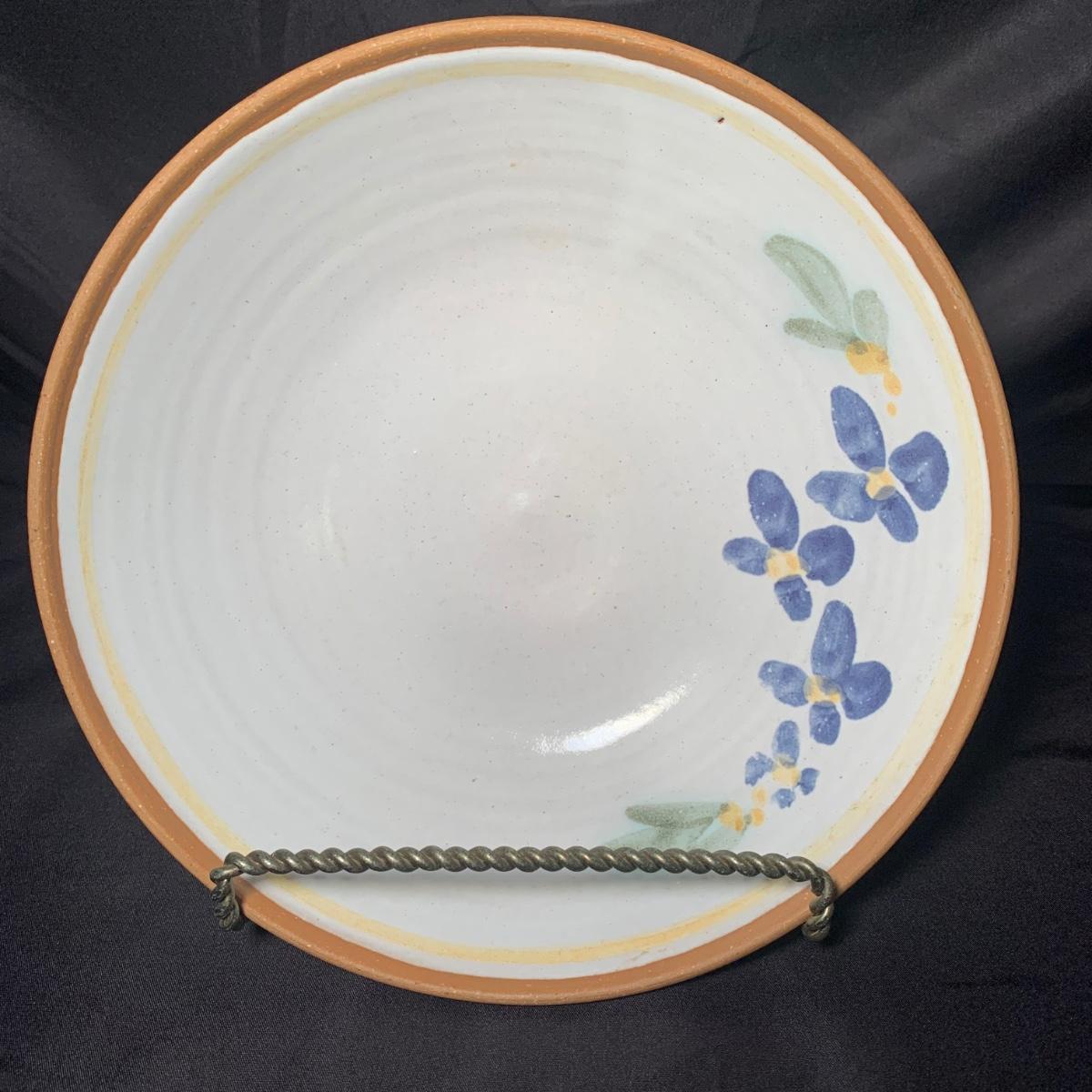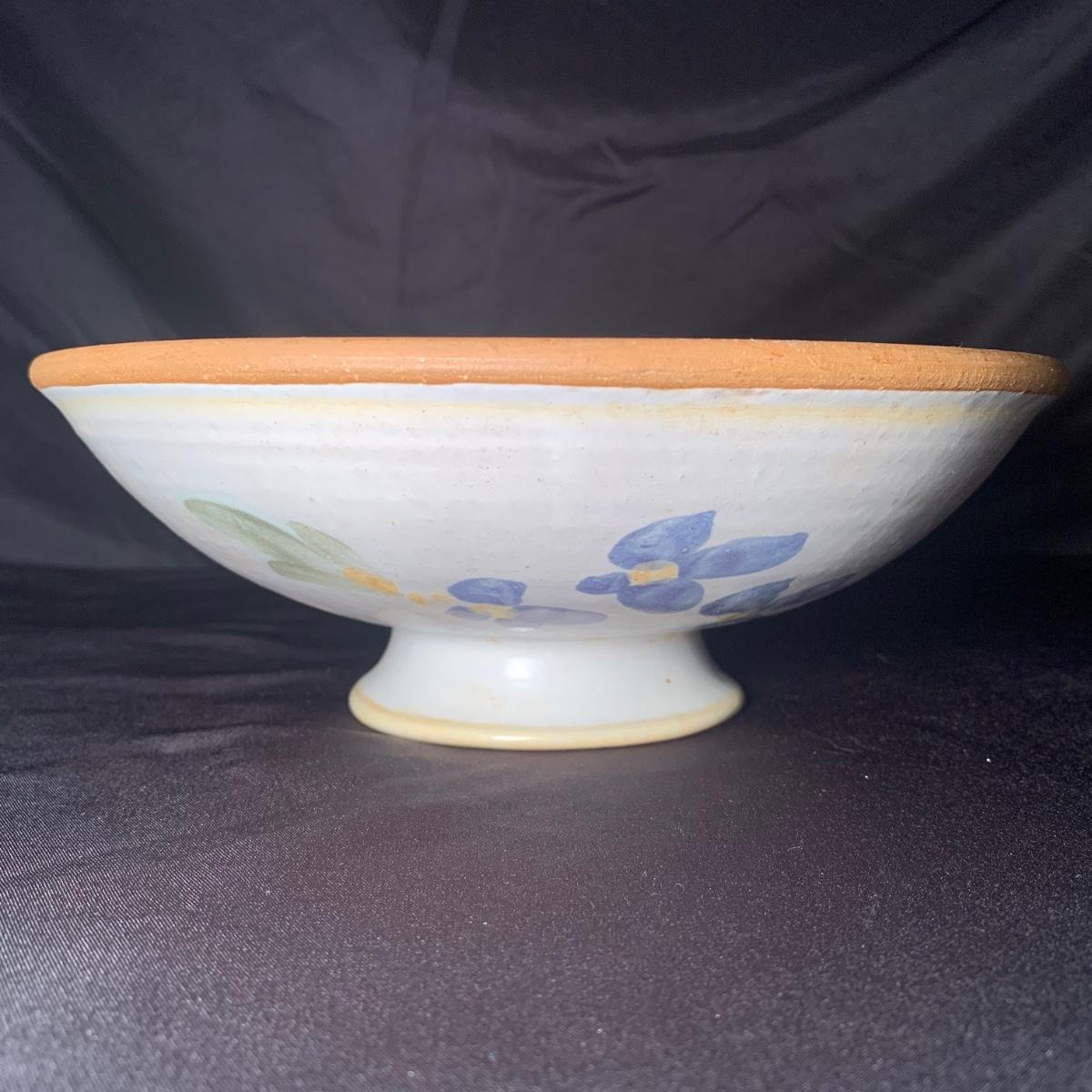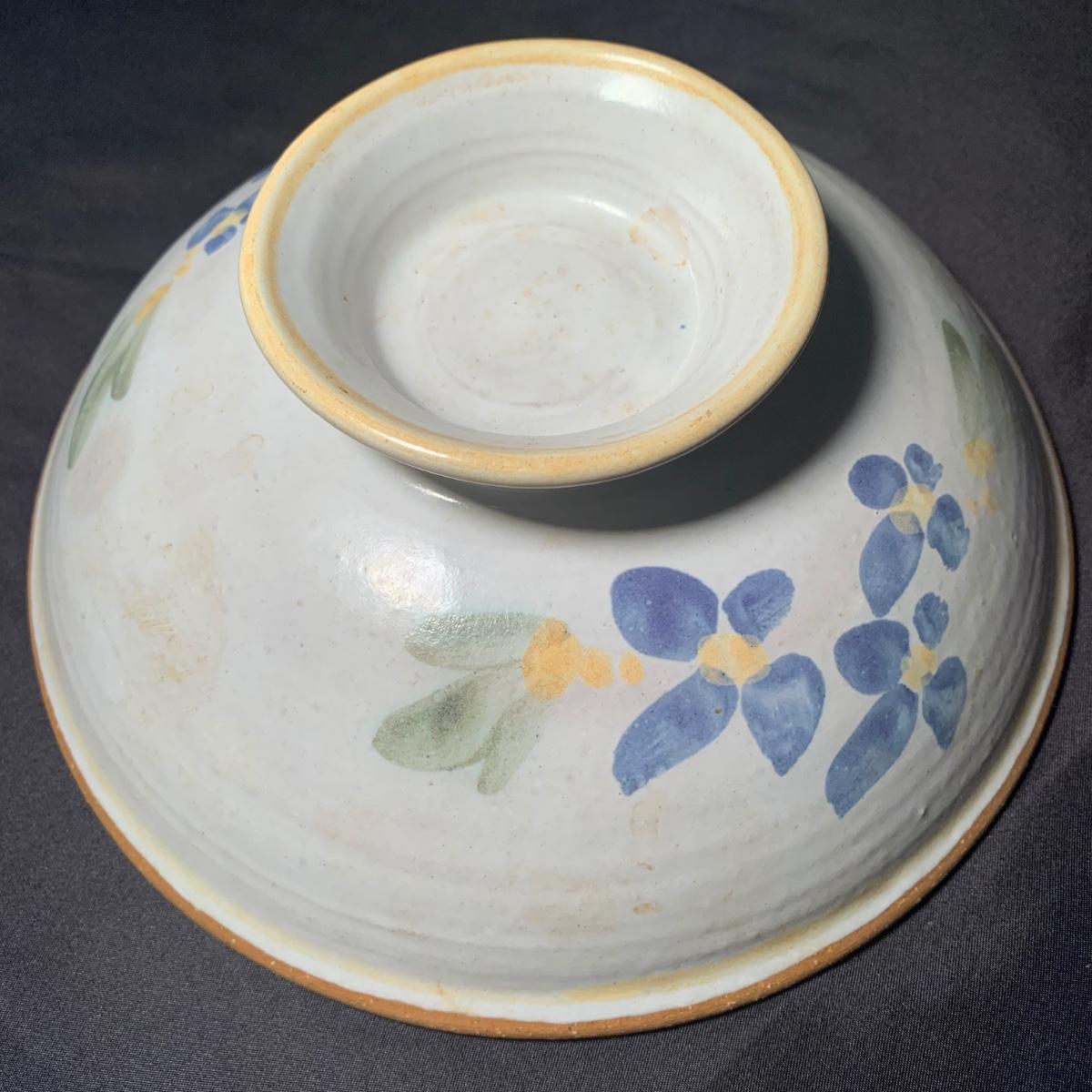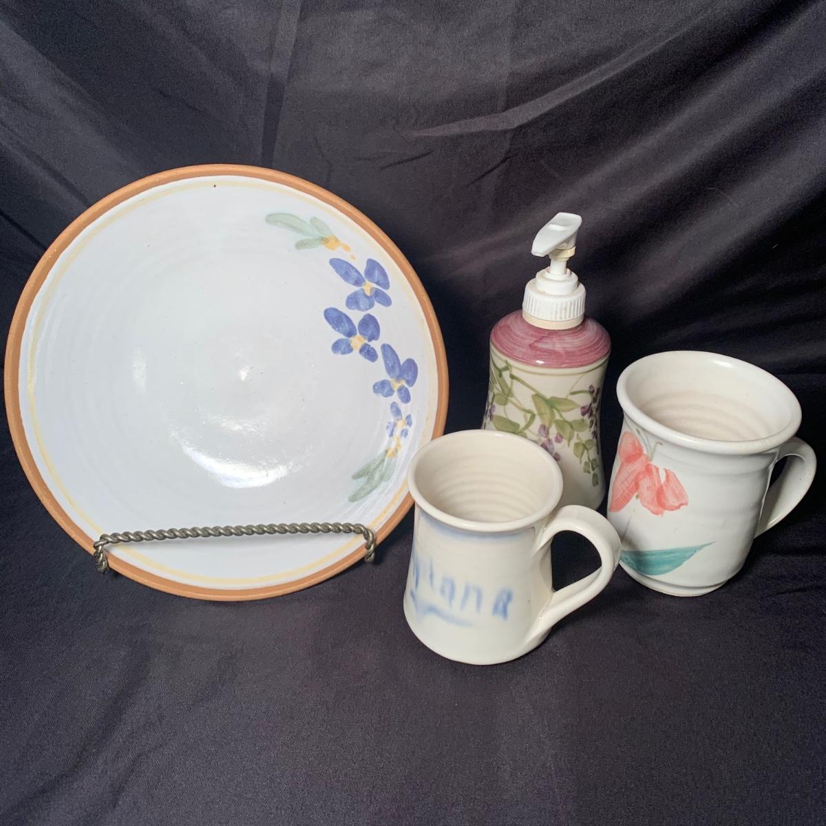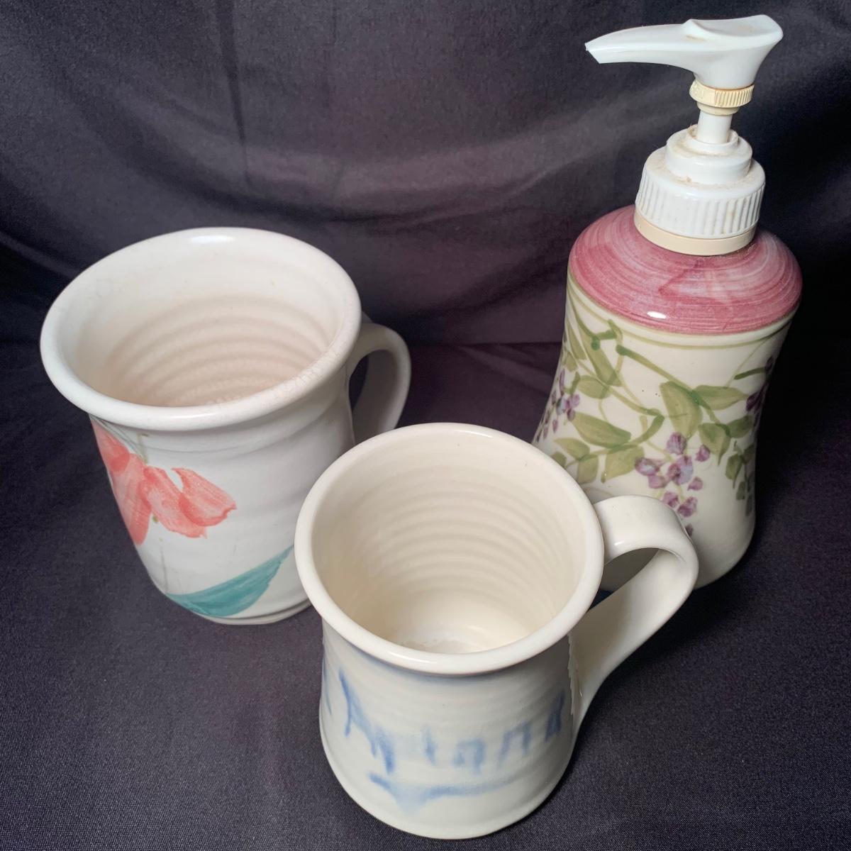 This four piece lot includes two signed ceramic mugs, a handmade soap dispenser, and 8.5”D x 3”H footed bowl. The soap dispenser will need to be cleaned, but is otherwise in good condition. See photos for details.