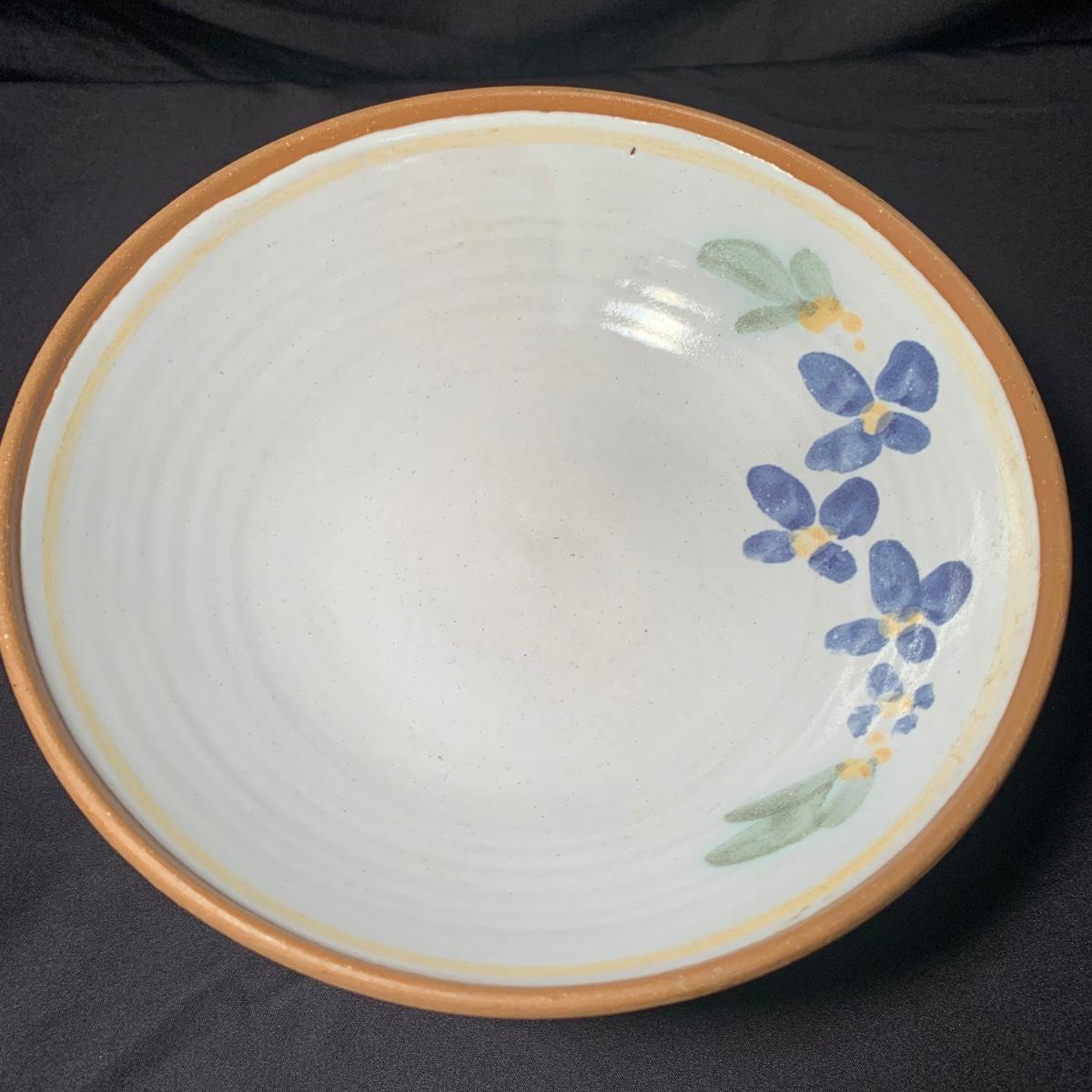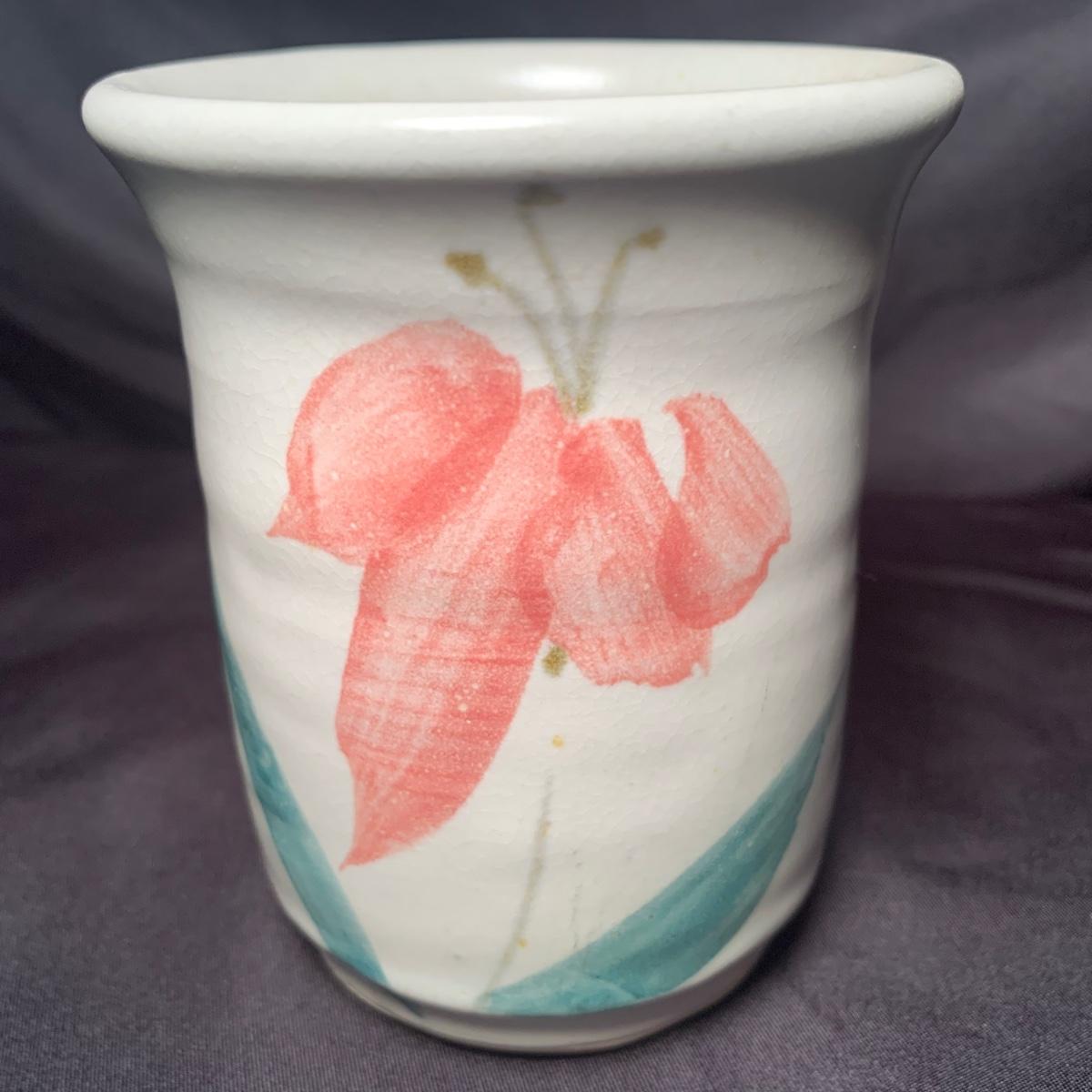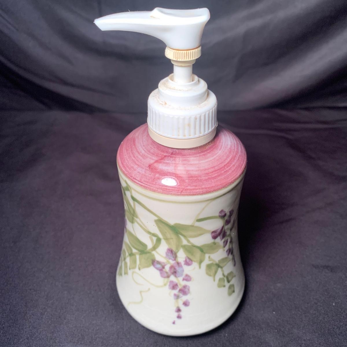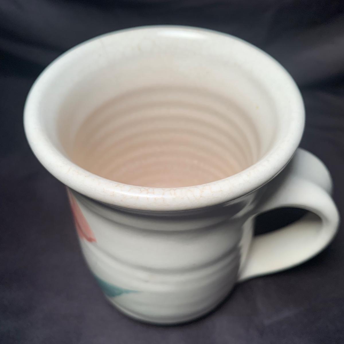 This four piece lot includes two signed ceramic mugs, a handmade soap dispenser, and 8.5”D x 3”H footed bowl. The soap dispenser will need to be cleaned, but is otherwise in good condition. See photos for details.