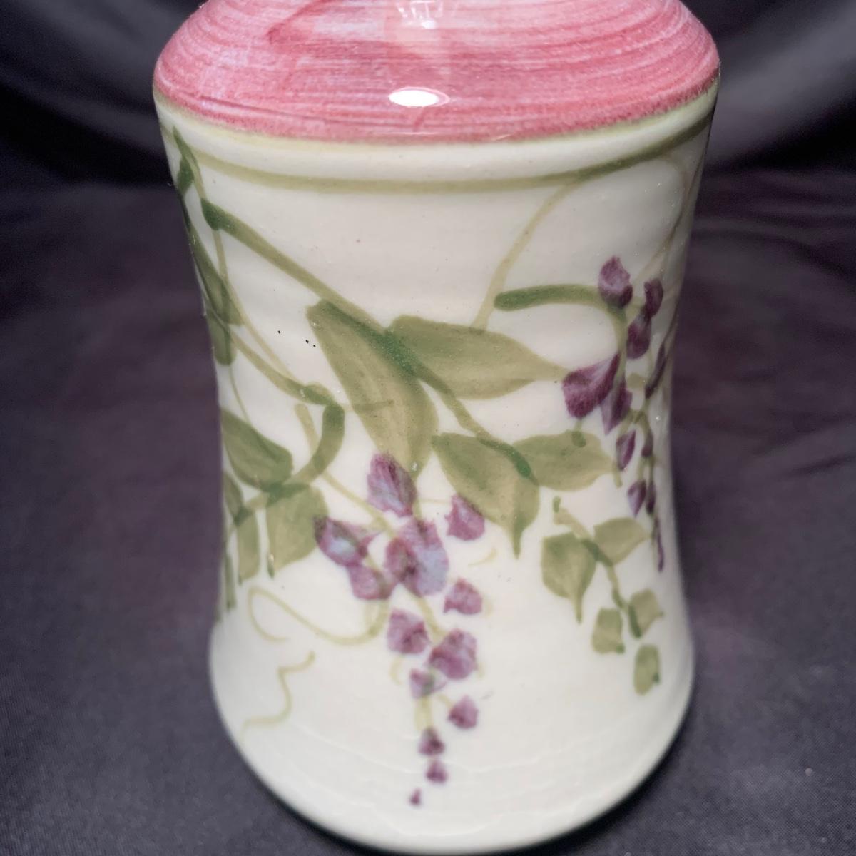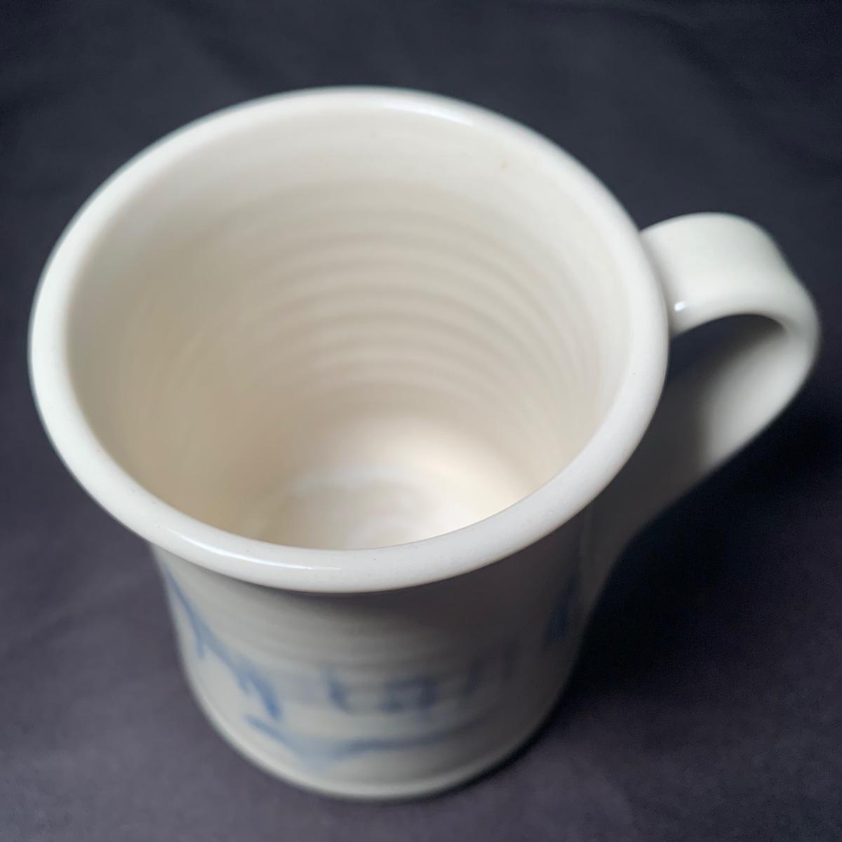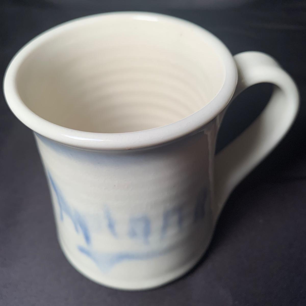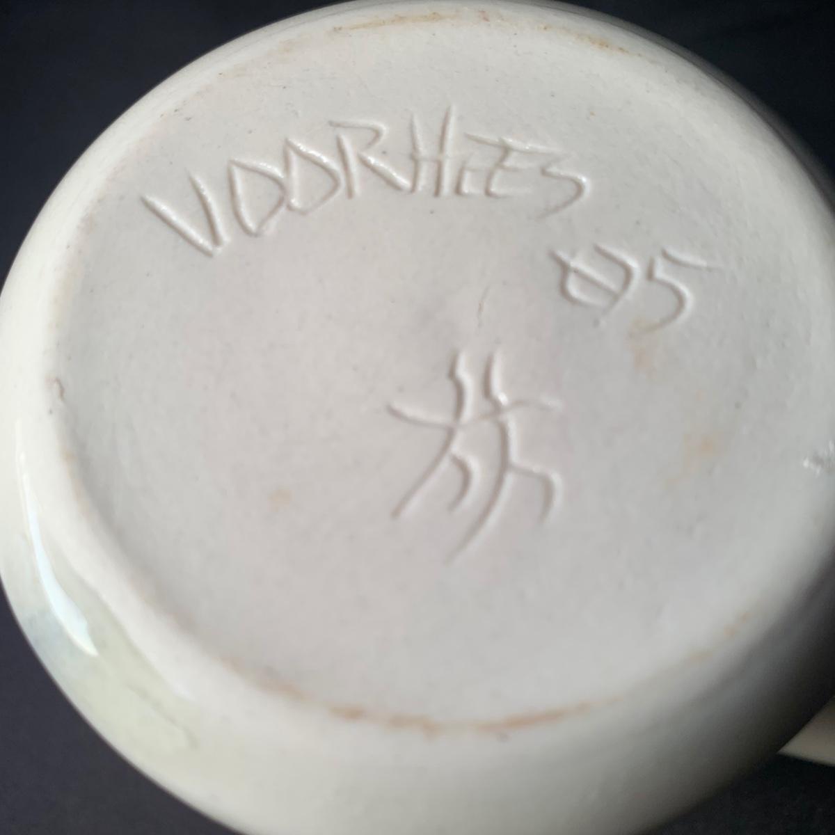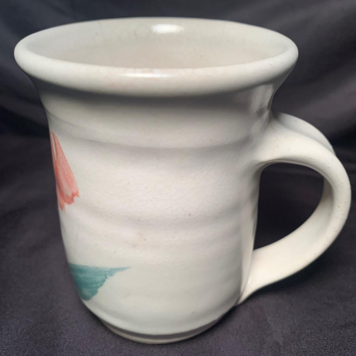 This four piece lot includes two signed ceramic mugs, a handmade soap dispenser, and 8.5”D x 3”H footed bowl. The soap dispenser will need to be cleaned, but is otherwise in good condition. See photos for details.