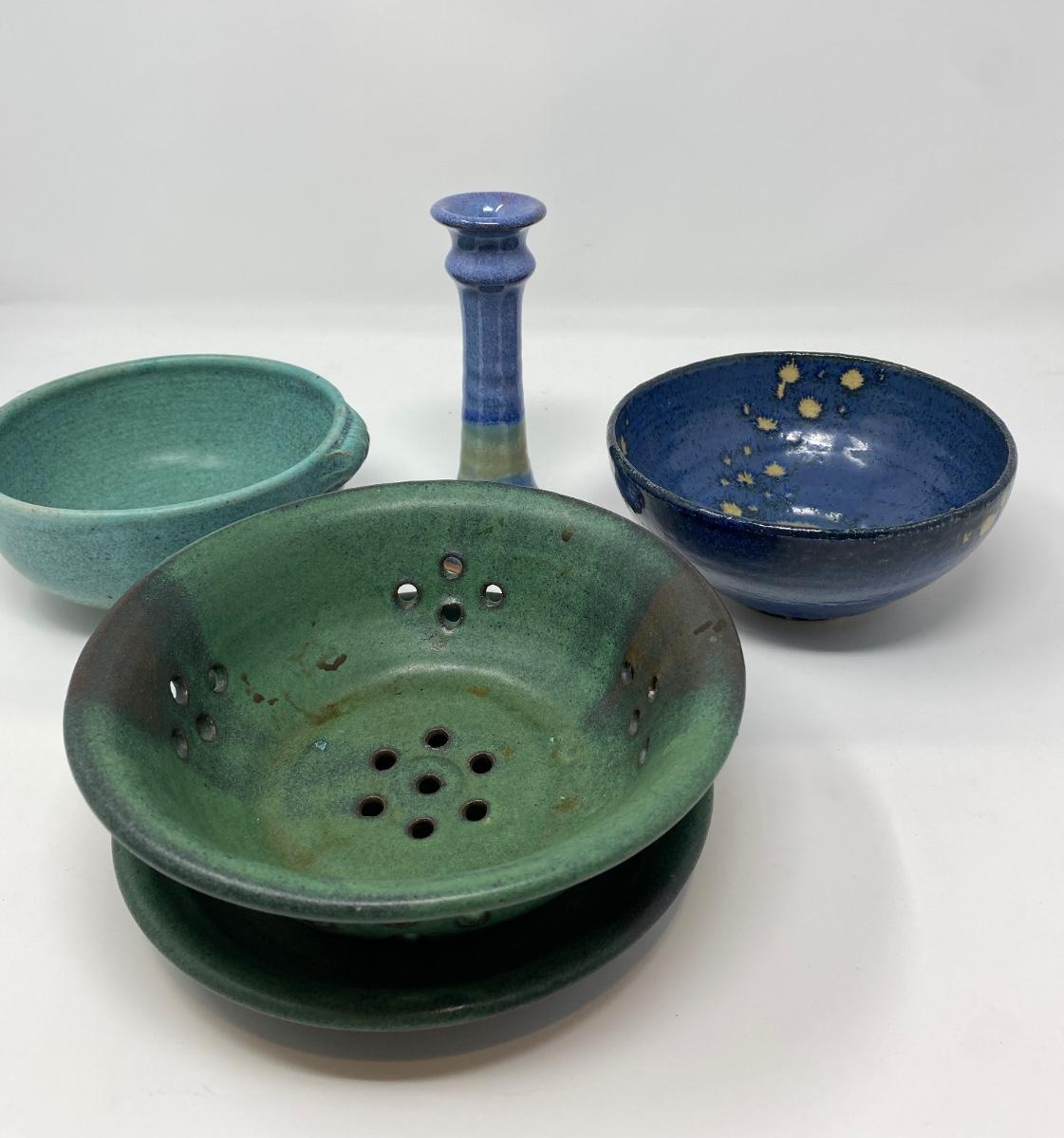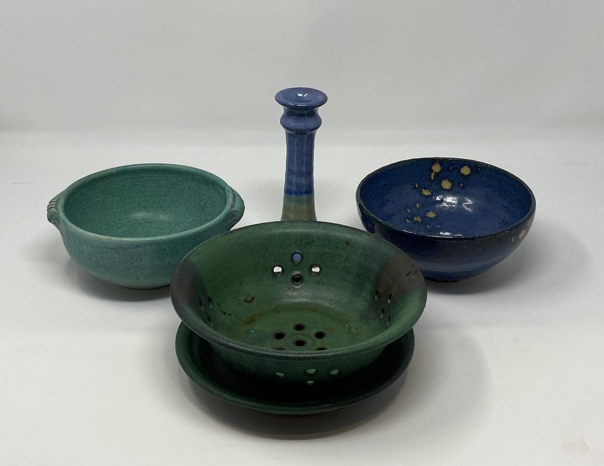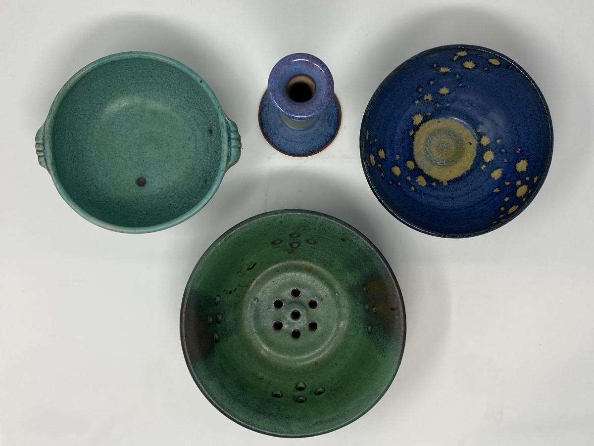 Collection of Signed Studio Pottery. Aqua Bowl with Handles is 6.5in. Green Bowl and Plate with Decorative Cutouts is 7.25in. Cobalt Blue Bowl is 6in. Candlestick Holder is 6in T.