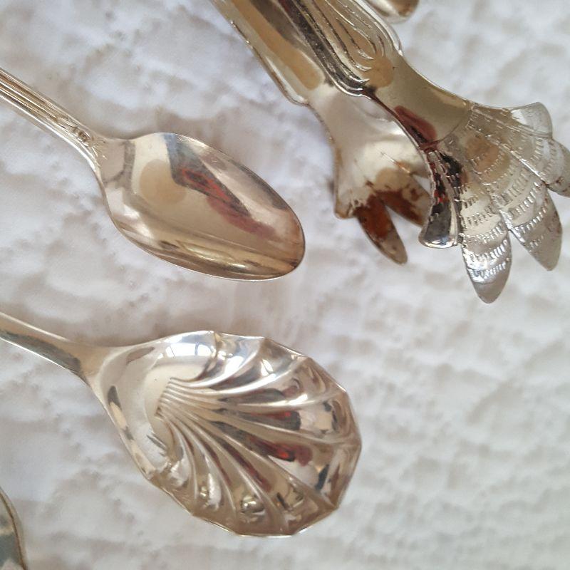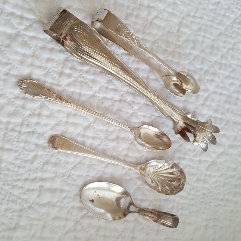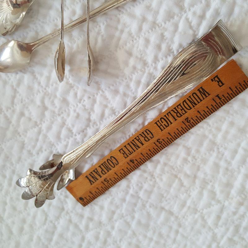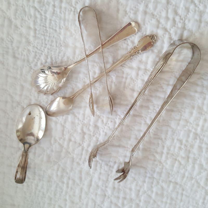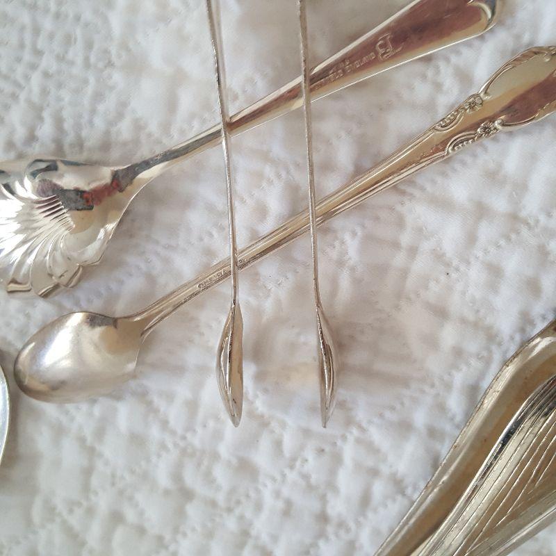 This auction lot is for a Collection of Silverplated Serving Items. Included in this offering are two tongs and three spoons. There is an ice tong and a tong for small items - maybe to pick up an olive or sugar cube. The spoons include one for sugar, another designed to feed a baby or invalid and a small, long spoon that would fit into tiny jars or tins.